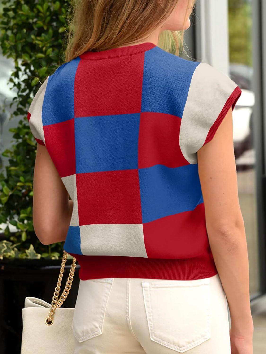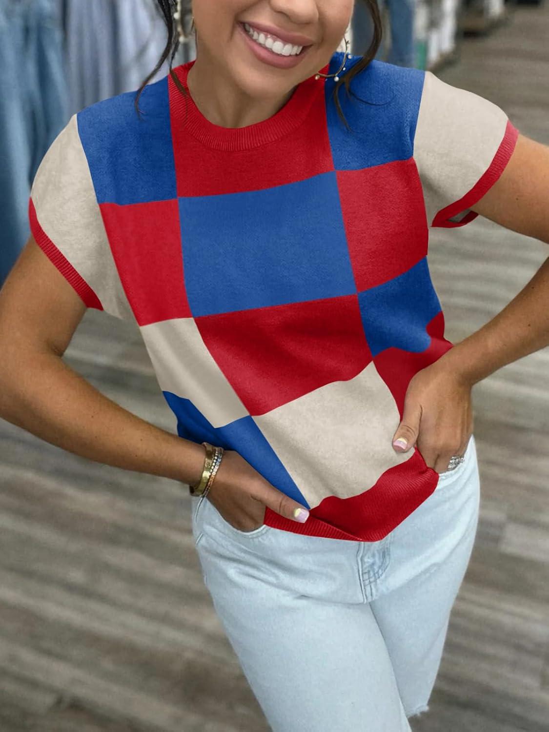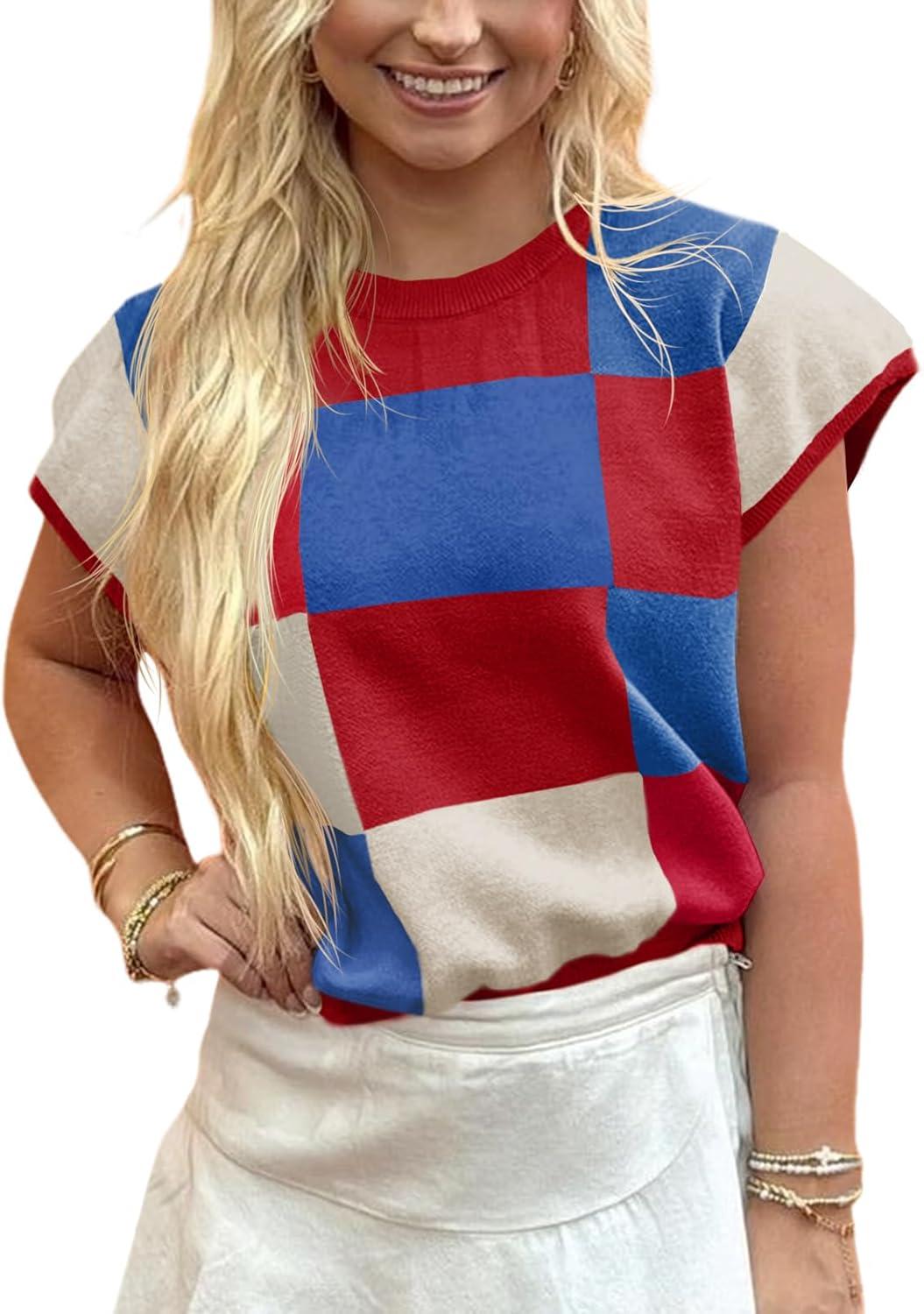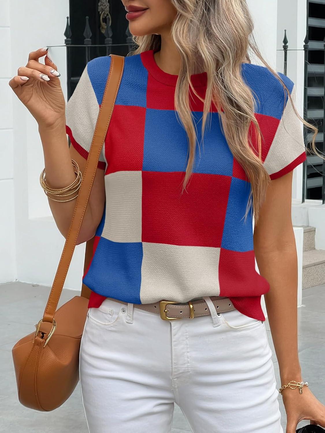 Saodimallsu Womens Short Sleeve Sweater Top Summer Color Block Lightweight Knit Crewneck Going Out Pullover Tops(Red)