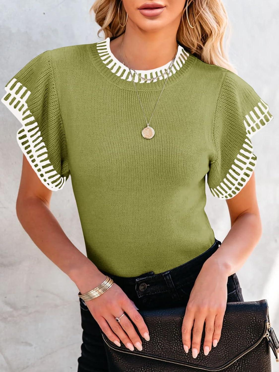 Saodimallsu Womens Short Sleeve Sweaters Tops Summer Ruffle Striped Loose Crew Neck Lightweight Soft Shirts Knit Sweater(Army Green)