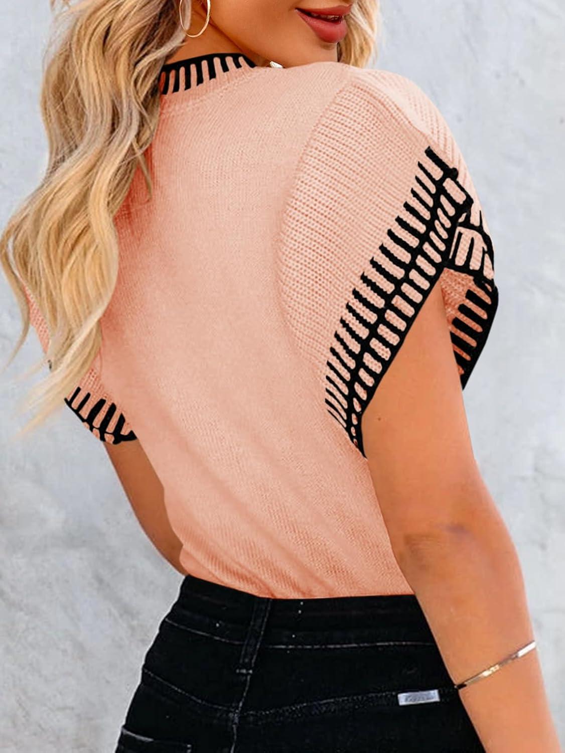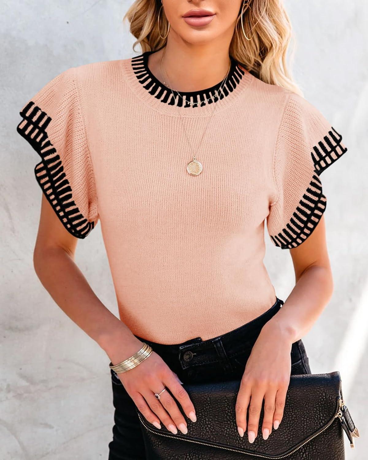 Saodimallsu Womens Short Sleeve Sweaters Tops Summer Ruffle Striped Loose Crew Neck Lightweight Soft Shirts Knit Sweater(Pink)
