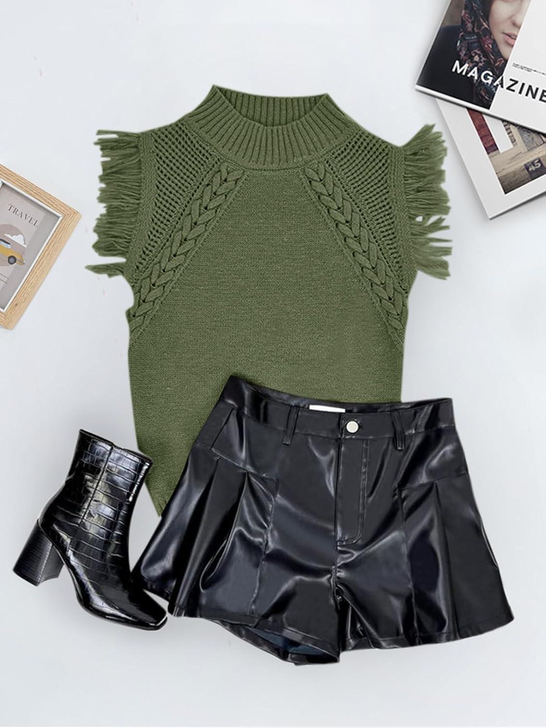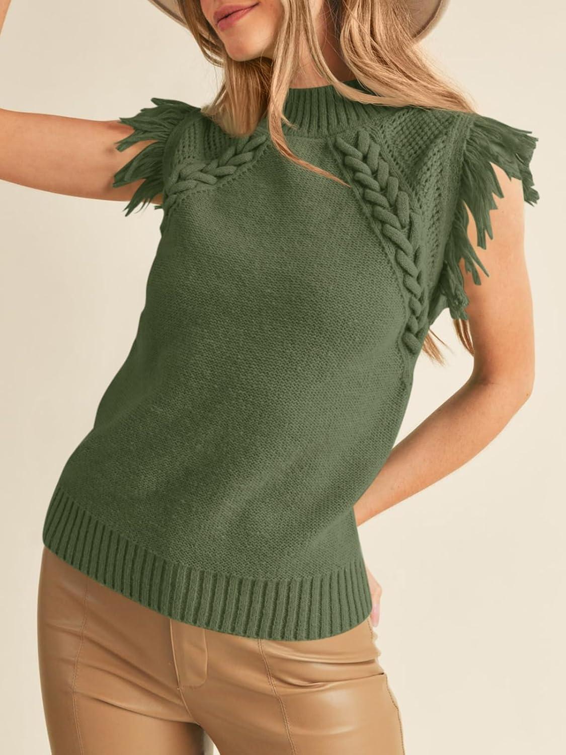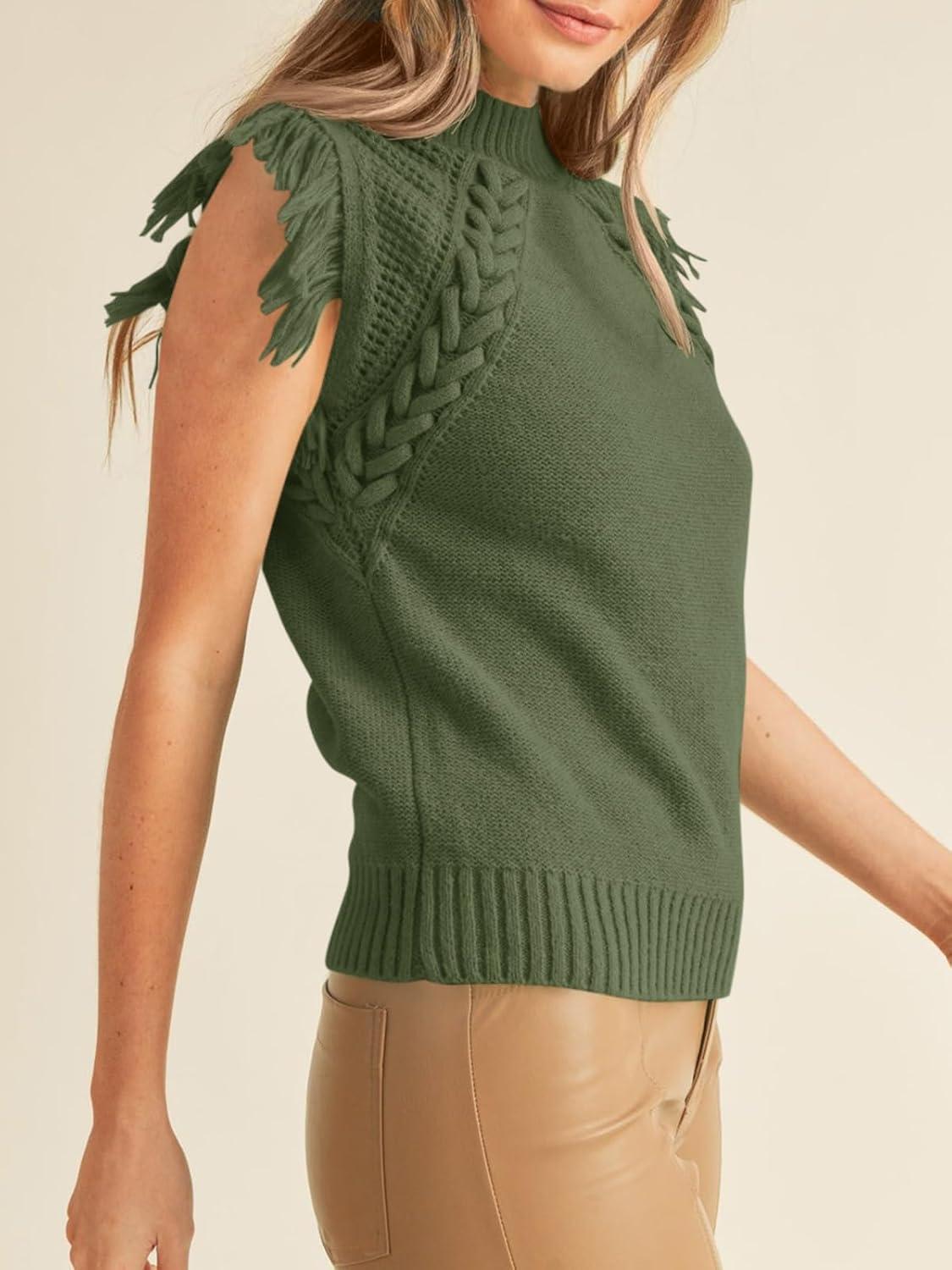 Saodimallsu Womens Sleeveless Sweater Vest Mock Neck Cable Knit Fringe Cap Sleeve Boho Trendy Pullover Tank Tops(Army Green)