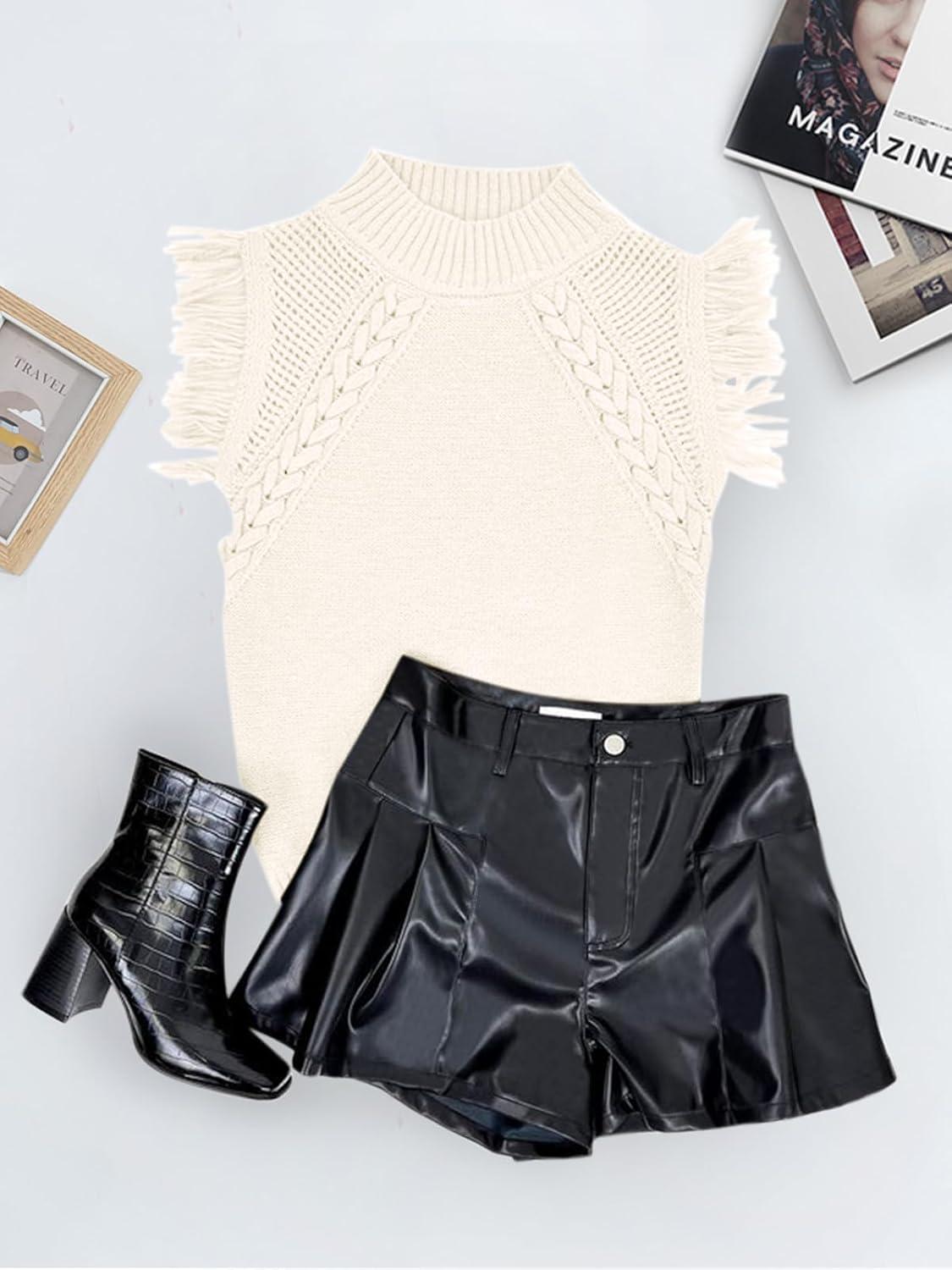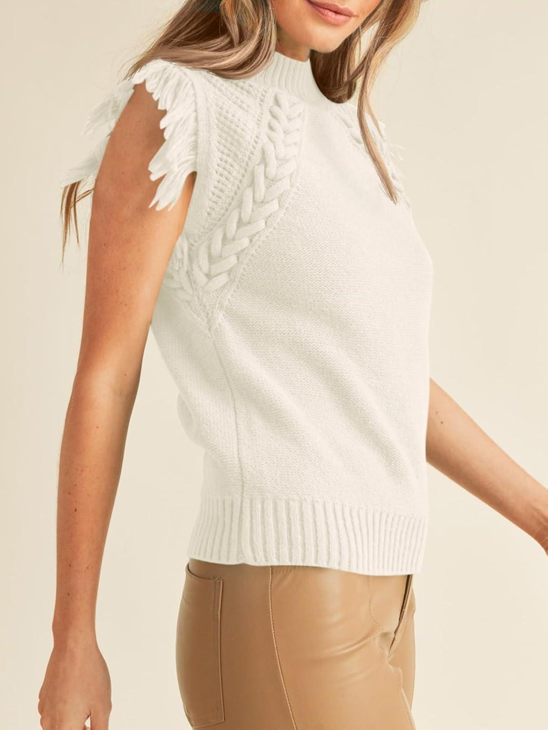 Saodimallsu Womens Sleeveless Sweater Vest Mock Neck Cable Knit Fringe Cap Sleeve Boho Trendy Pullover Tank Tops(Beige)
