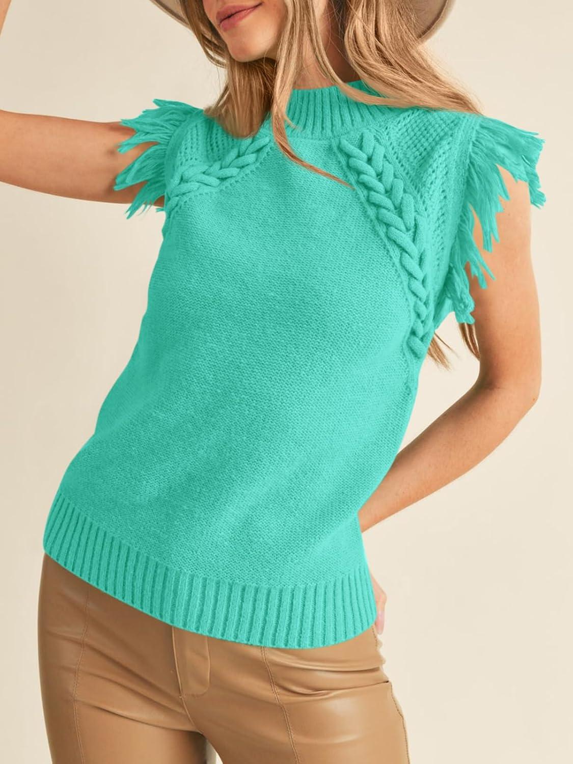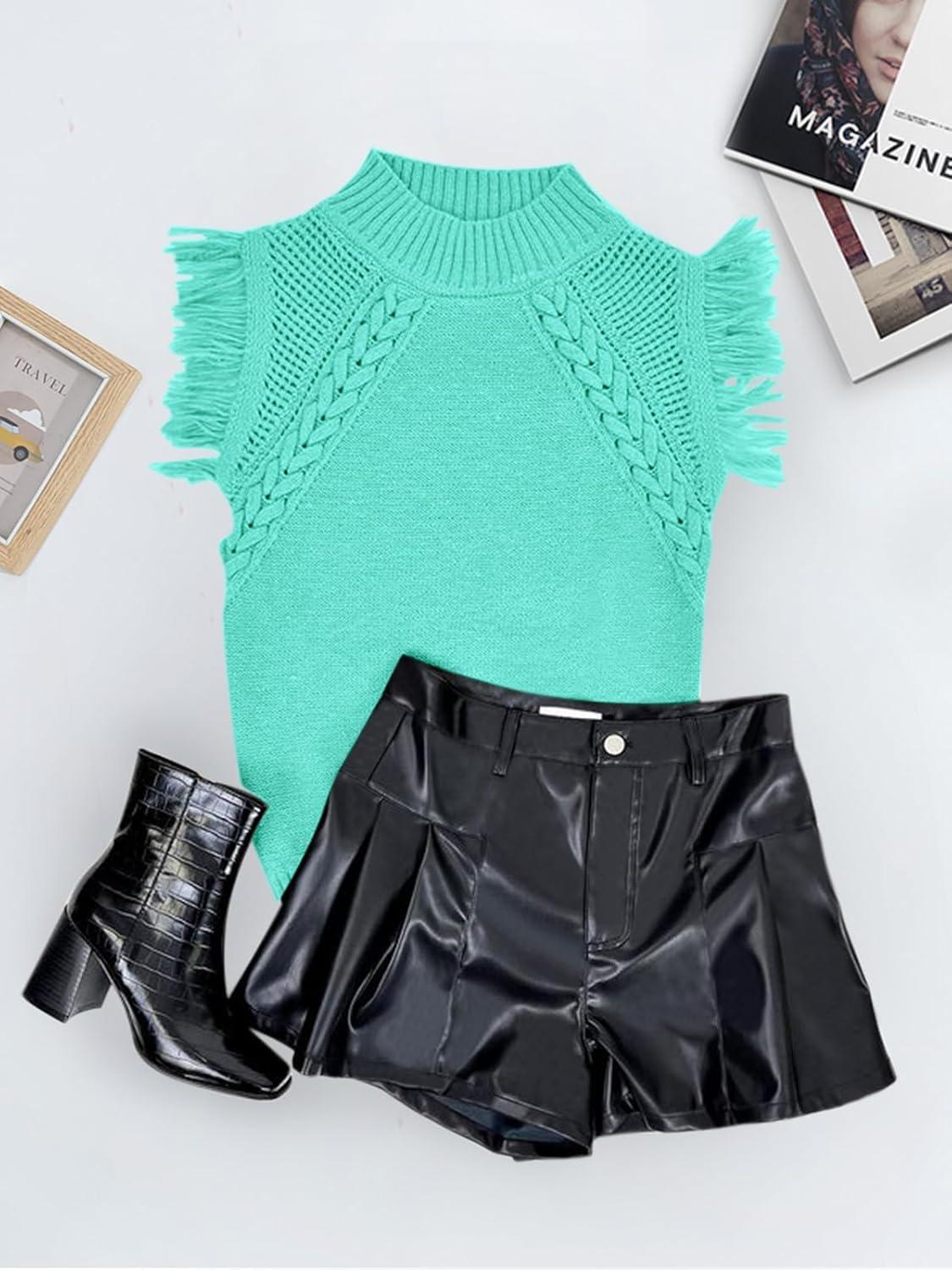 Saodimallsu Womens Sleeveless Sweater Vest Mock Neck Cable Knit Fringe Cap Sleeve Boho Trendy Pullover Tank Tops(Light Green)