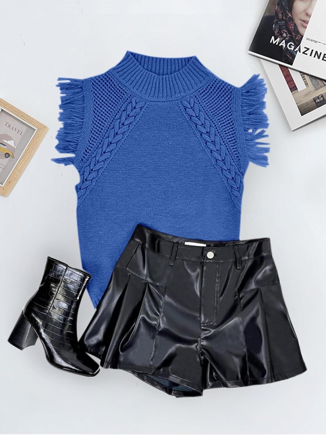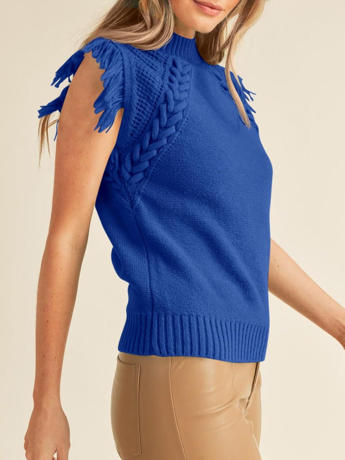 Saodimallsu Womens Sleeveless Sweater Vest Mock Neck Cable Knit Fringe Cap Sleeve Boho Trendy Pullover Tank Tops(Navy)