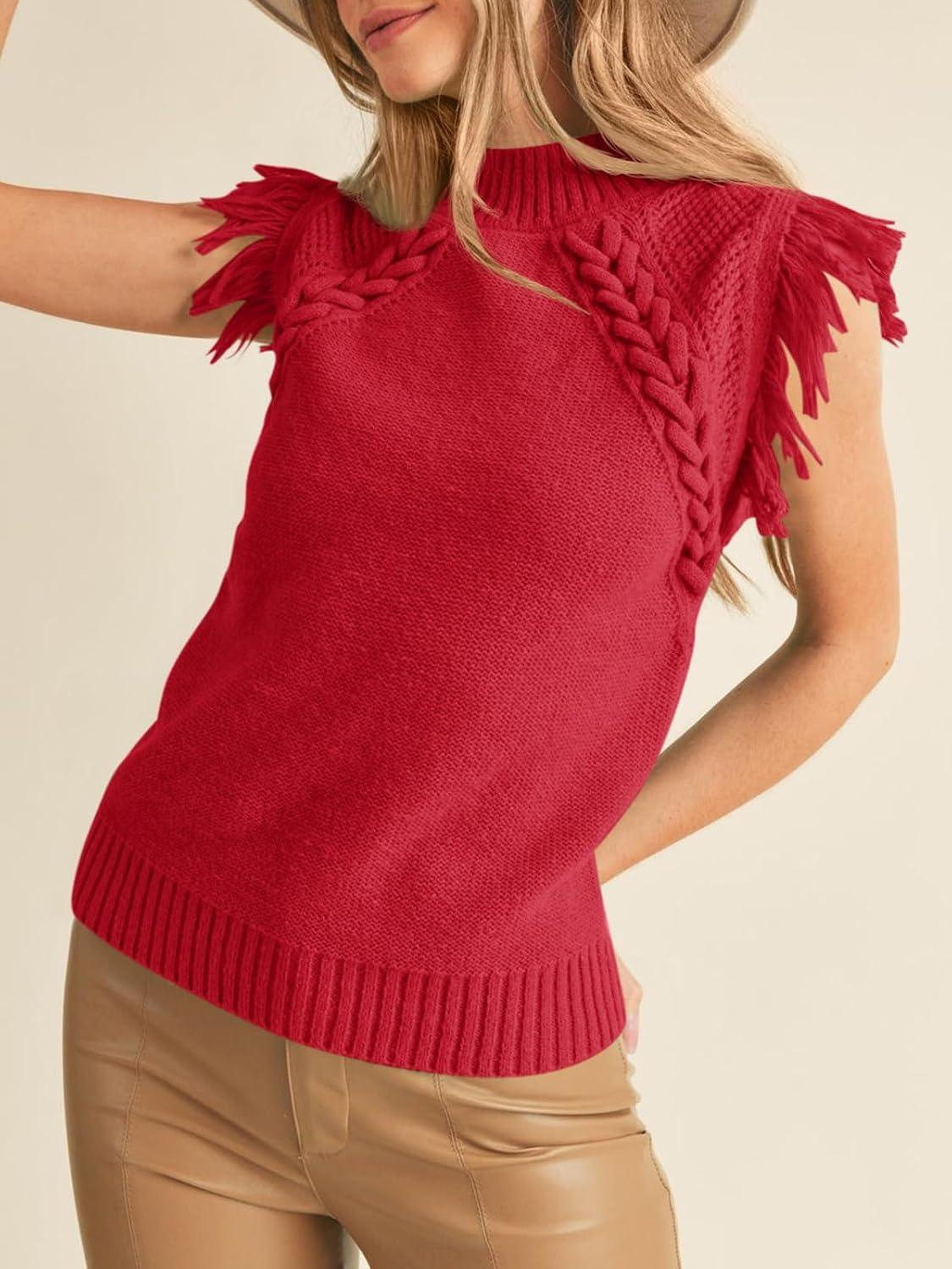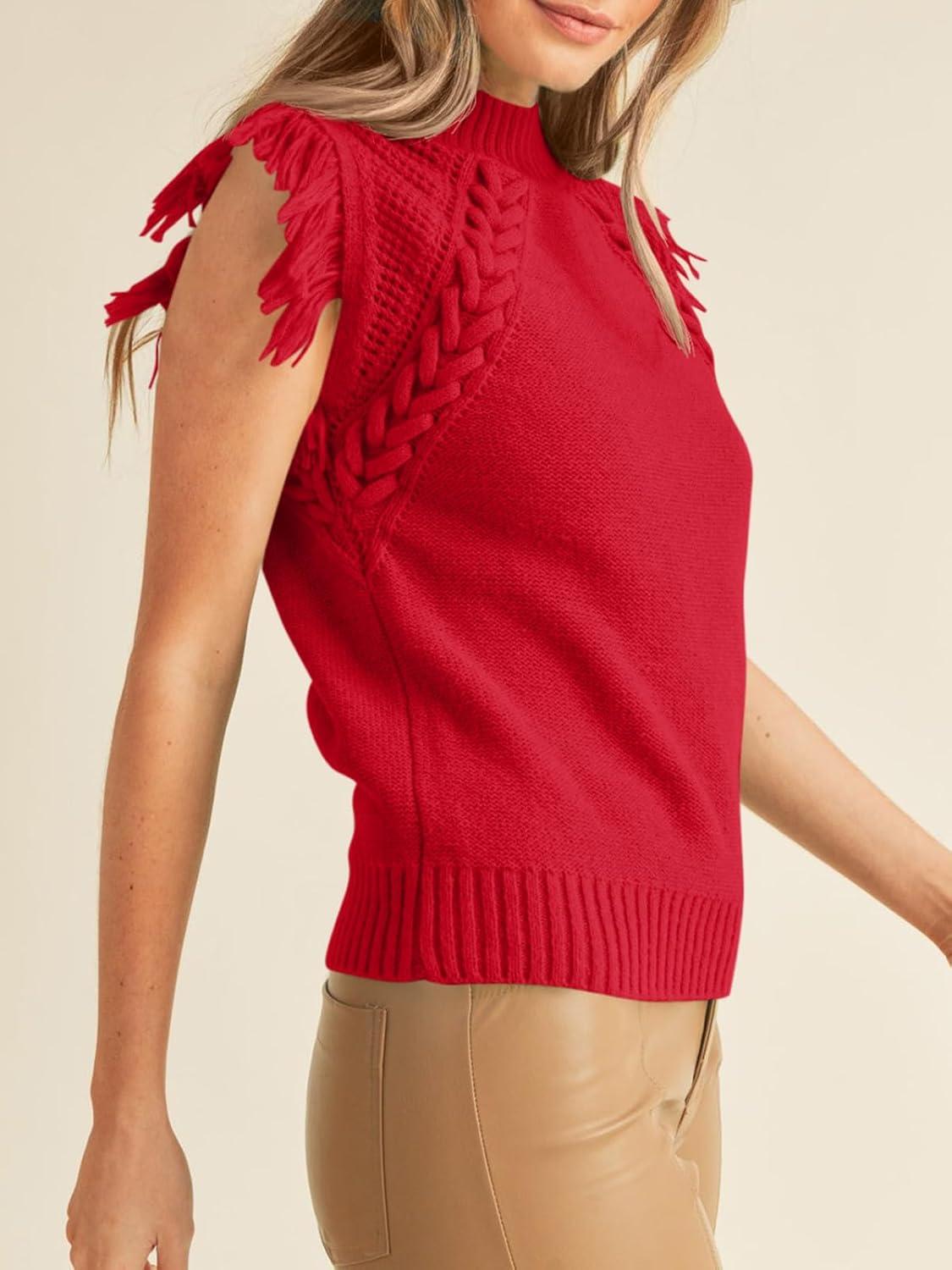 Saodimallsu Womens Sleeveless Sweater Vest Mock Neck Cable Knit Fringe Cap Sleeve Boho Trendy Pullover Tank Tops(Red)