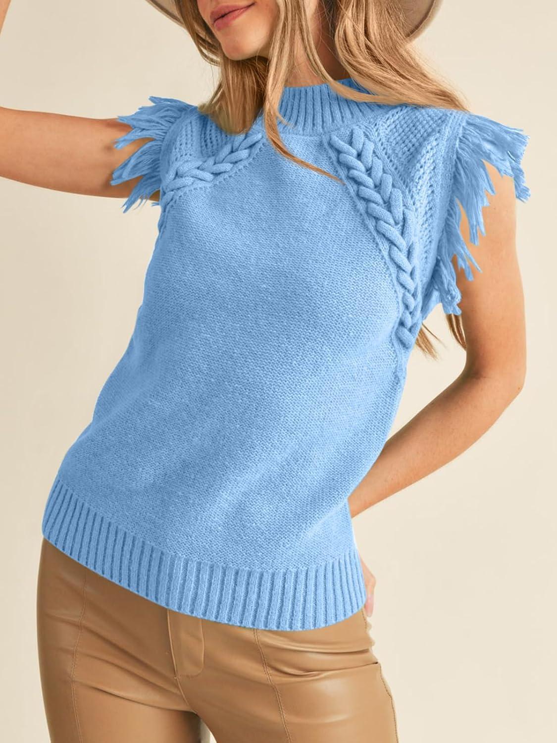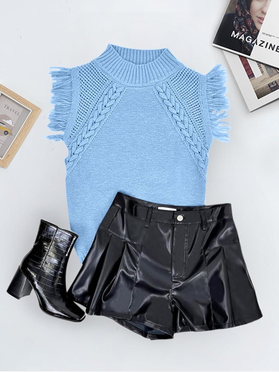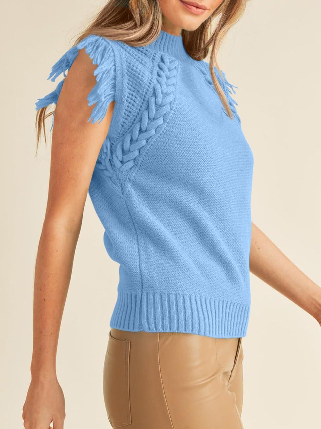 Saodimallsu Womens Sleeveless Sweater Vest Mock Neck Cable Knit Fringe Cap Sleeve Boho Trendy Pullover Tank Tops(Sky Blue)