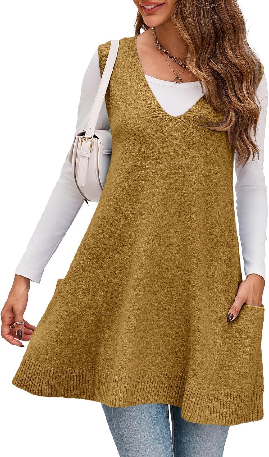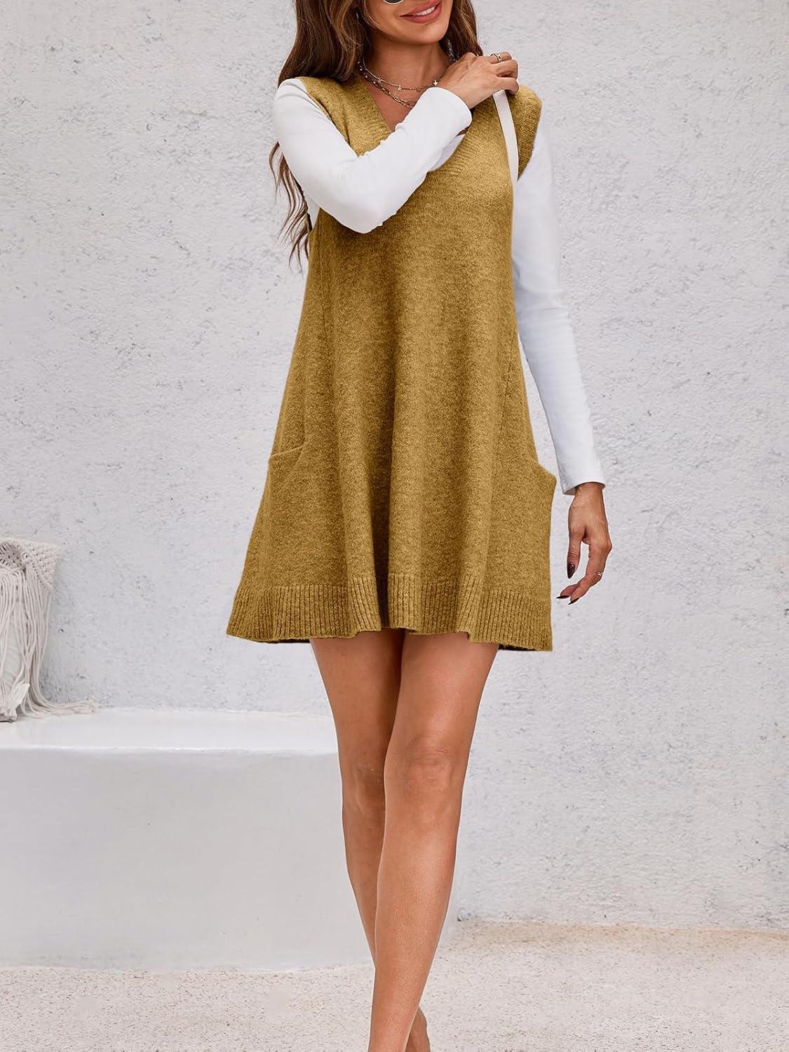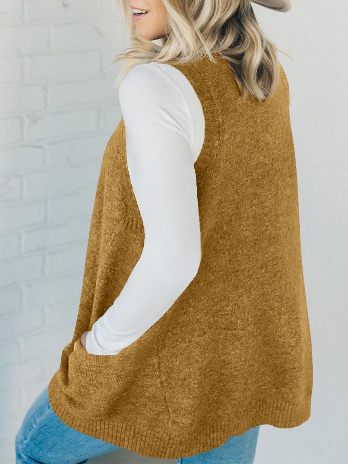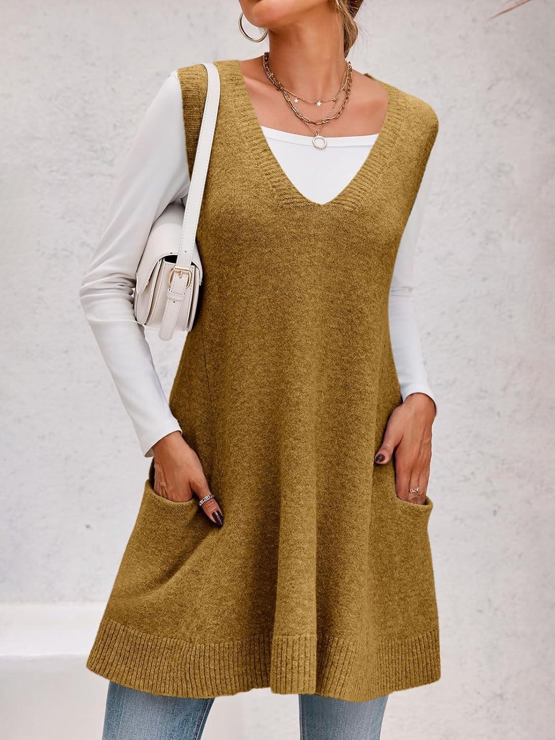 Saodimallsu Womens Sleeveless Sweater Vest V Neck Casual Loose Knit A Line Flattering Tunic Top with Pockets(Dark Yellow)