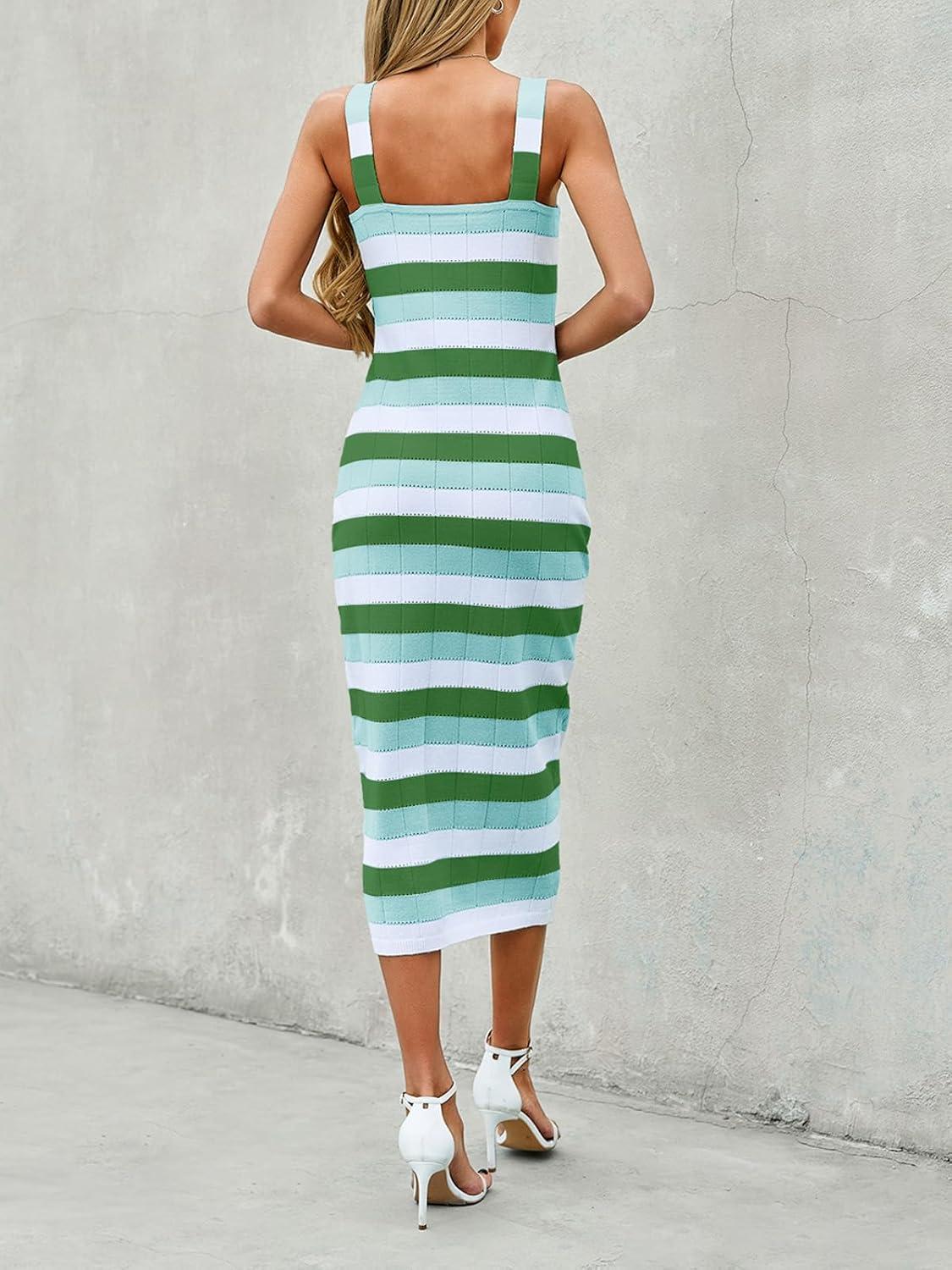 Saodimallsu Womens Striped Bodycon Midi Dress Sleeveless Square Neck Color Block Knit Summer Tank Dresses(Green)