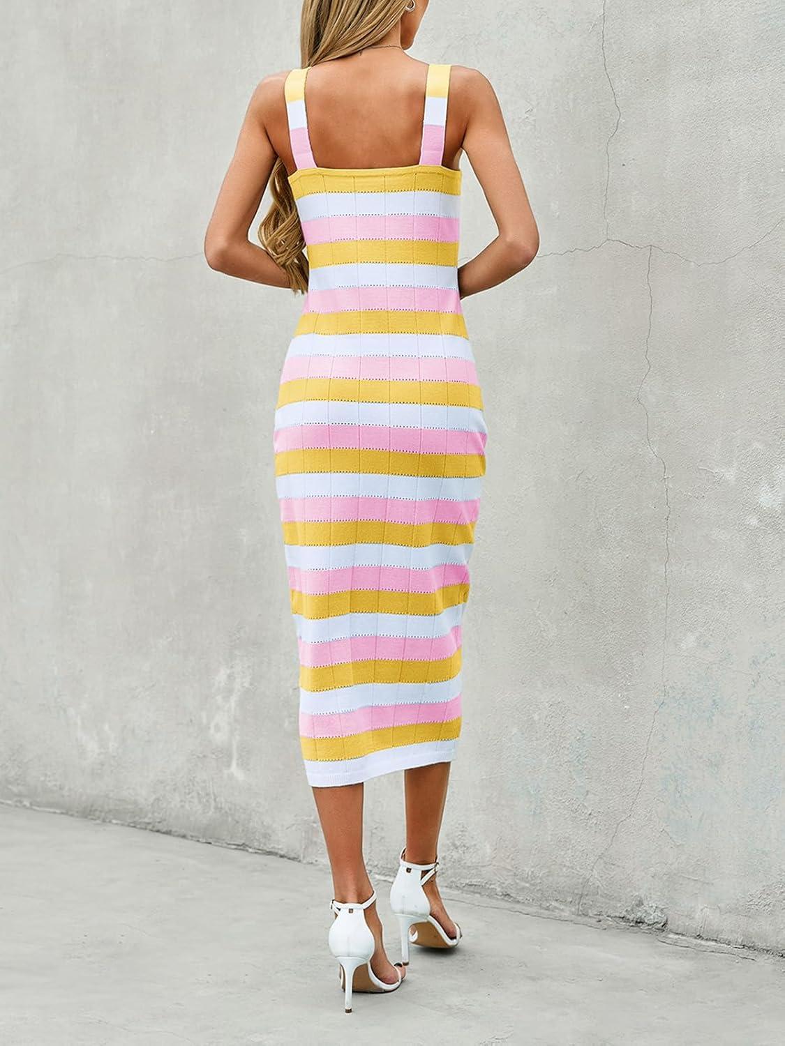 Saodimallsu Womens Striped Bodycon Midi Dress Sleeveless Square Neck Color Block Knit Summer Tank Dresses(Yellow)