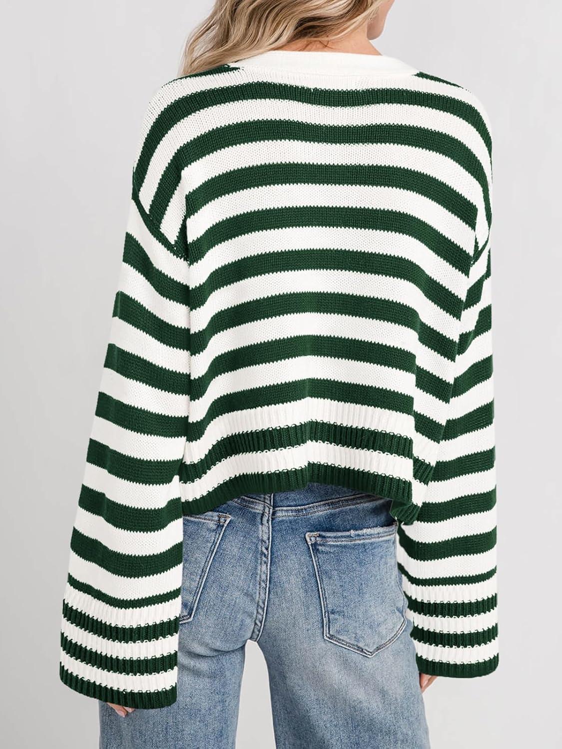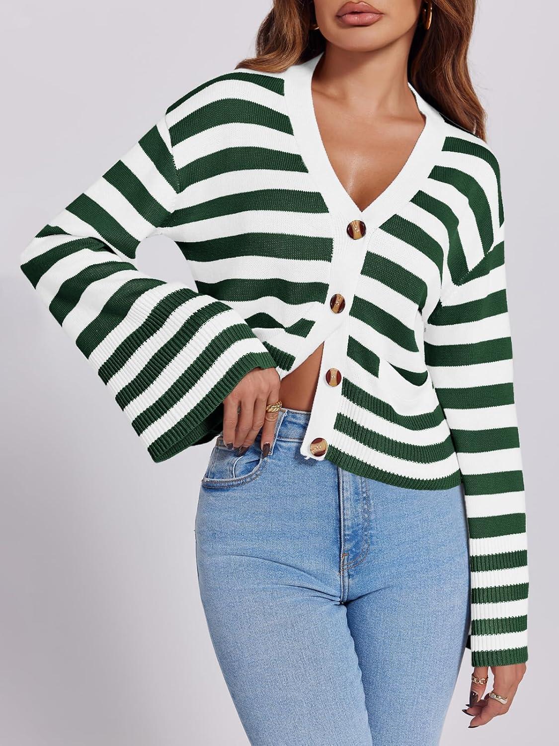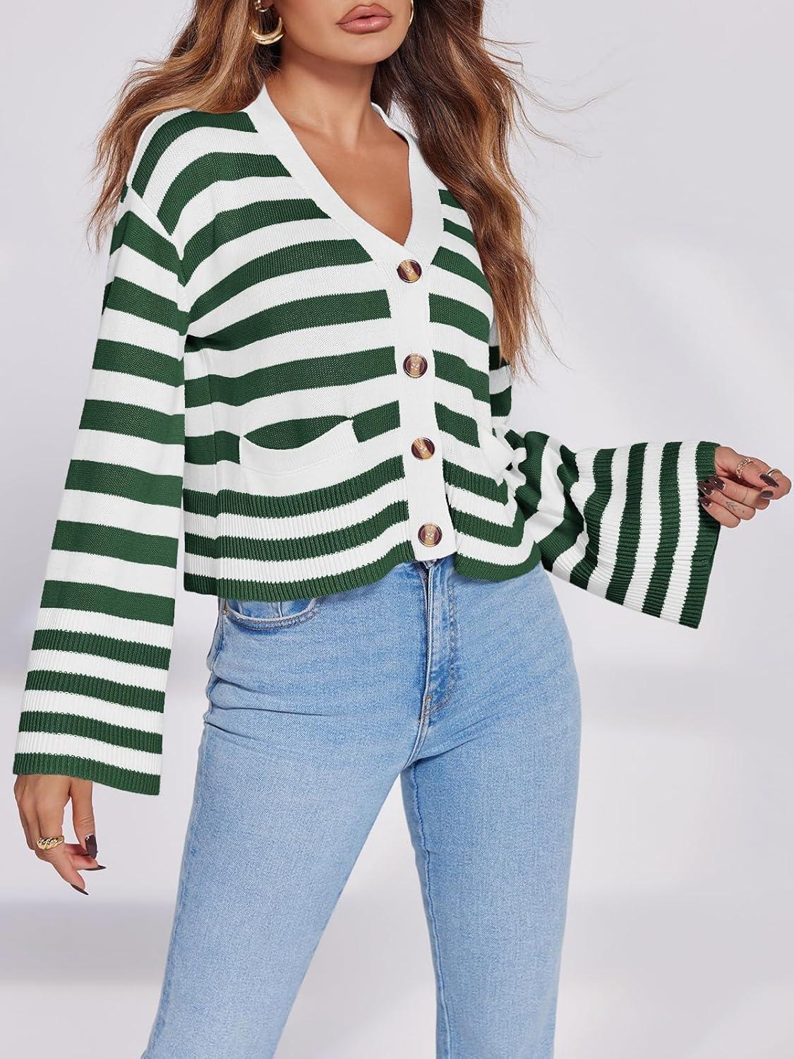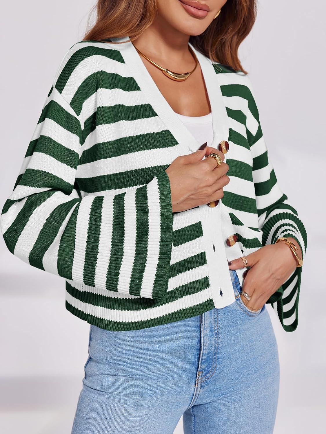 Saodimallsu Womens Striped Cardigan Sweaters Cropped Fall Button Open Front Long Sleeve Knit Sweater Coat with Pockets(Dark Green)