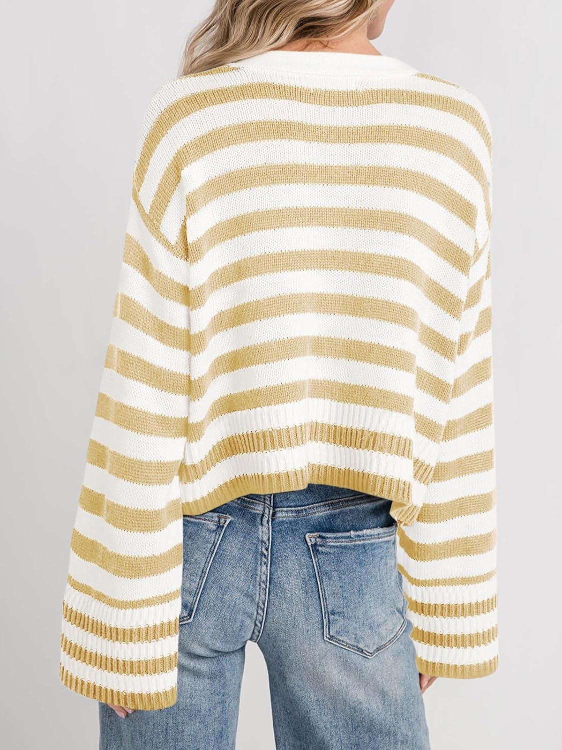 Saodimallsu Womens Striped Cardigan Sweaters Cropped Fall Button Open Front Long Sleeve Knit Sweater Coat with Pockets(Khaki)
