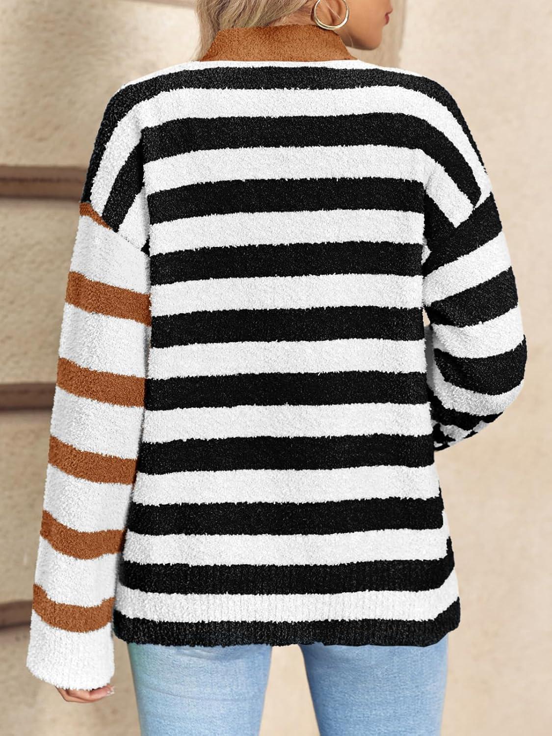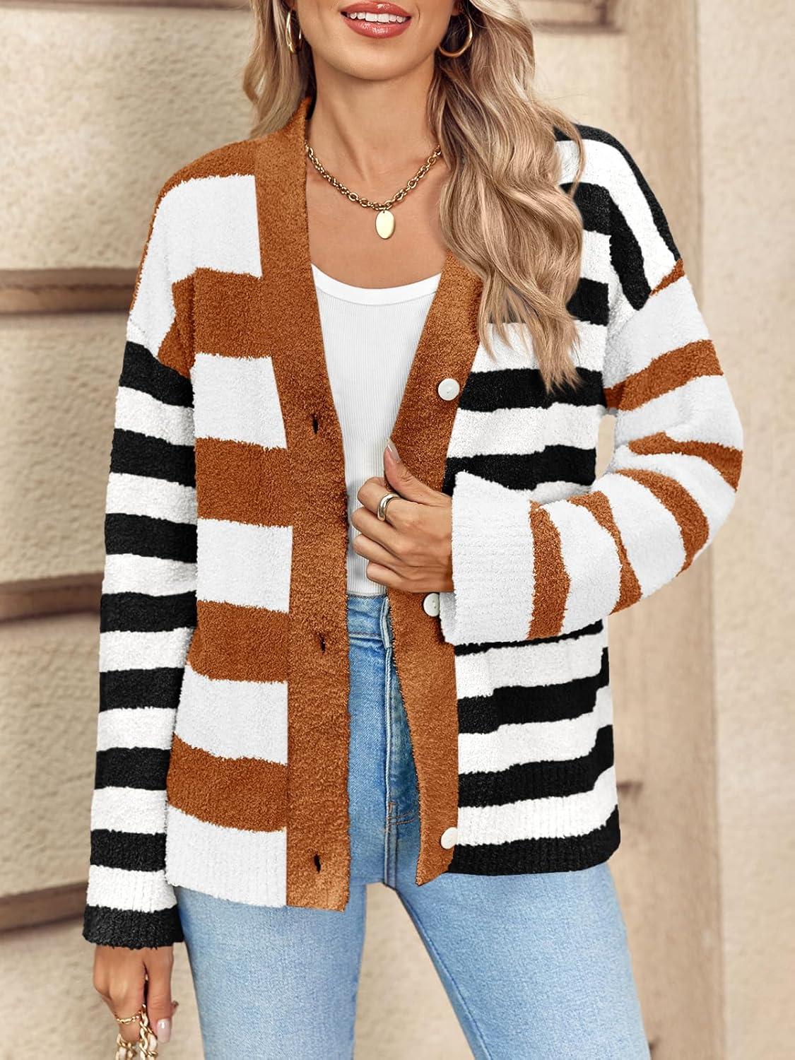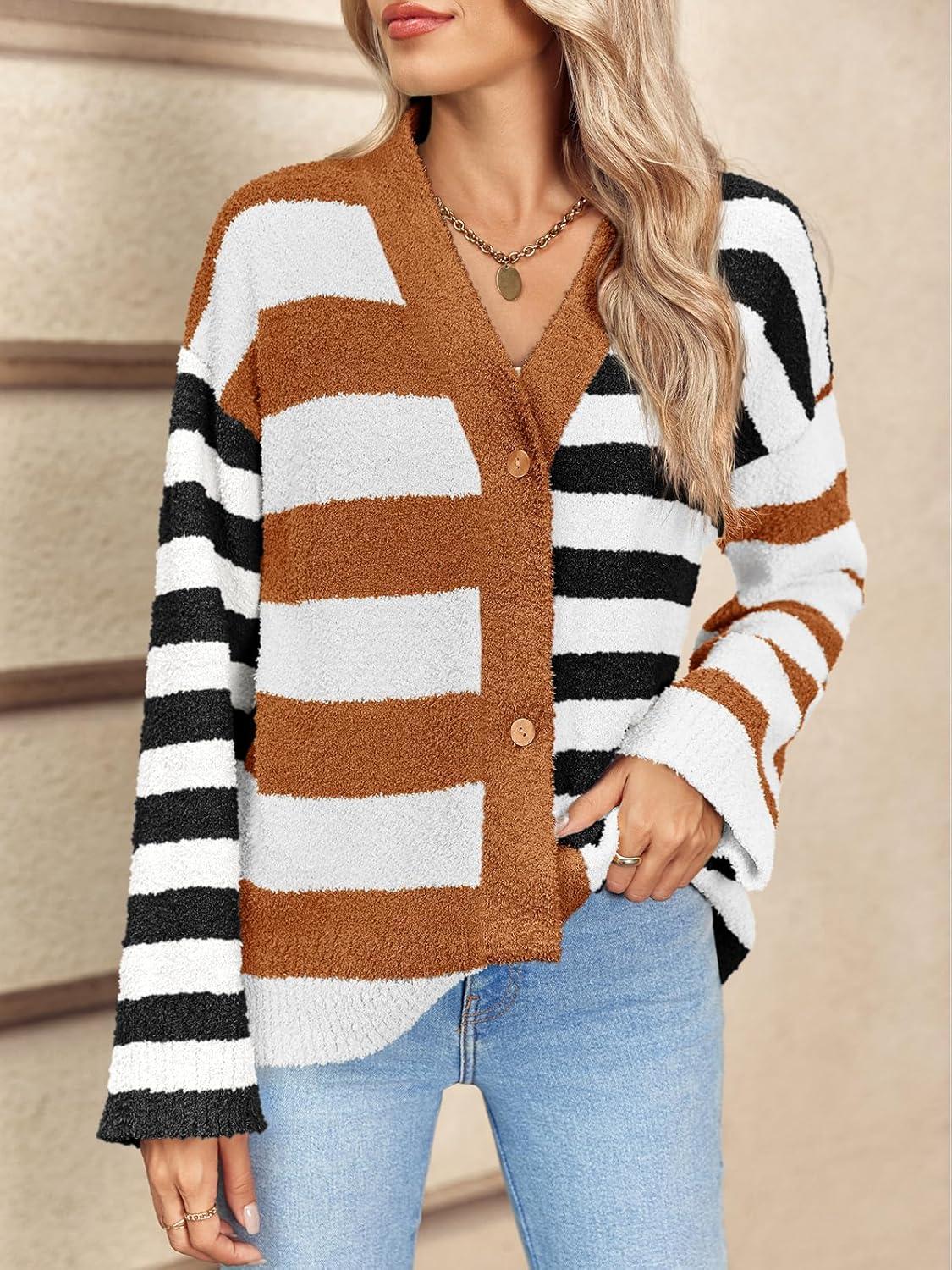 Saodimallsu Womens Striped Cardigan Sweaters V Neck Open Front Button Up Color Block Fuzzy Loose Knit Coats(Brown)