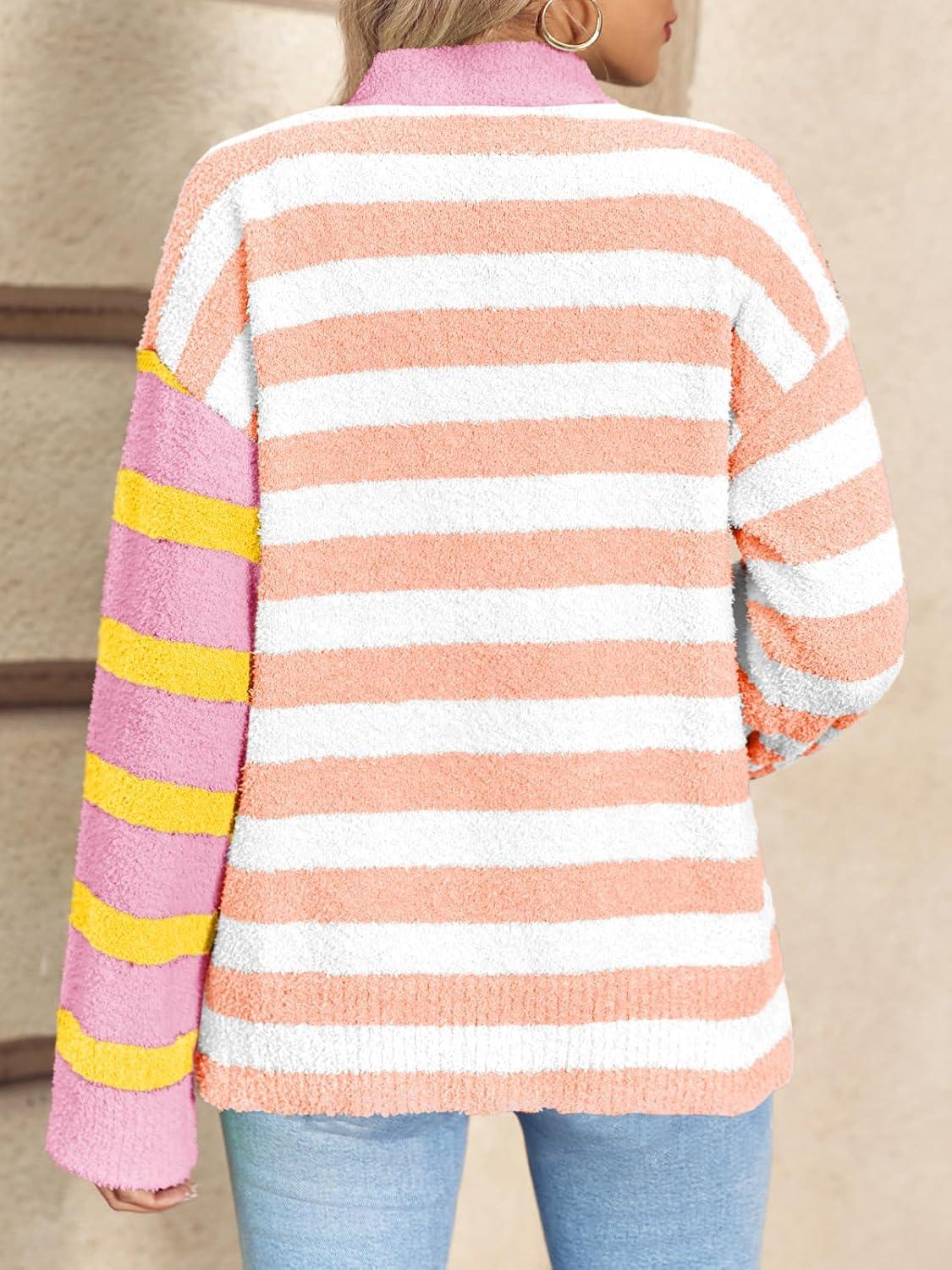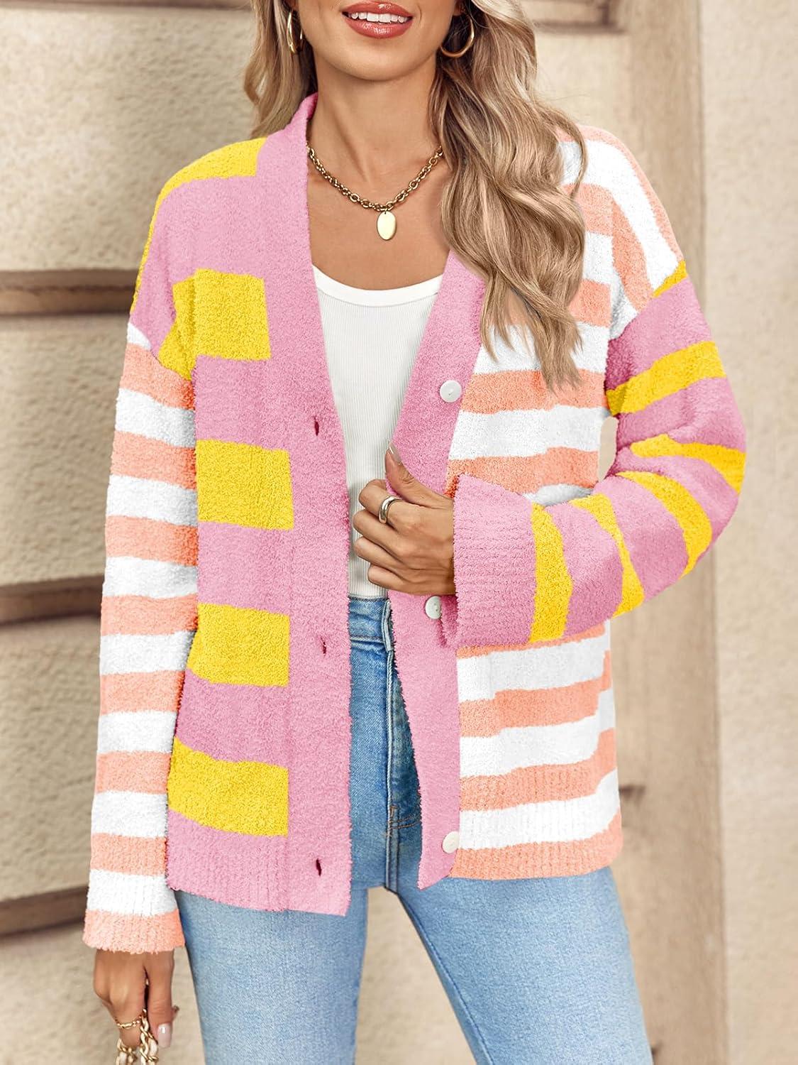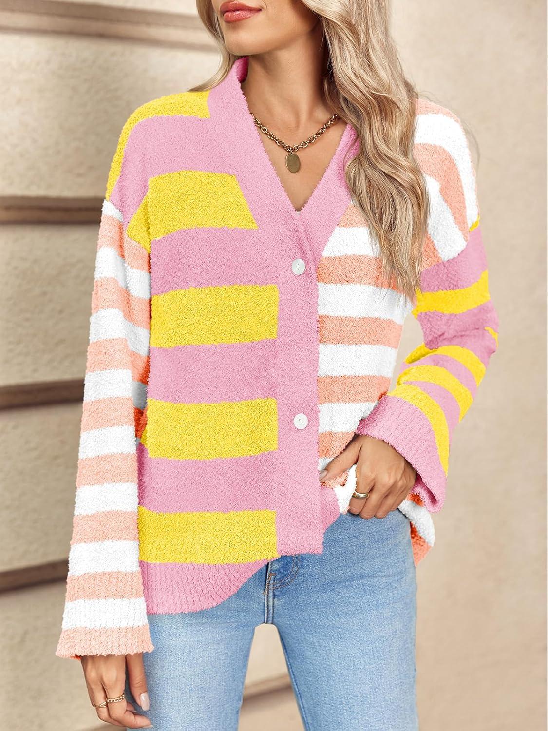 Saodimallsu Womens Striped Cardigan Sweaters V Neck Open Front Button Up Color Block Fuzzy Loose Knit Coats(Light Pink)