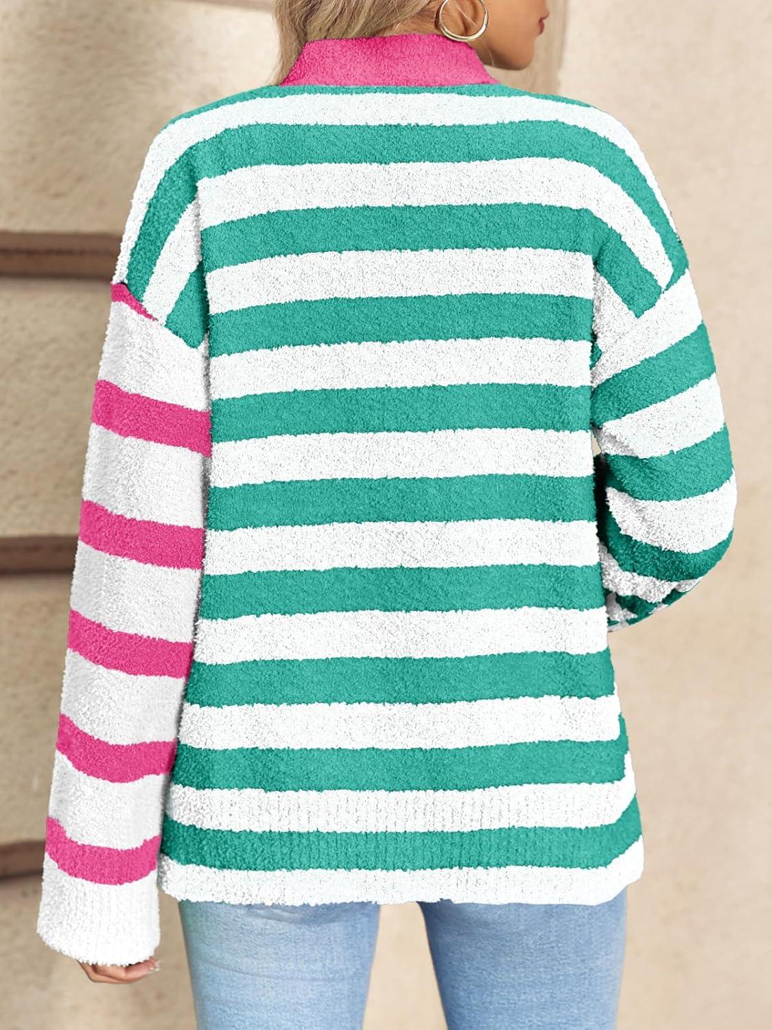 Saodimallsu Womens Striped Cardigan Sweaters V Neck Open Front Button Up Color Block Fuzzy Loose Knit Coats(Pink Green)