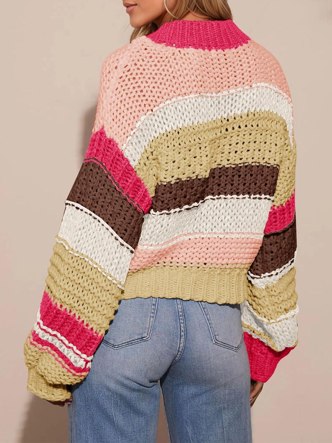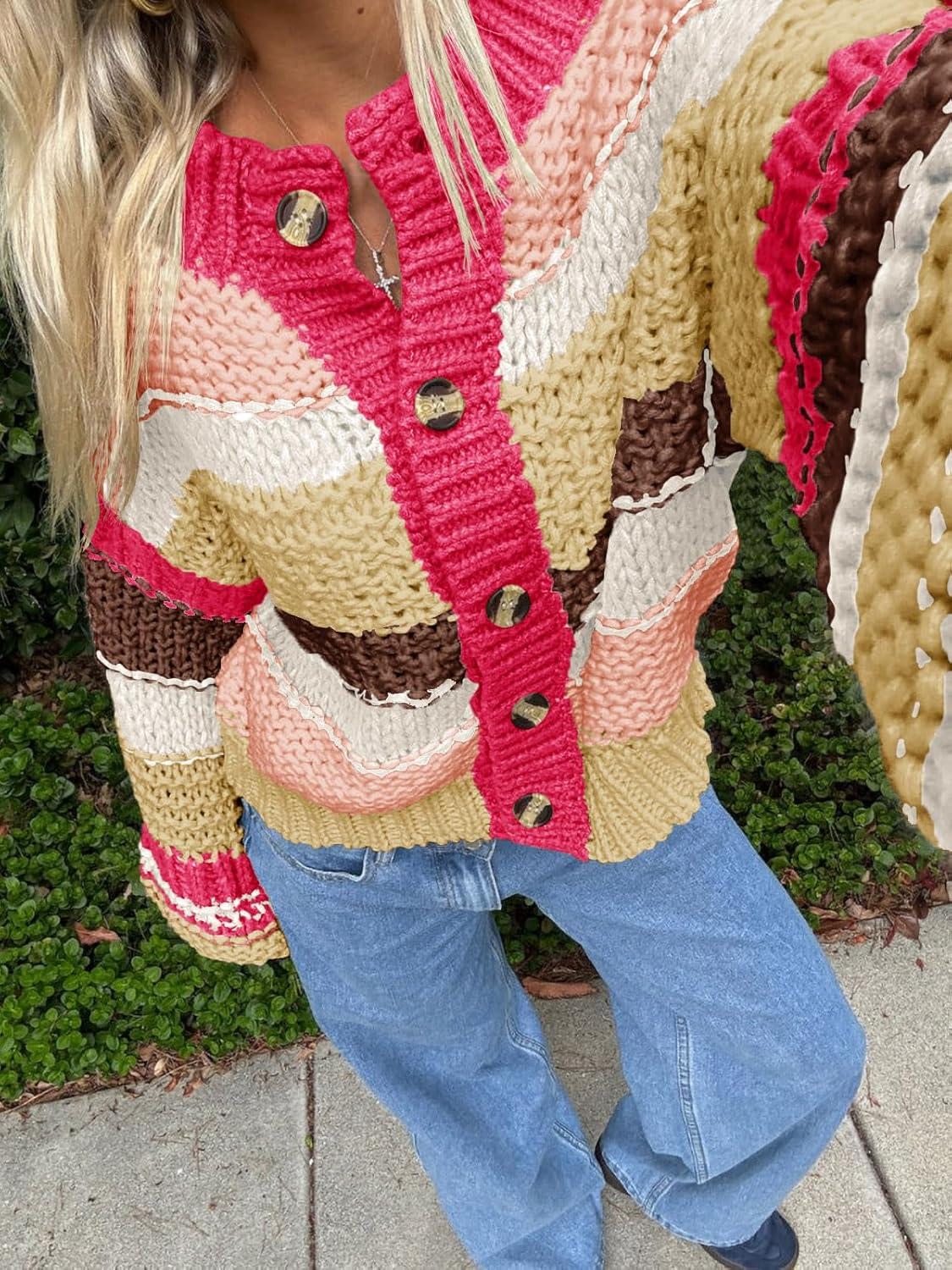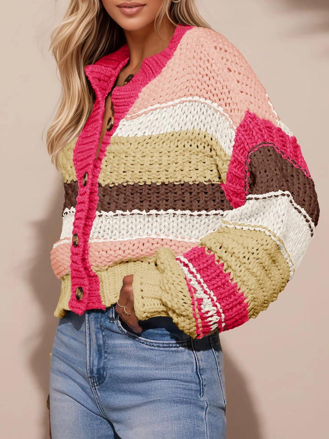 Saodimallsu Womens Striped Chunky Cardigan Sweaters Button Up Fall Trendy Color Block Long Sleeve Knit Sweater Coats(Rose Red)
