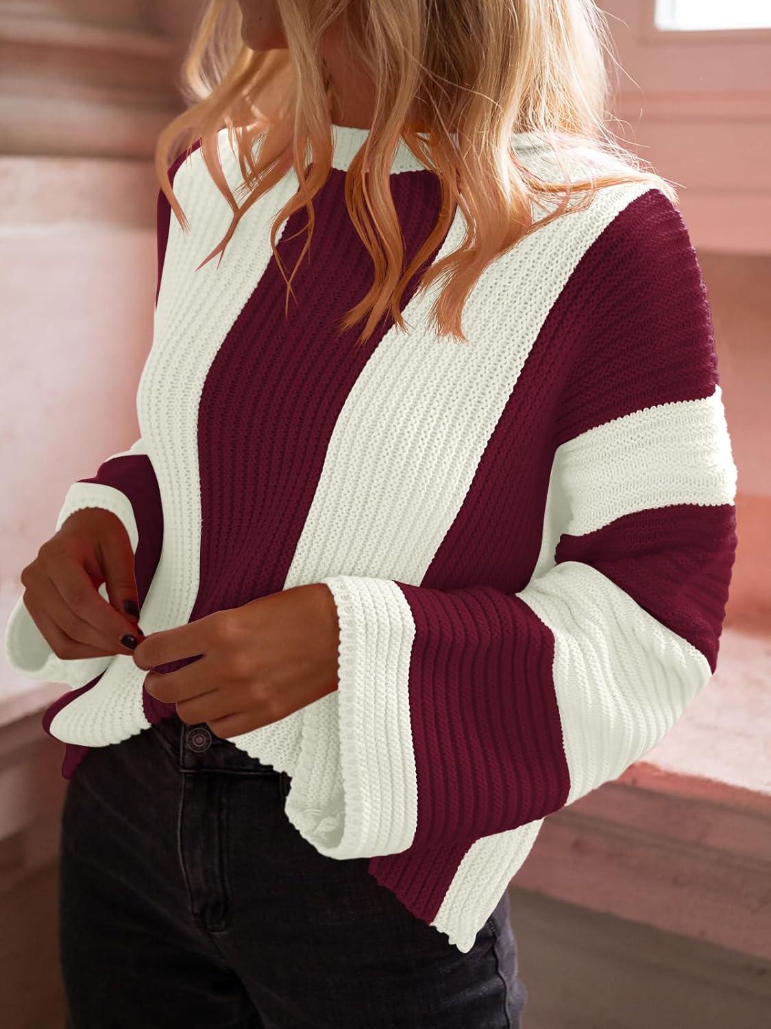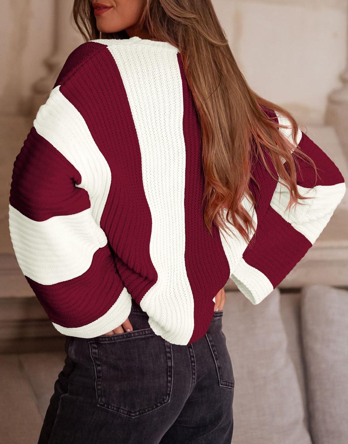 Saodimallsu Womens Striped Color Block Sweaters Fall Crew Neck Long Sleeve Ribbed Knit Casual Loose Pullover Sweater(Burgundy)