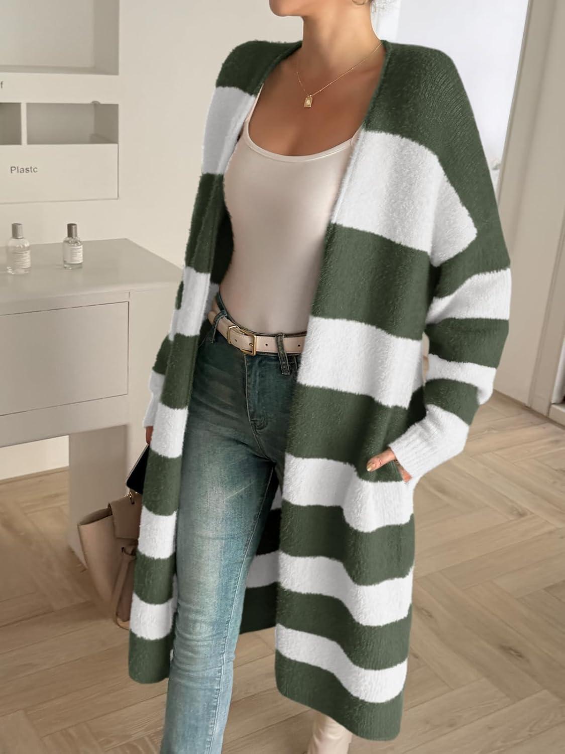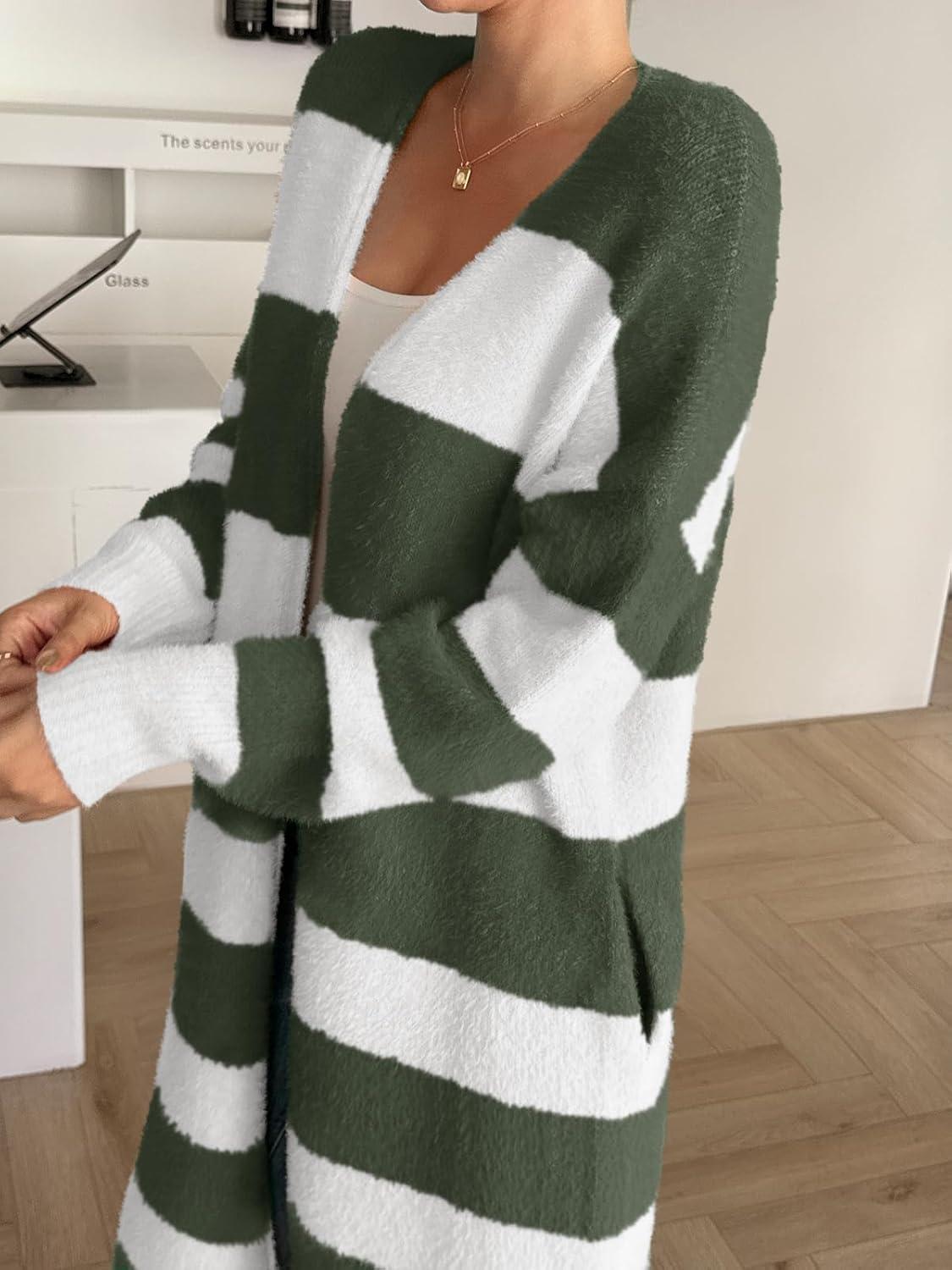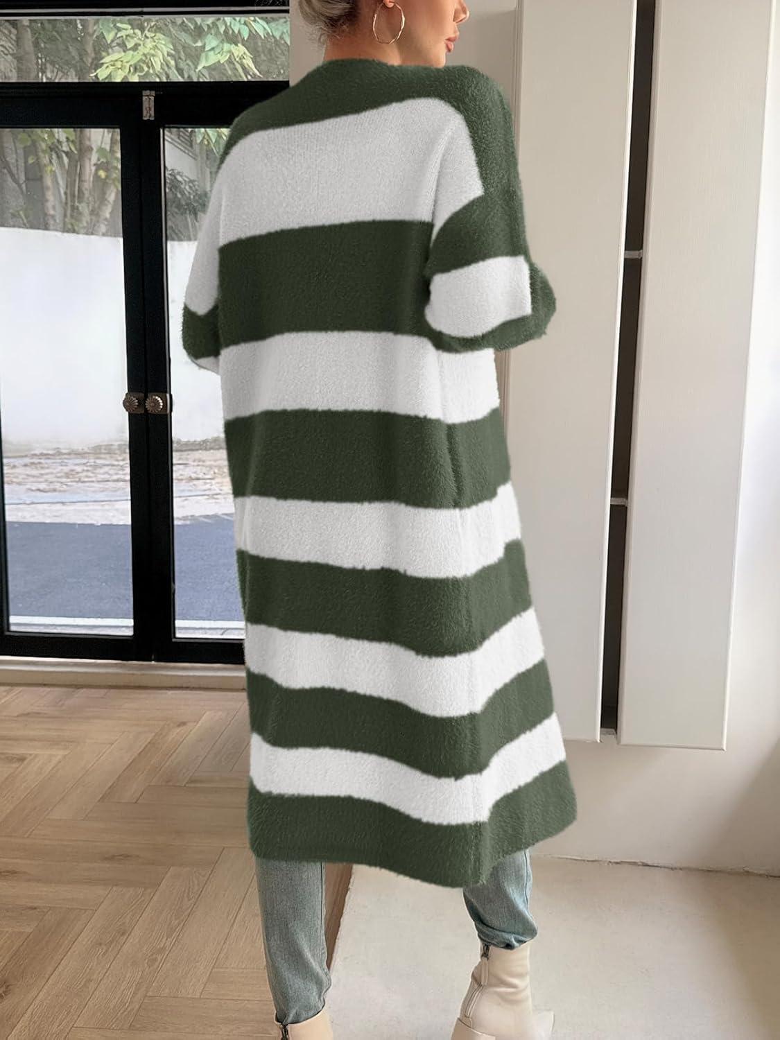 Saodimallsu Womens Striped Long Cardigan Sweaters Open Front Oversized Chunky Fuzzy Knit Fall Duster Sweater Coats(Army Green)