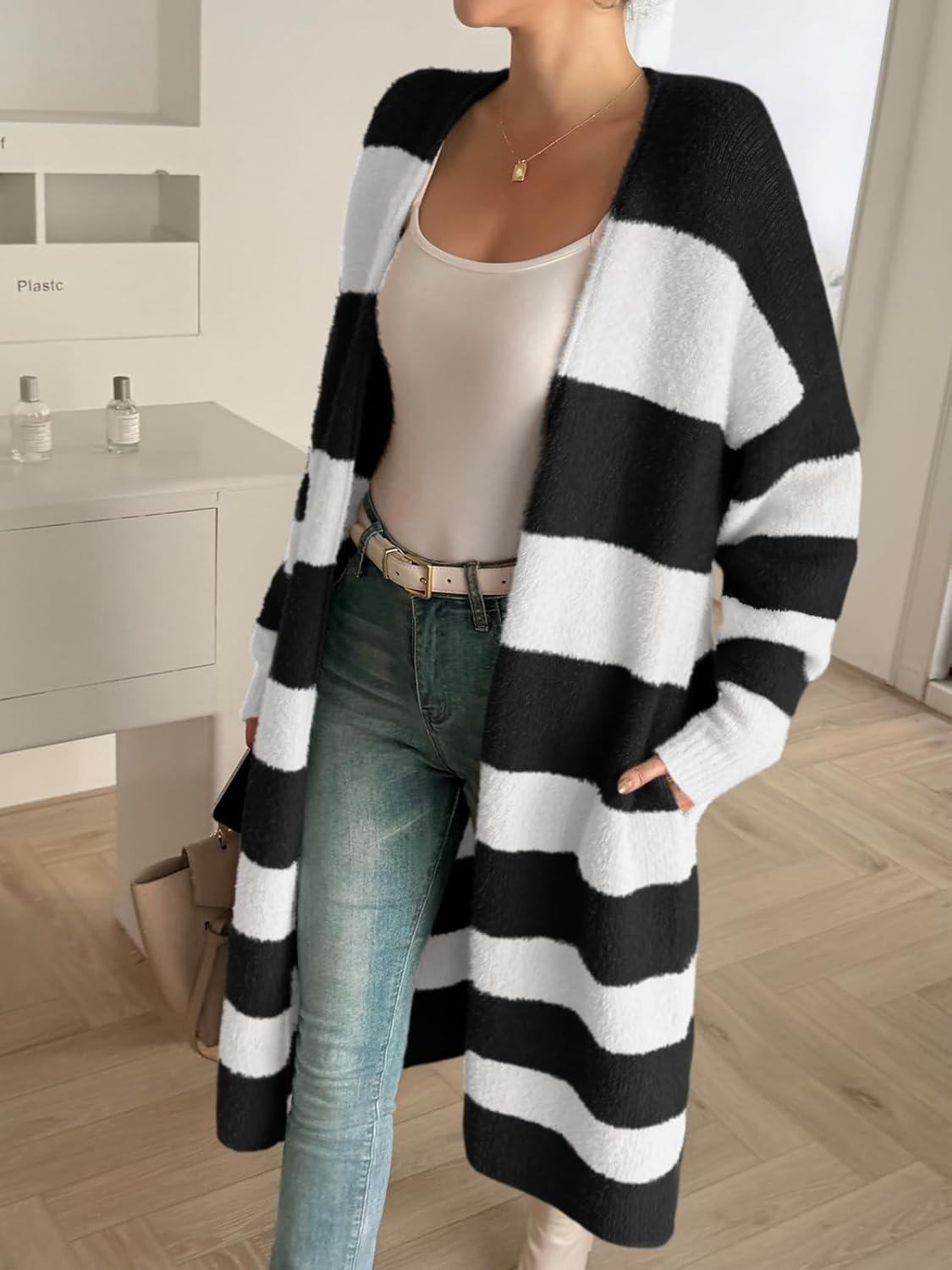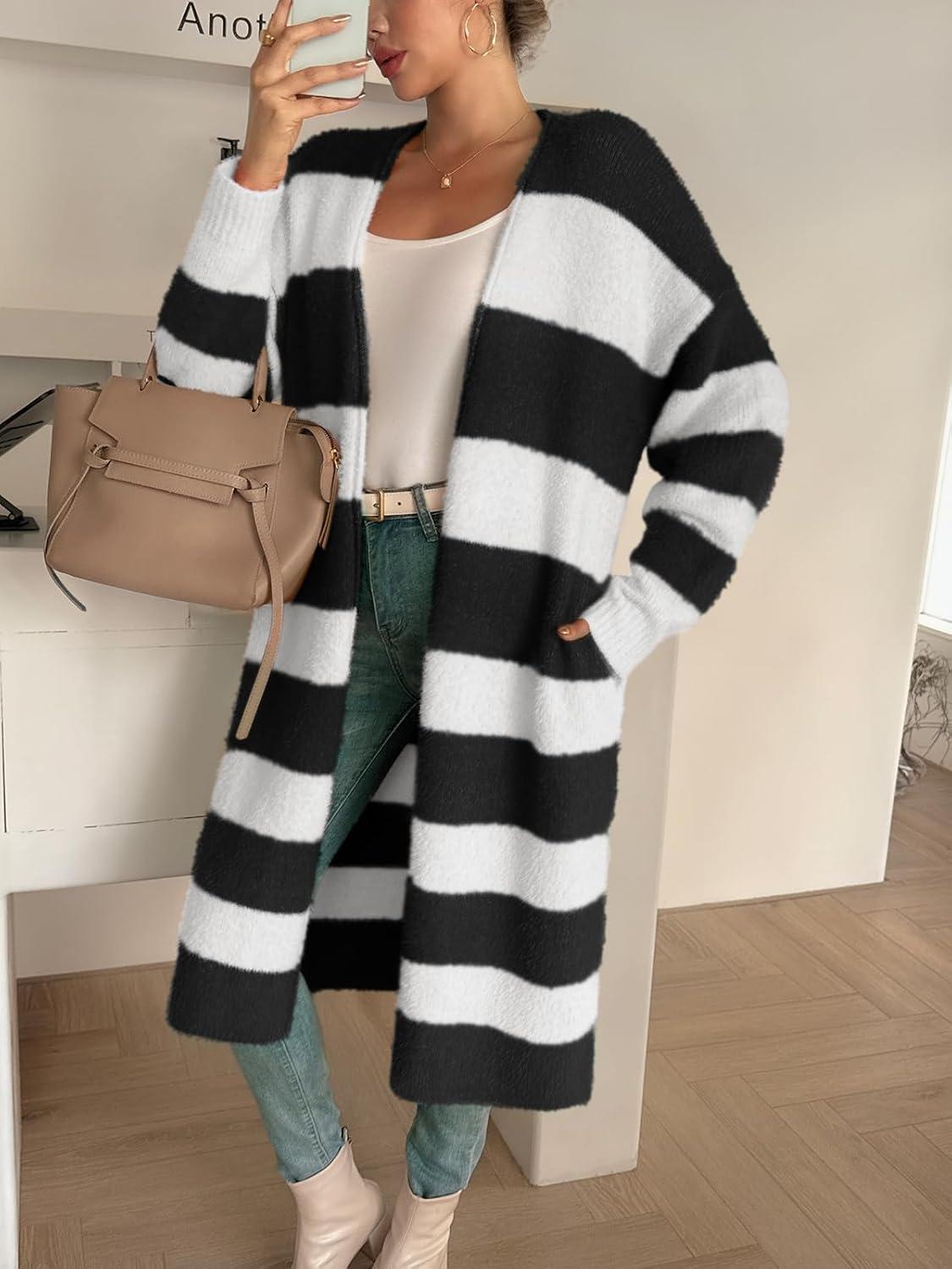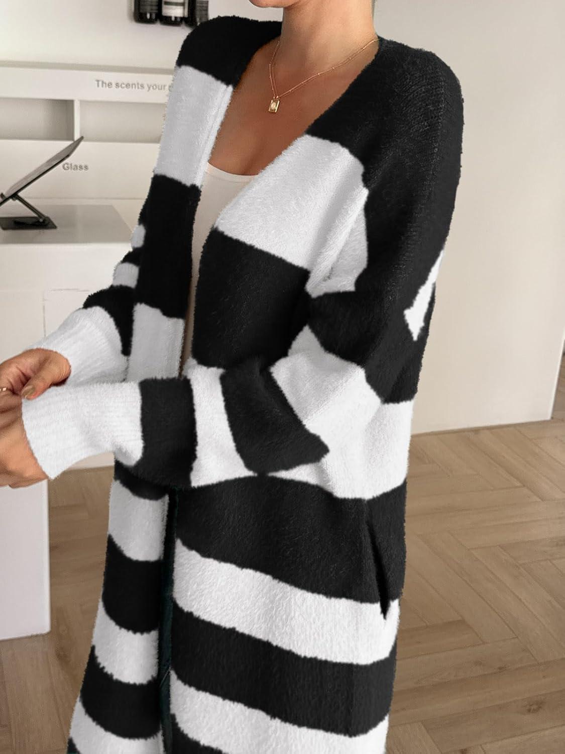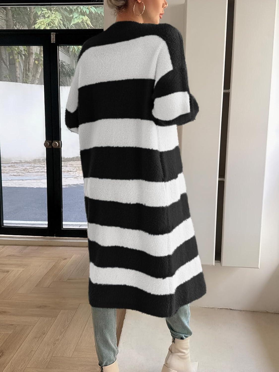 Saodimallsu Womens Striped Long Cardigan Sweaters Open Front Oversized Chunky Fuzzy Knit Fall Duster Sweater Coats(Black&white)