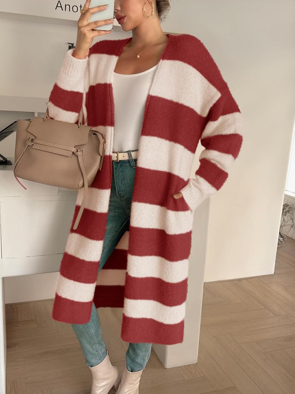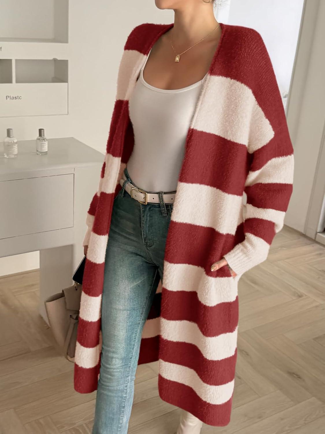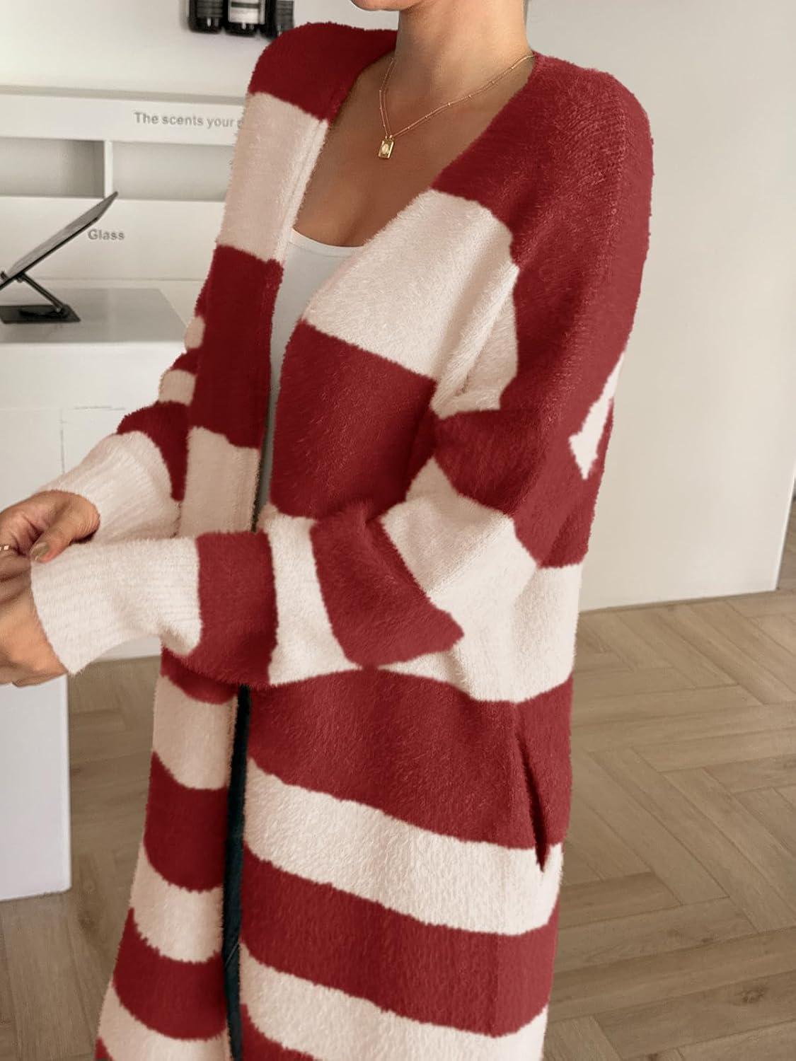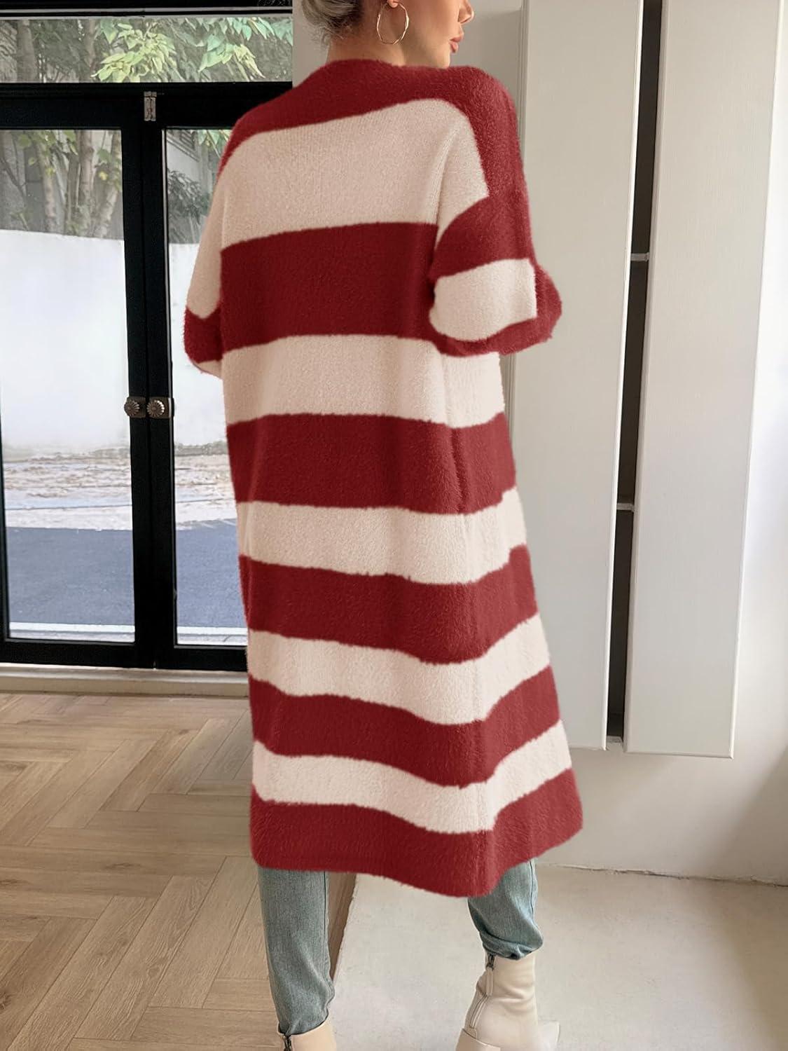Saodimallsu Womens Striped Long Cardigan Sweaters Open Front Oversized Chunky Fuzzy Knit Fall Duster Sweater Coats(Burgundy)