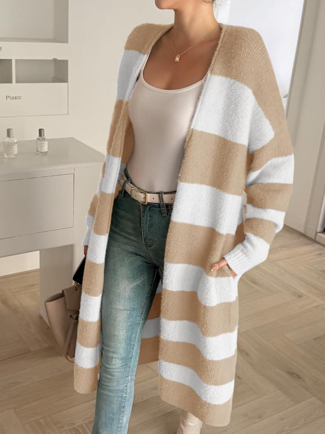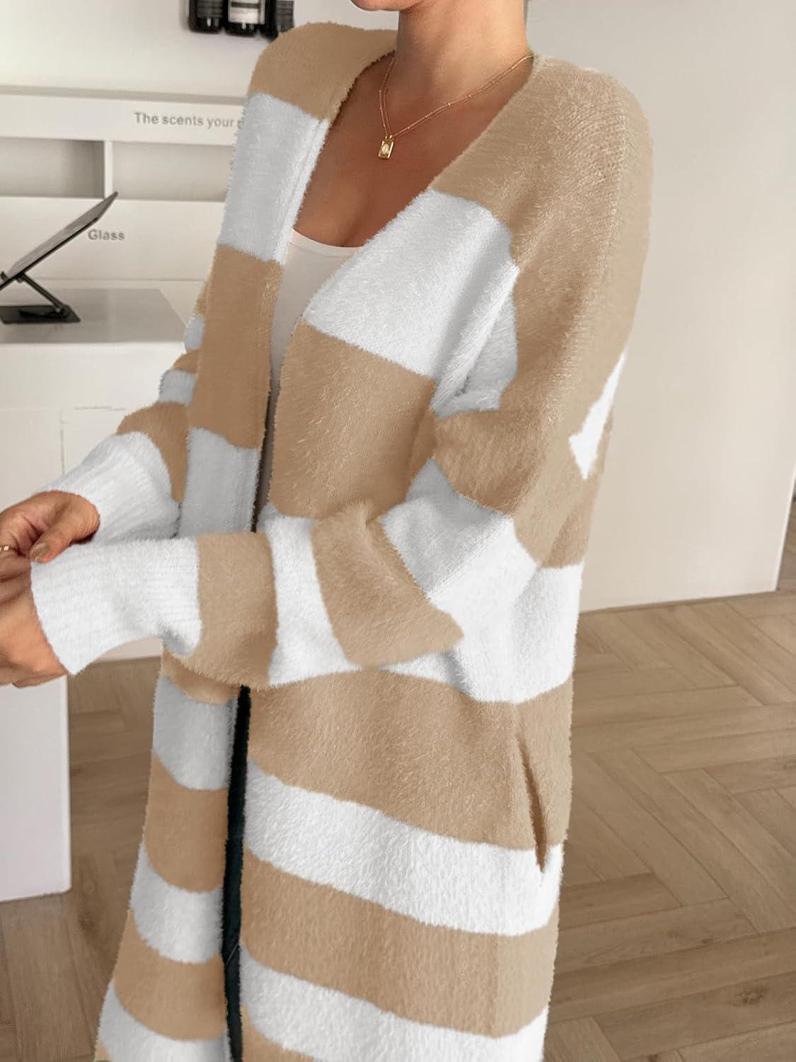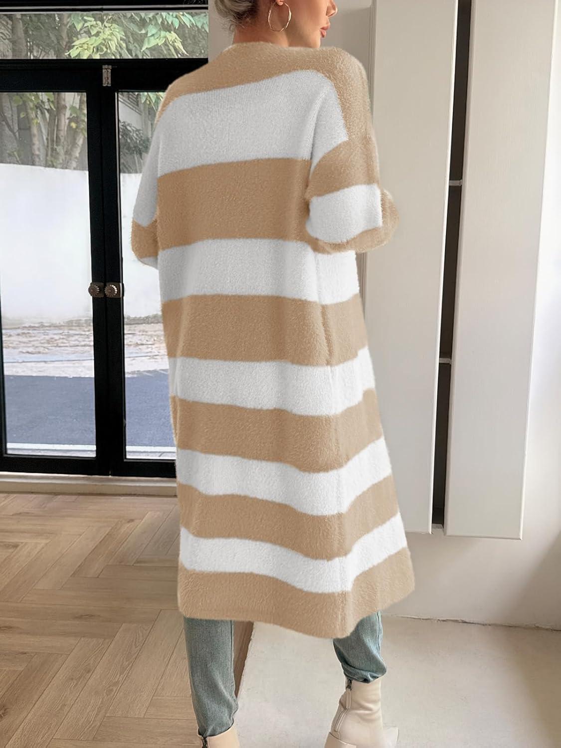Saodimallsu Womens Striped Long Cardigan Sweaters Open Front Oversized Chunky Fuzzy Knit Fall Duster Sweater Coats(Light Khaki)