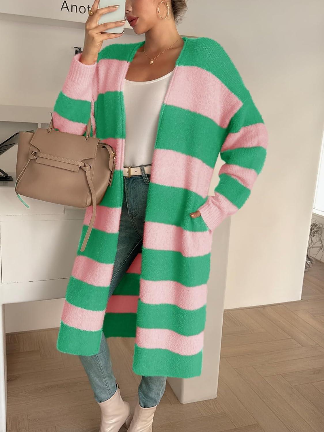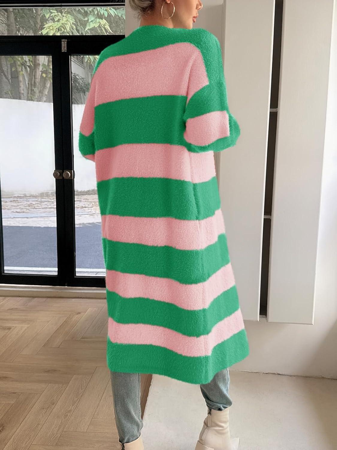 Saodimallsu Womens Striped Long Cardigan Sweaters Open Front Oversized Chunky Fuzzy Knit Fall Duster Sweater Coats(Pink Green)