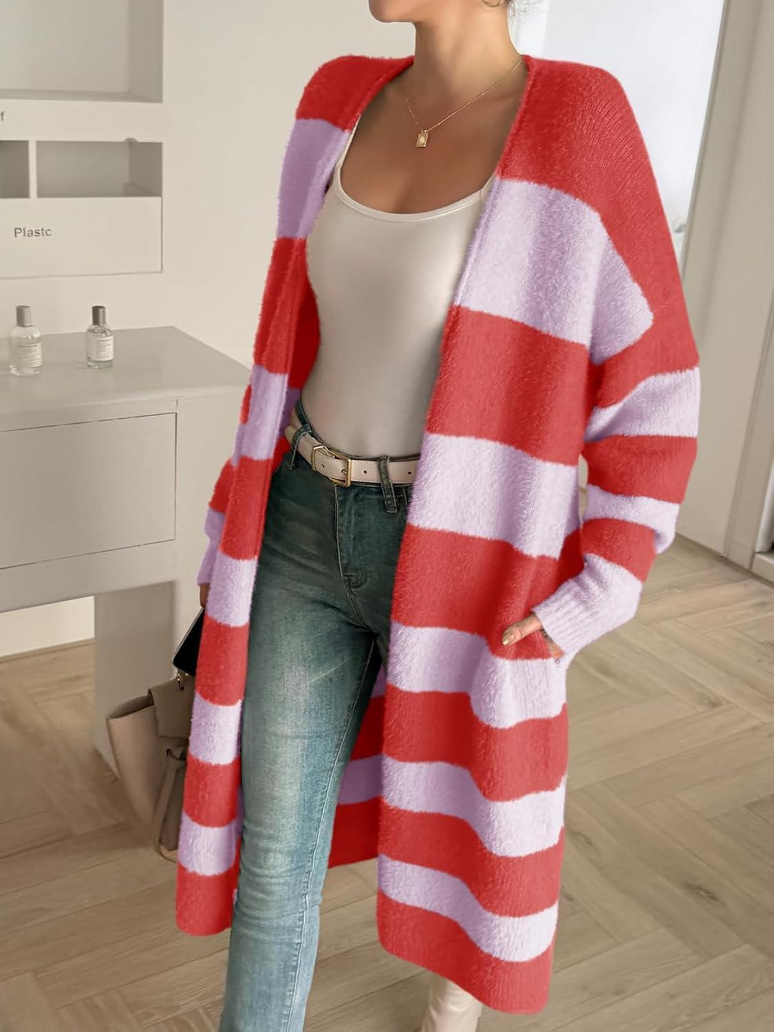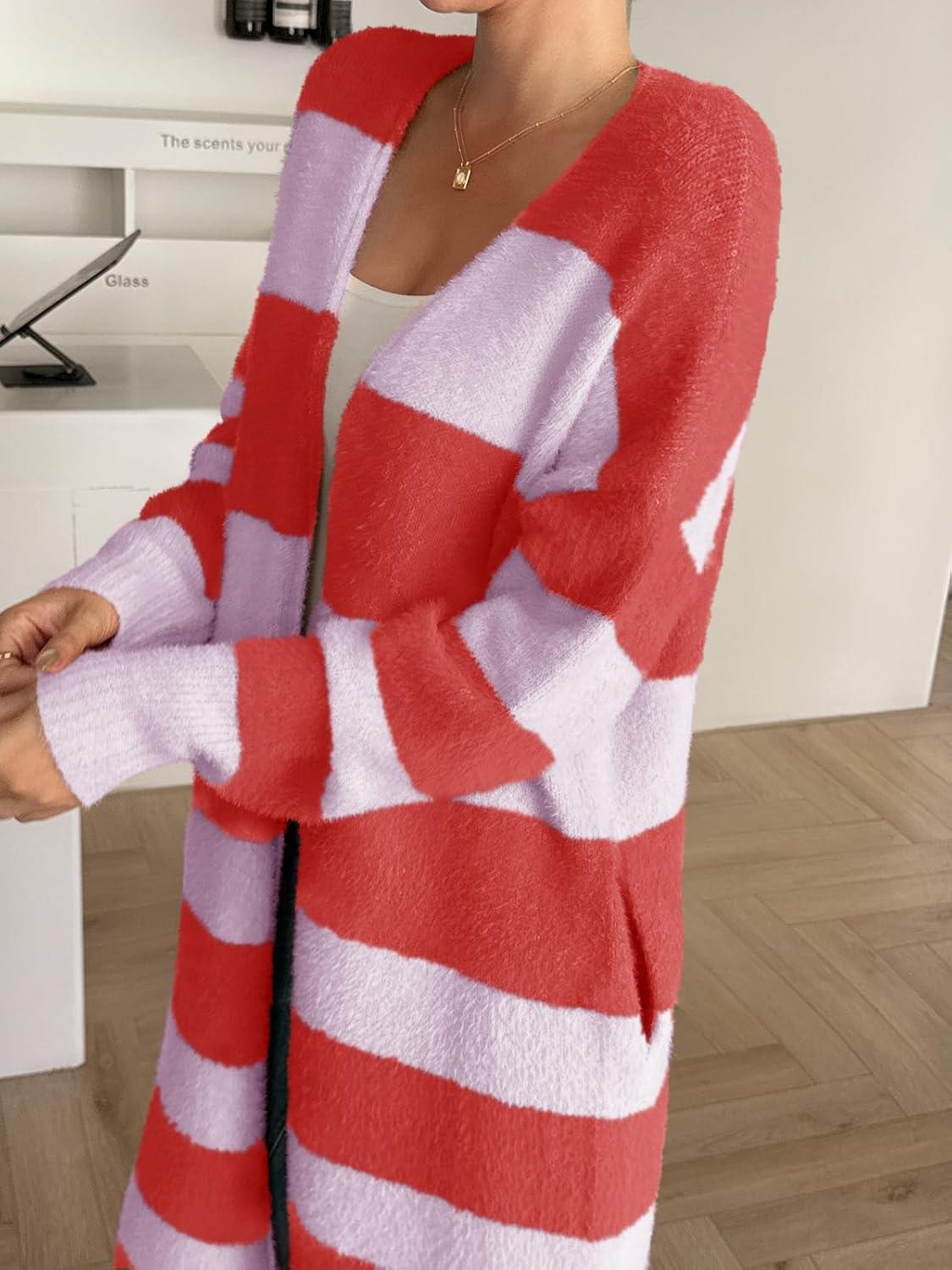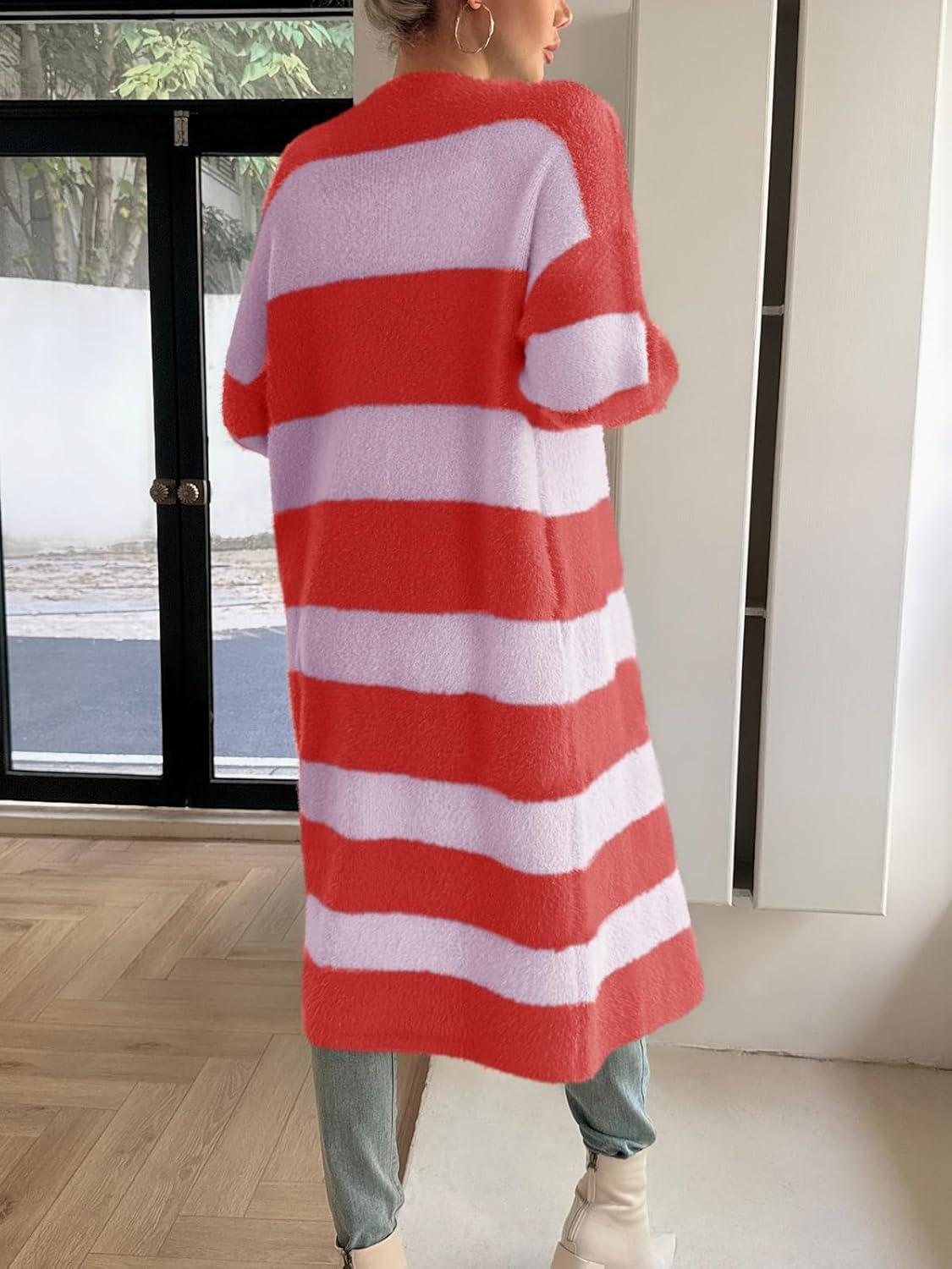 Saodimallsu Womens Striped Long Cardigan Sweaters Open Front Oversized Chunky Fuzzy Knit Fall Duster Sweater Coats(Red)
