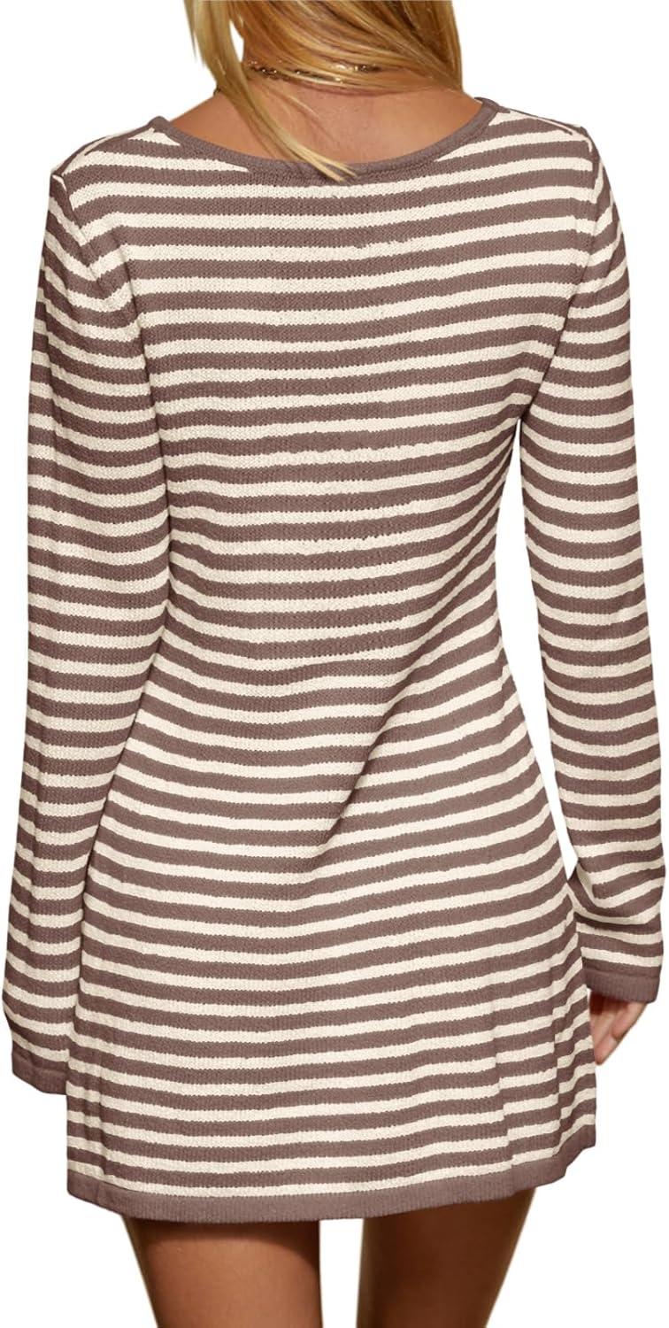 Saodimallsu Womens Striped Pullover Sweater Crew Neck Fall Long Sleeve Trendy Casual Ribbed Knit Tunic Mini Dress(Khaki)