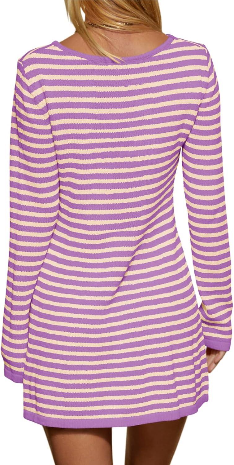 Saodimallsu Womens Striped Pullover Sweater Crew Neck Fall Long Sleeve Trendy Casual Ribbed Knit Tunic Mini Dress(Purple)