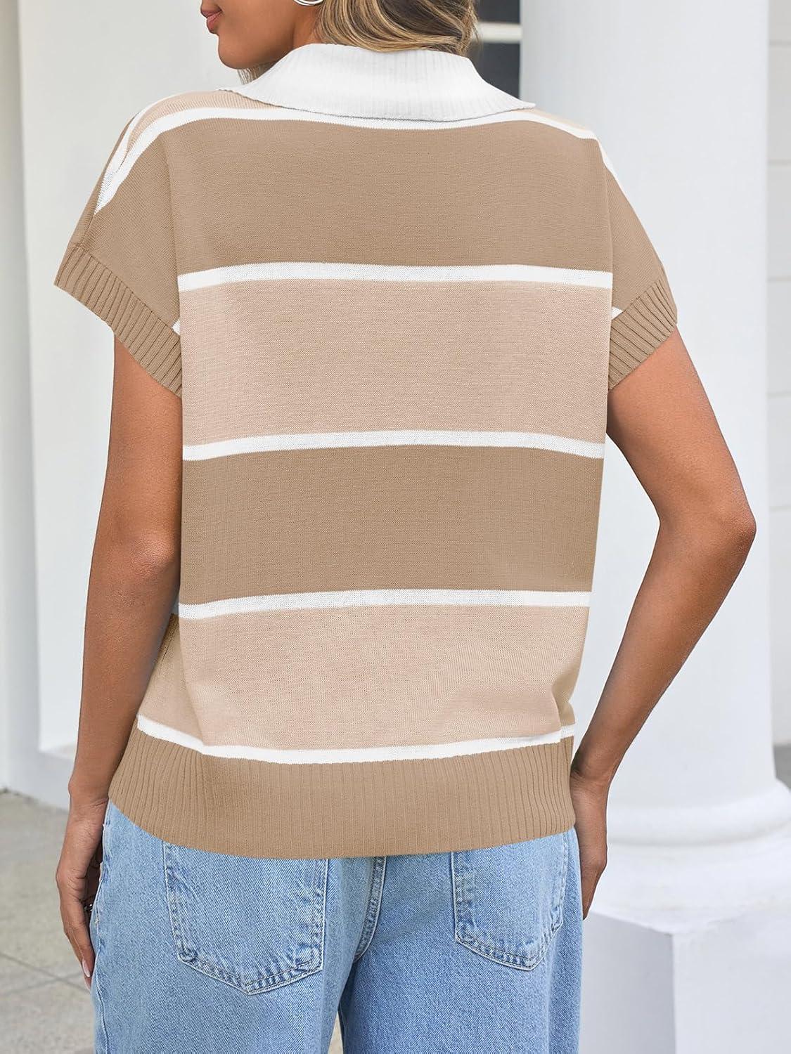 Saodimallsu Womens Striped Short Sleeve Sweater V Neck Button Down Color Block Loose Knit Pullover Tops(Khaki)
