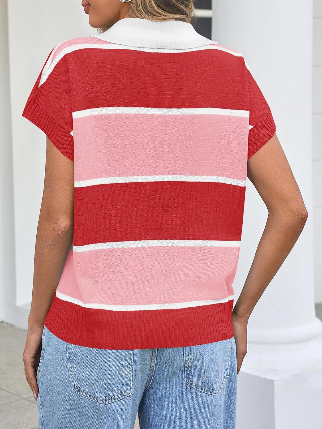 Saodimallsu Womens Striped Short Sleeve Sweater V Neck Button Down Color Block Loose Knit Pullover Tops(Red)