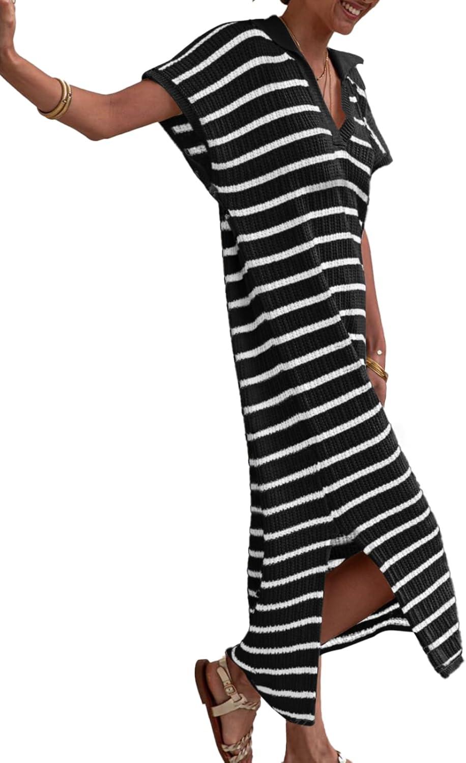 Saodimallsu Womens Striped Summer Dresses Short Sleeve V Neck Knit Collared Sexy Slit Loose Maxi Sweater Dress(Black)