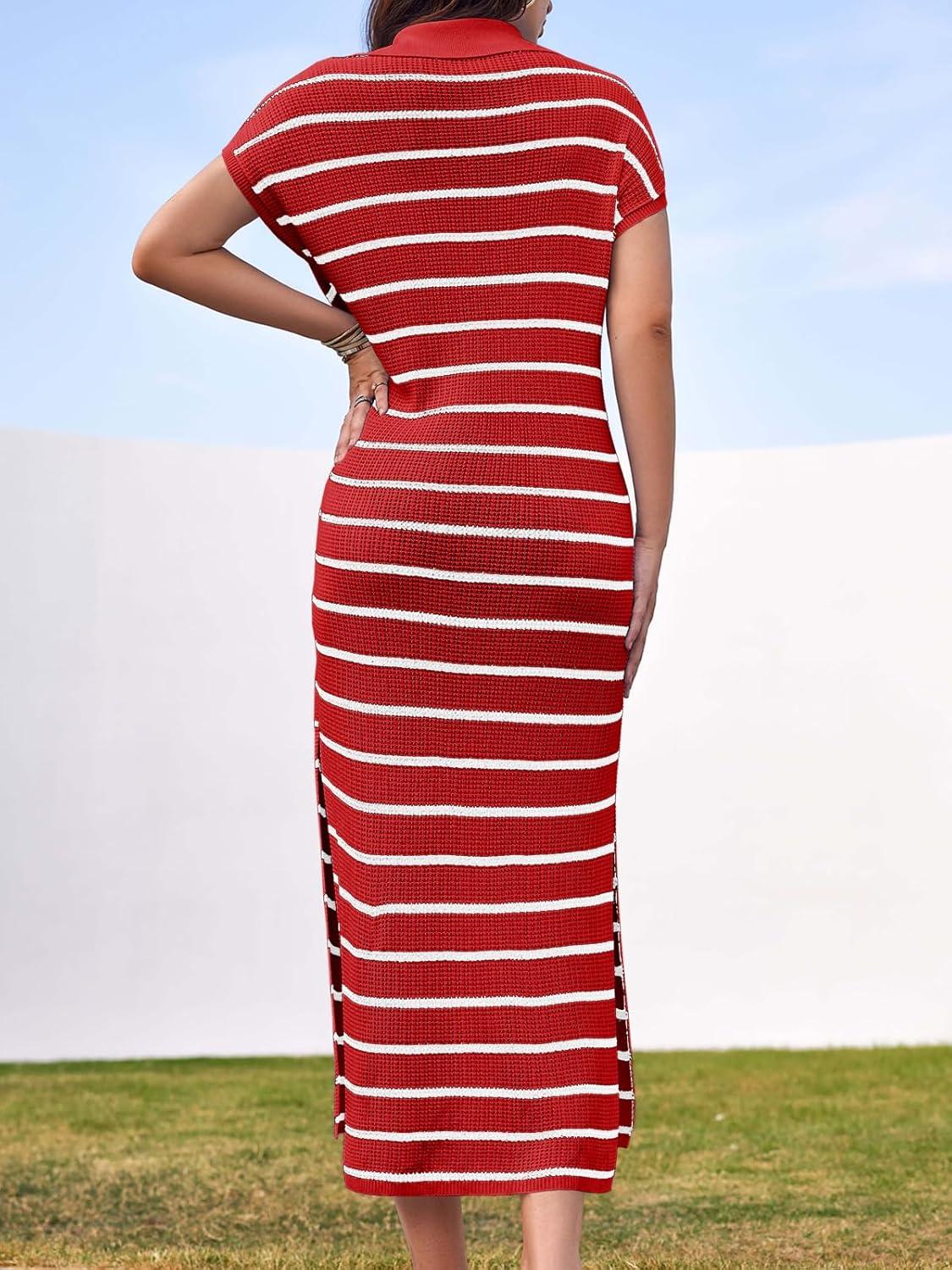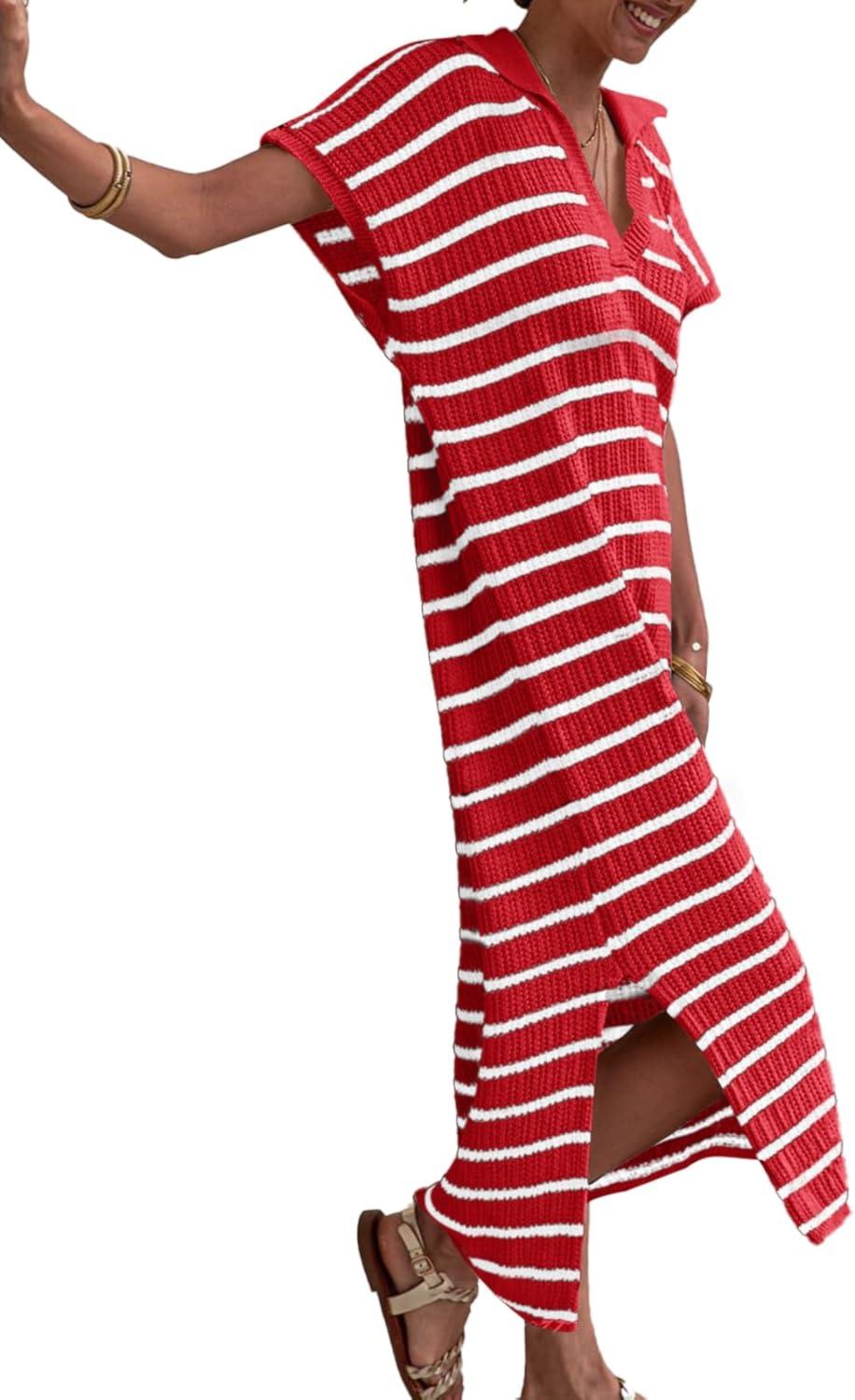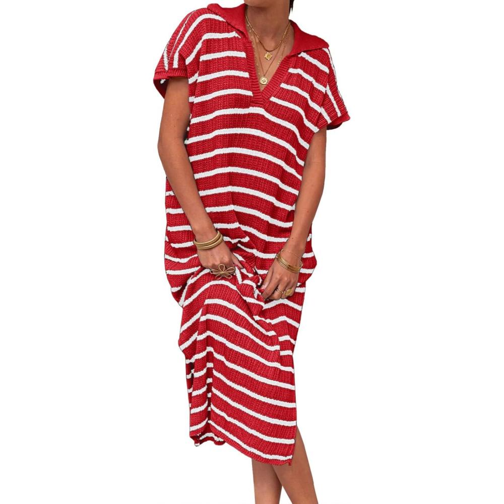 Saodimallsu Womens Striped Summer Dresses Short Sleeve V Neck Knit Collared Sexy Slit Loose Maxi Sweater Dress(Red)