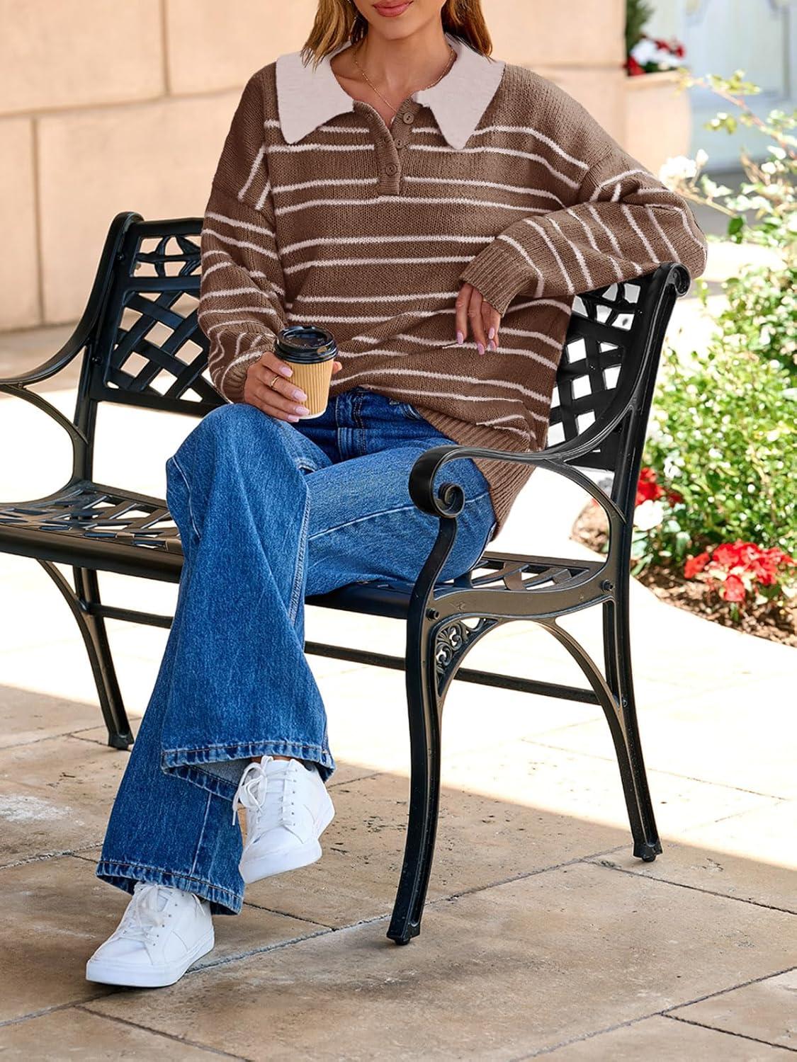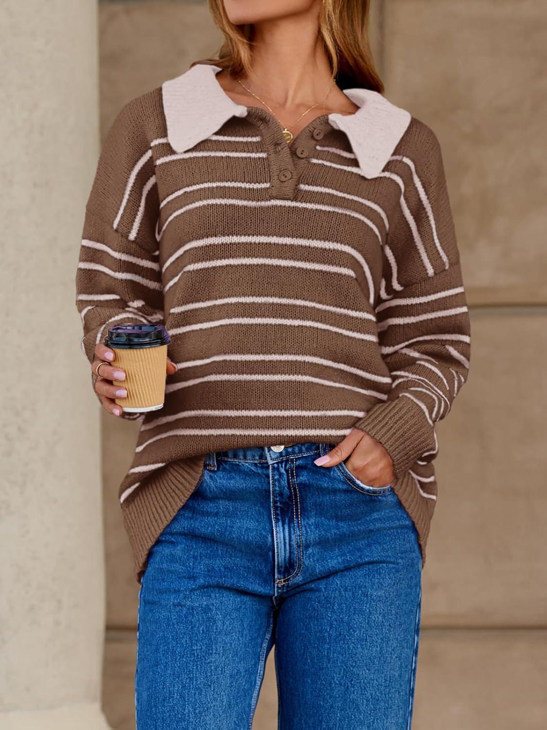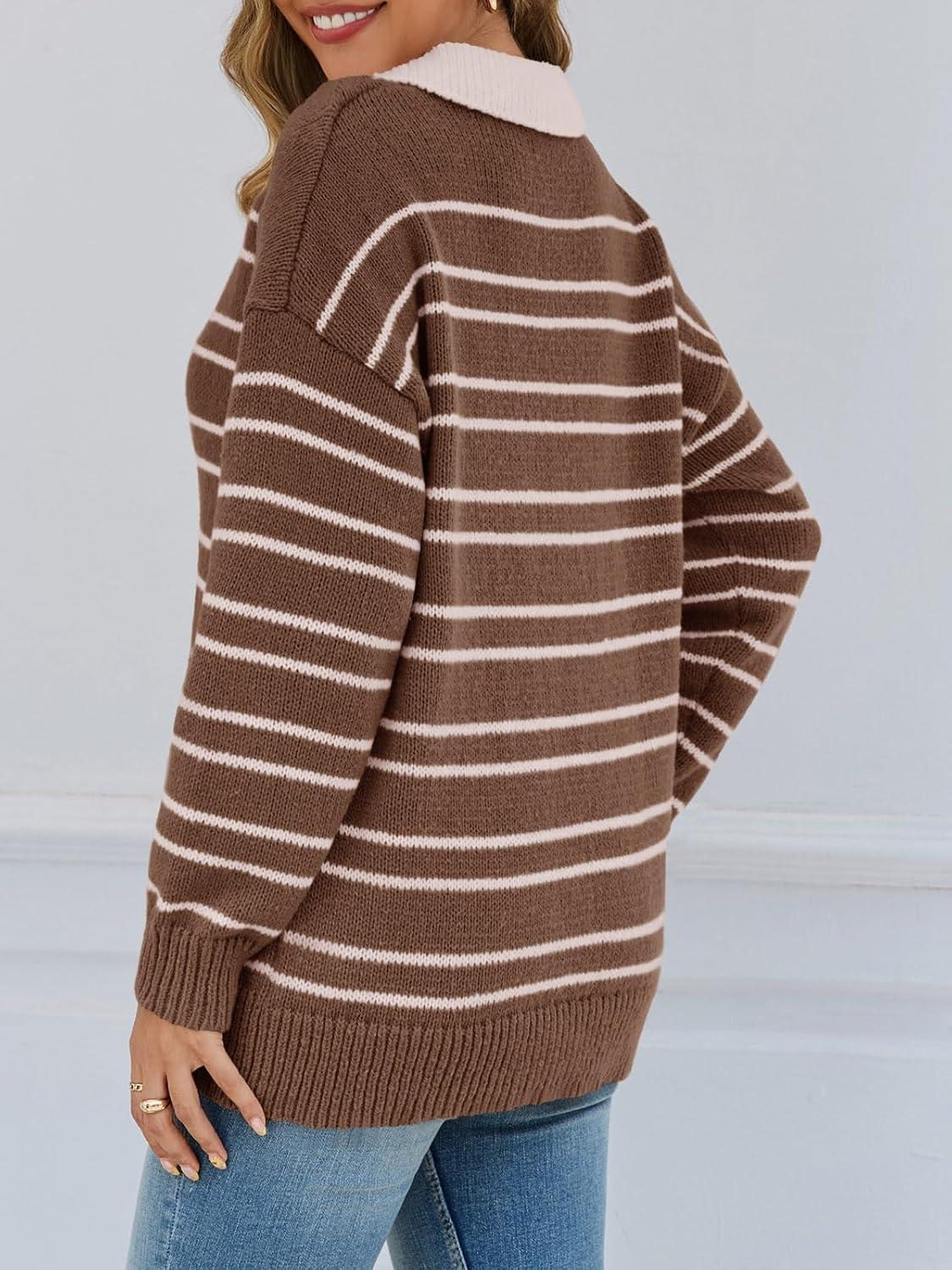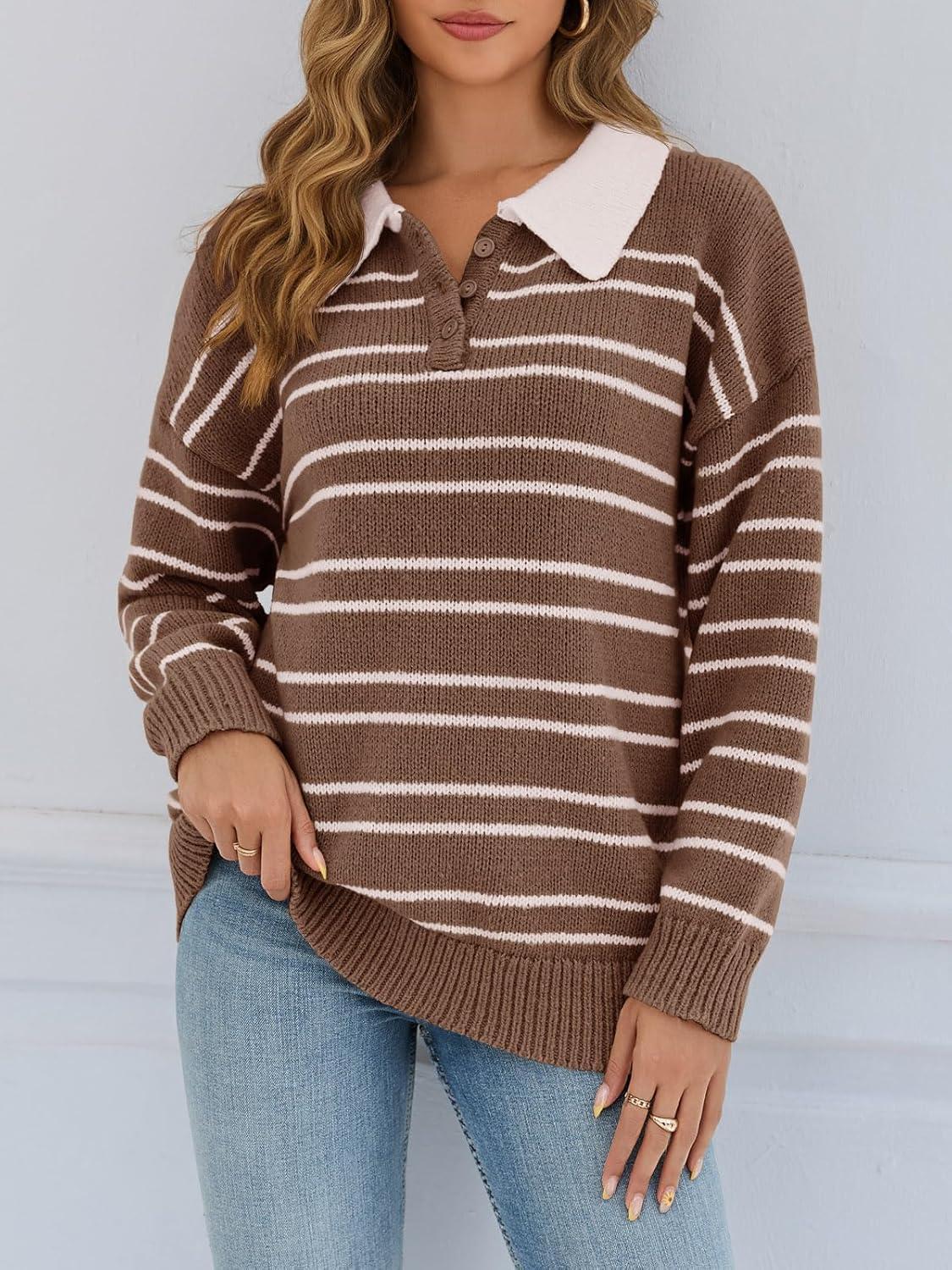 Saodimallsu Womens Striped Swaters Button Collared Polo Shirts Oversized Long Sleeve Chunky Knit Trendy Pullover Tops(Brown)