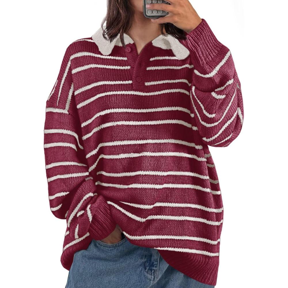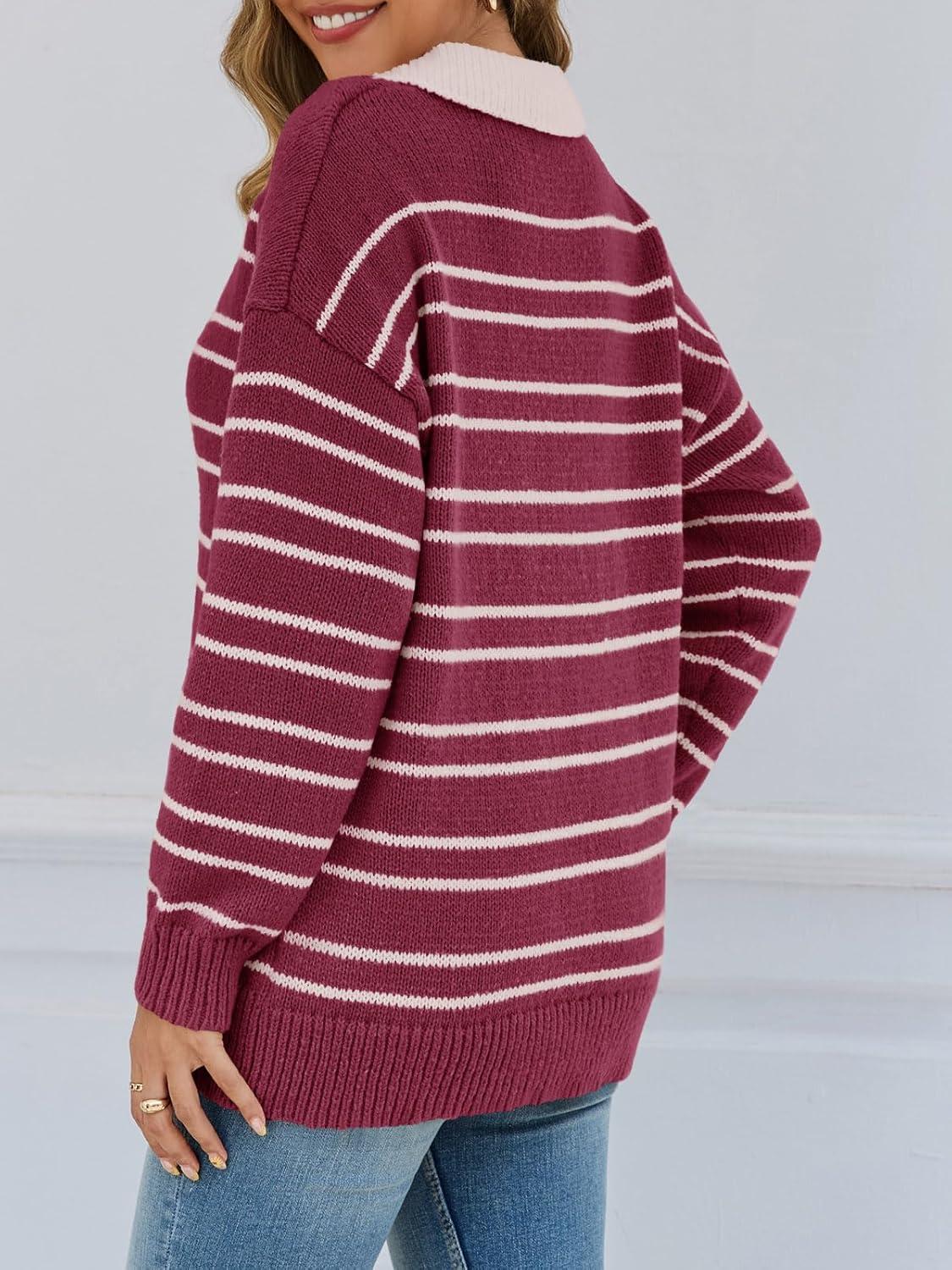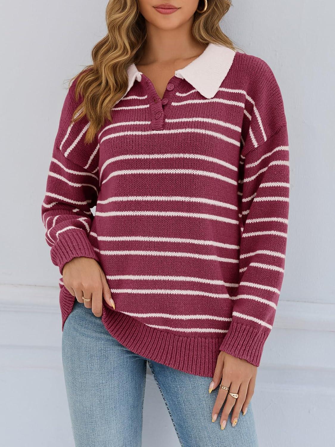 Saodimallsu Womens Striped Swaters Button Collared Polo Shirts Oversized Long Sleeve Chunky Knit Trendy Pullover Tops(Burgundy)