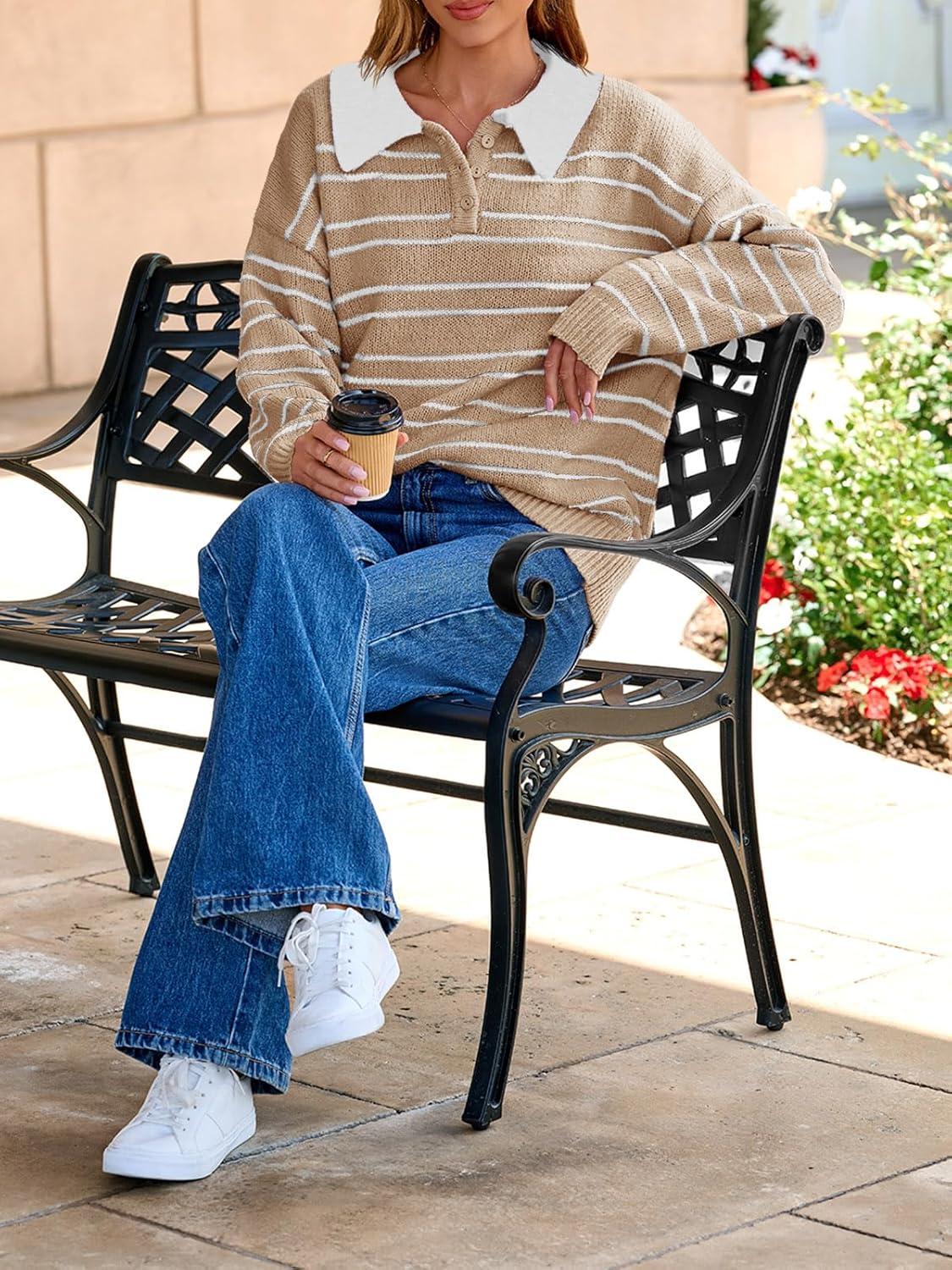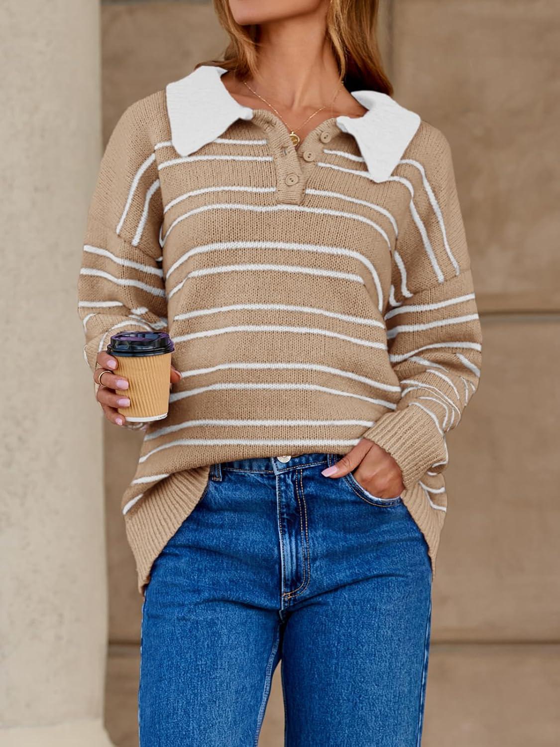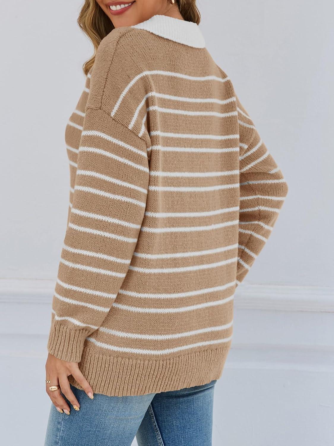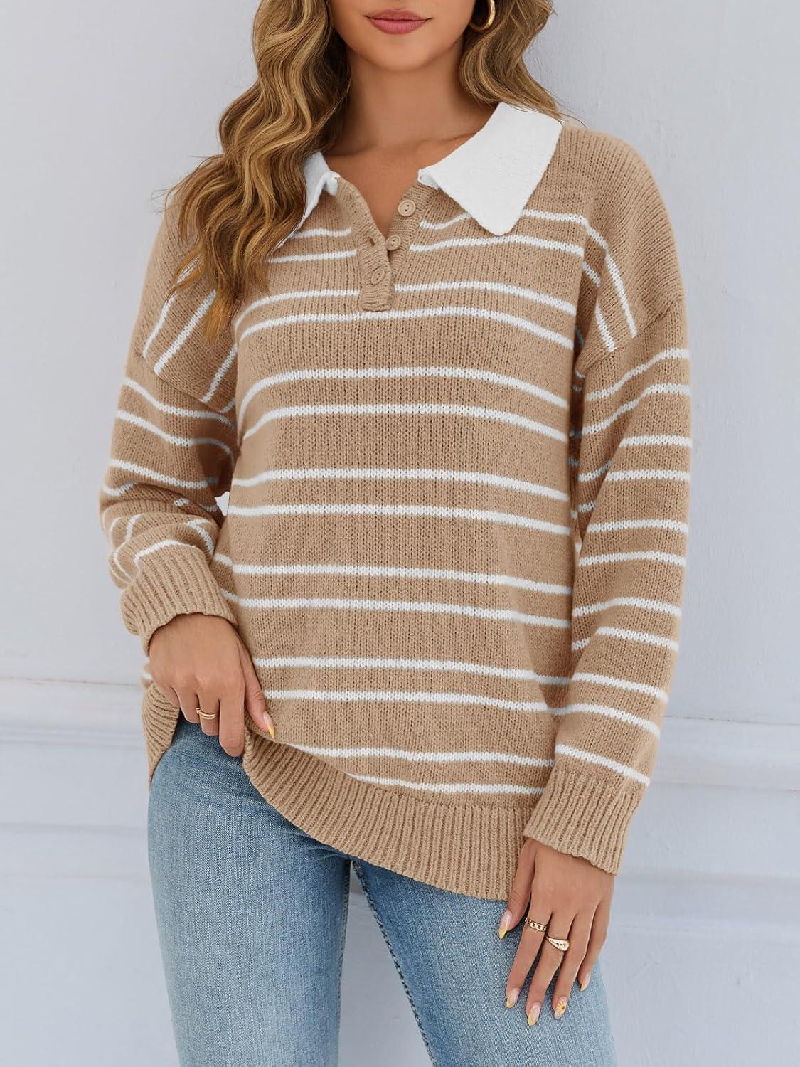 Saodimallsu Womens Striped Swaters Button Collared Polo Shirts Oversized Long Sleeve Chunky Knit Trendy Pullover Tops(Khaki)