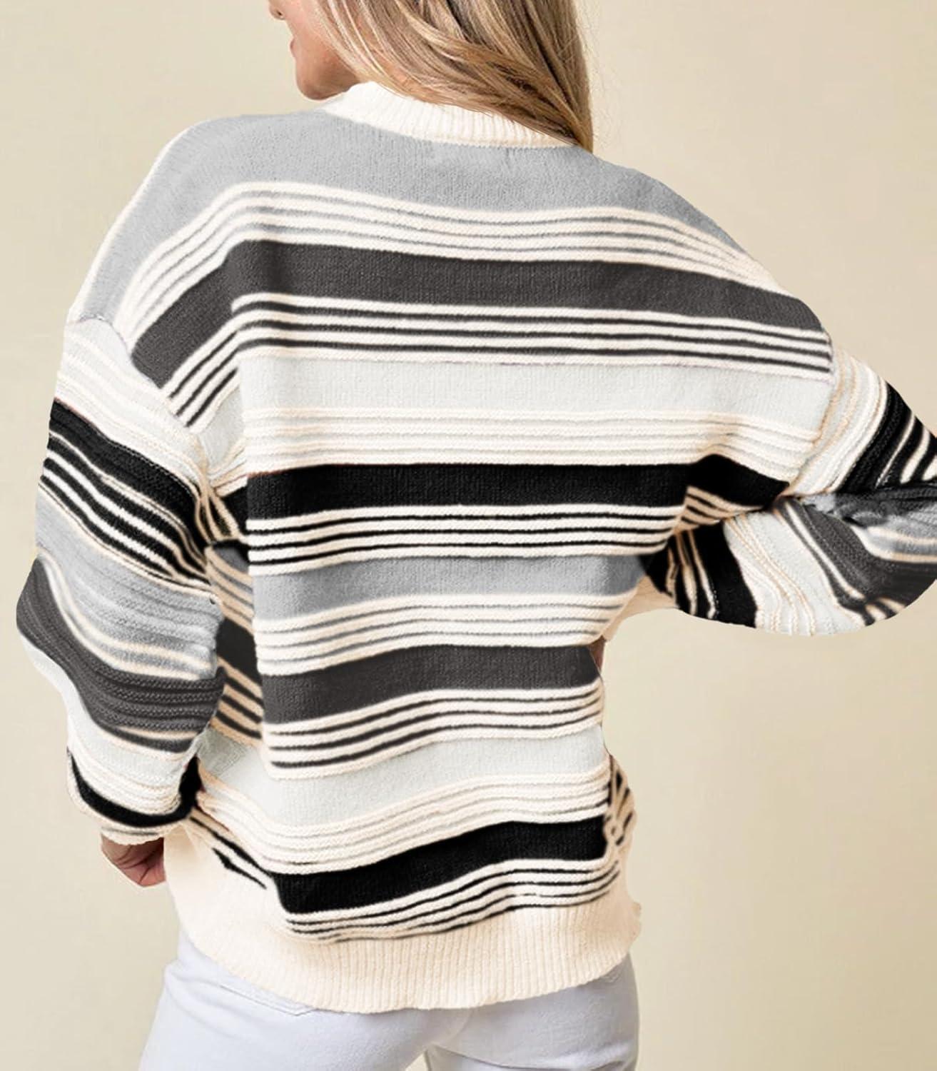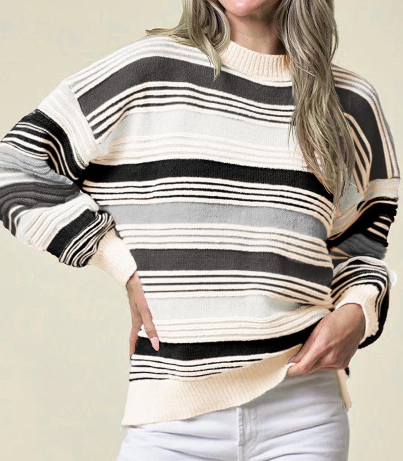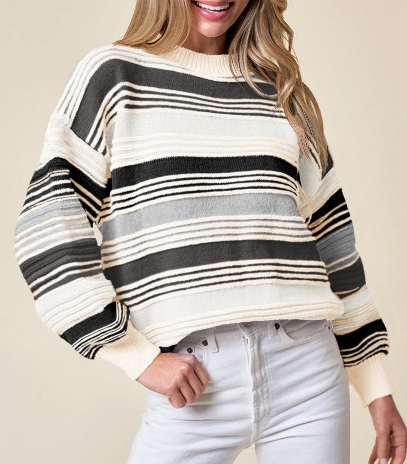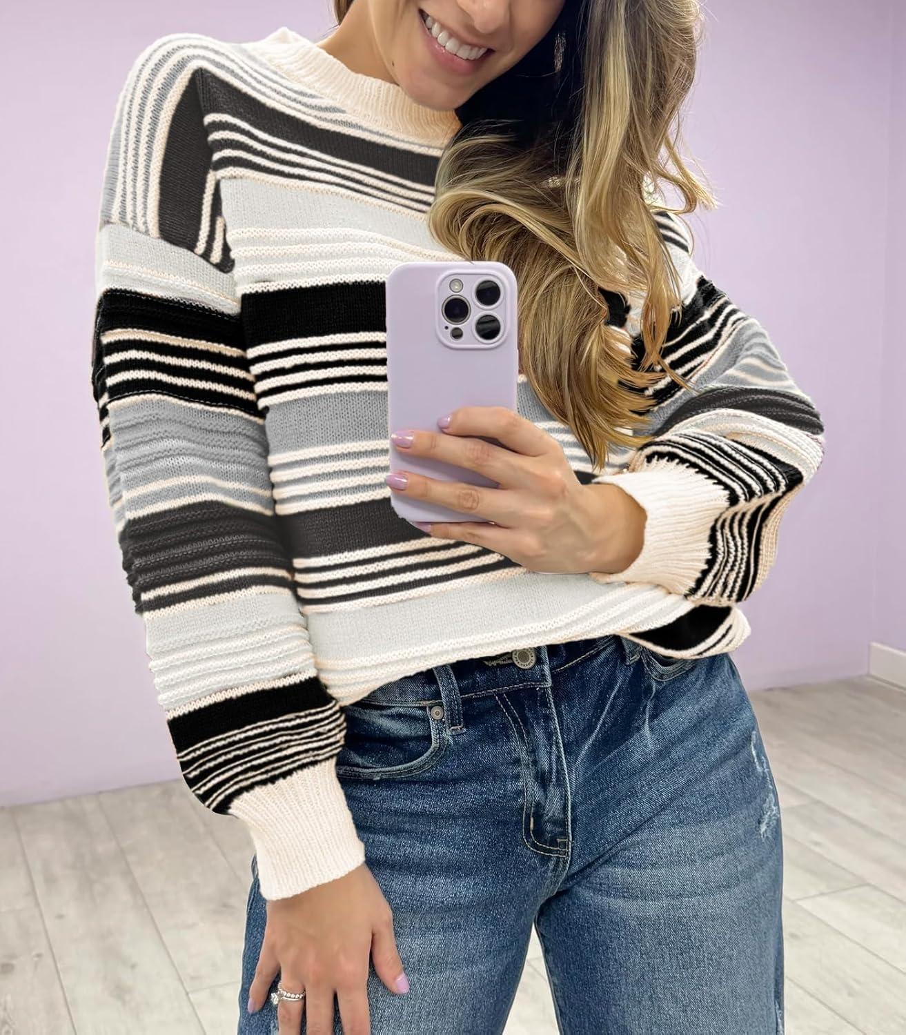 Saodimallsu Womens Striped Sweater Color Block Crew Neck Long Sleeve Fall Colorful Rainbow Knit Loose Pullover Top(Khaki)