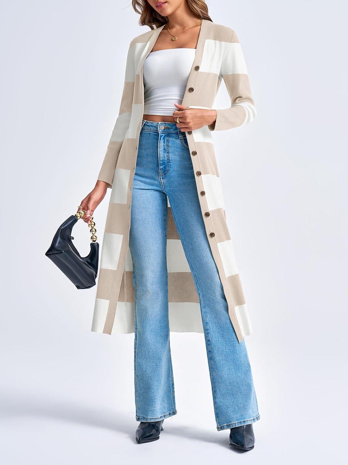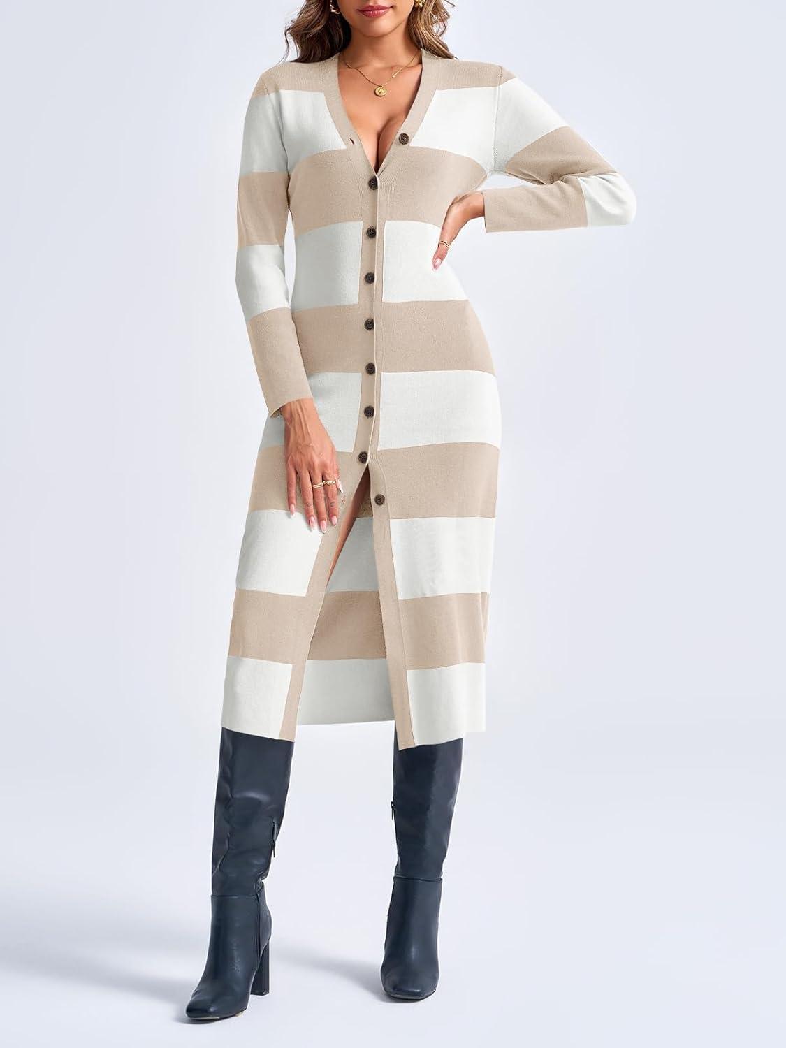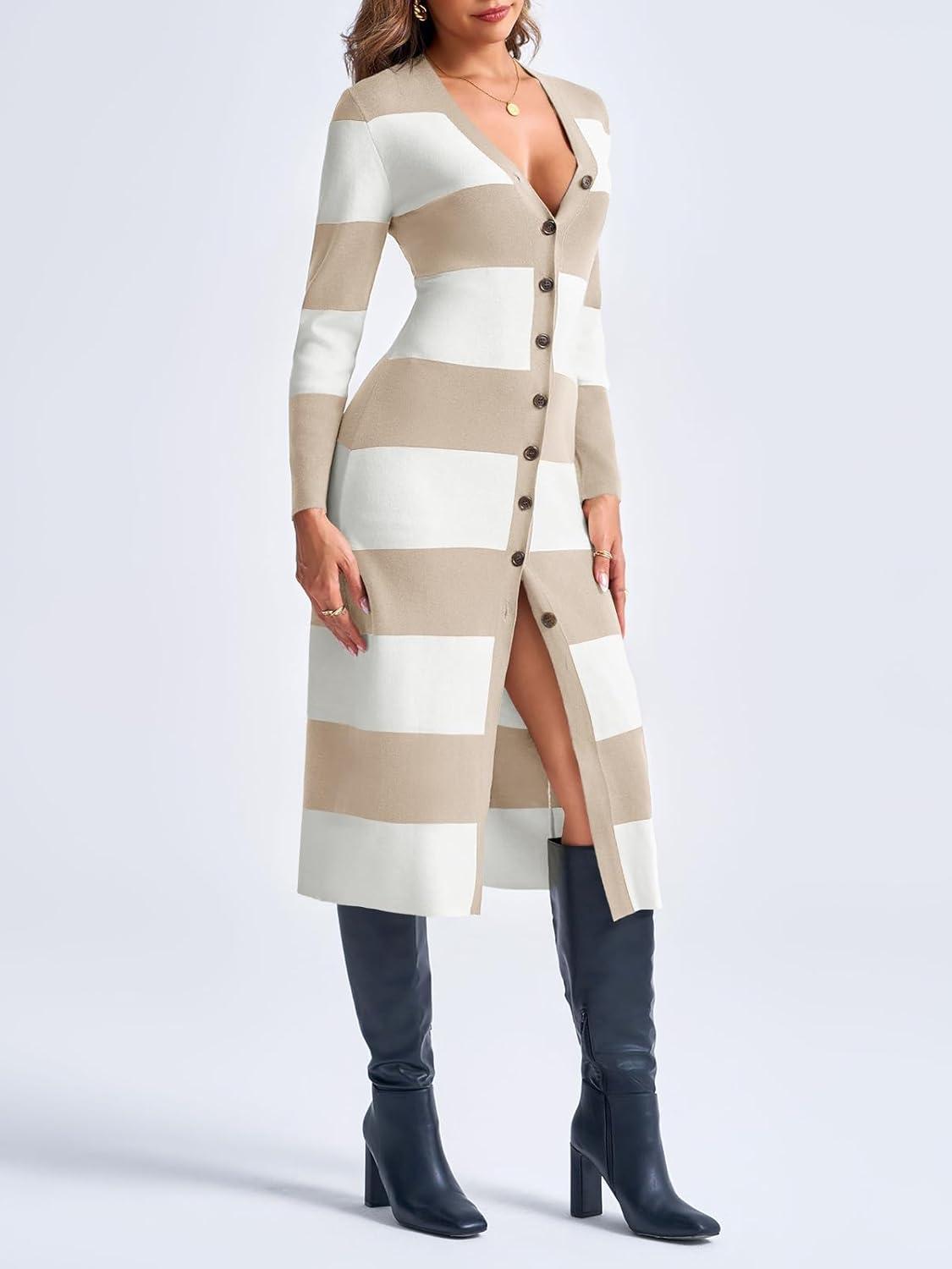 Saodimallsu Womens Striped Sweater Dress Button V Neck Long Sleeve Knit Fall Trendy Bodycon Midi Dresses Cardigans(Apricot)