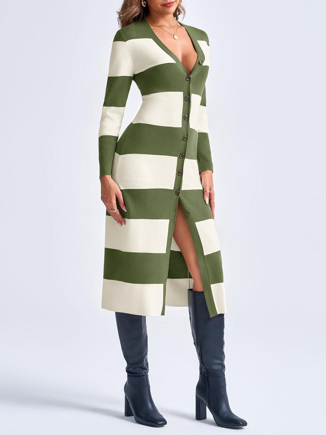 Saodimallsu Womens Striped Sweater Dress Button V Neck Long Sleeve Knit Fall Trendy Bodycon Midi Dresses Cardigans(Army Green)