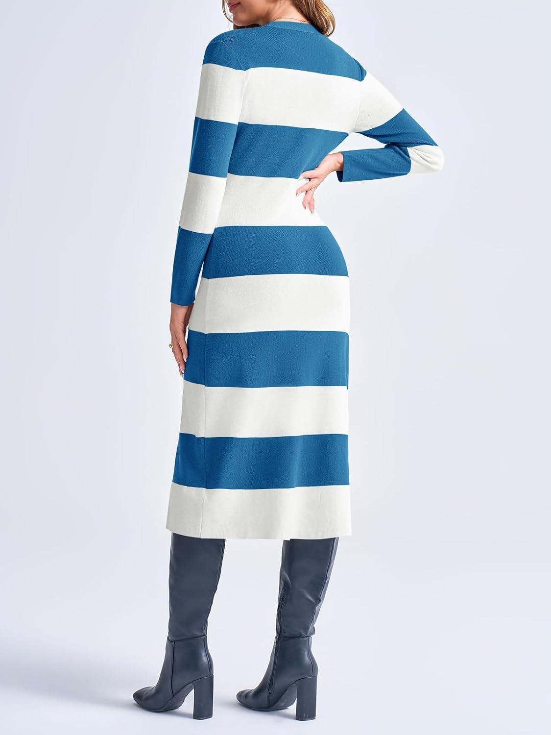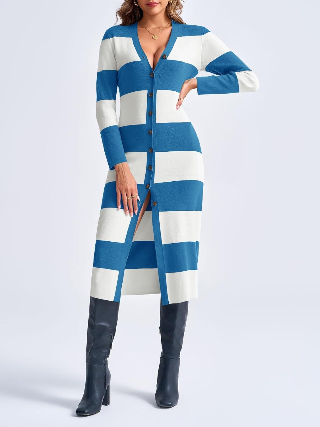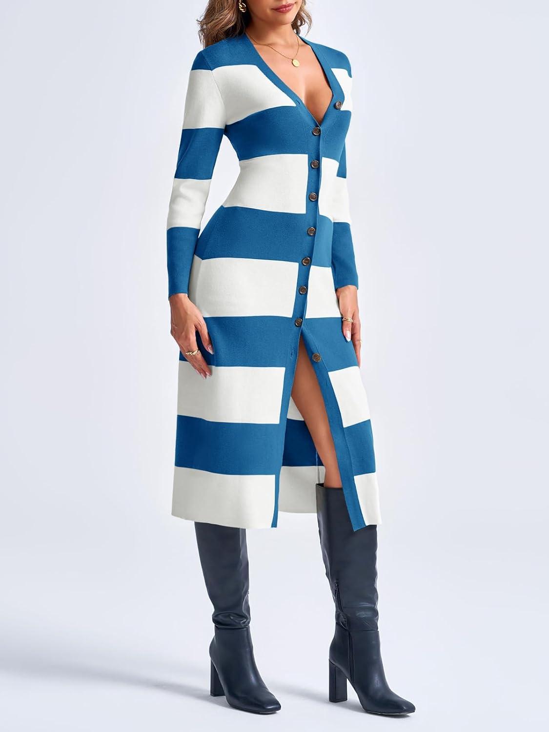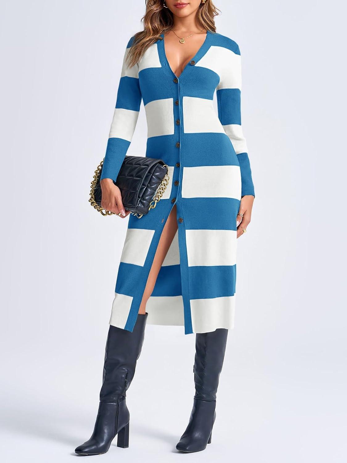 Saodimallsu Womens Striped Sweater Dress Button V Neck Long Sleeve Knit Fall Trendy Bodycon Midi Dresses Cardigans(Blue)