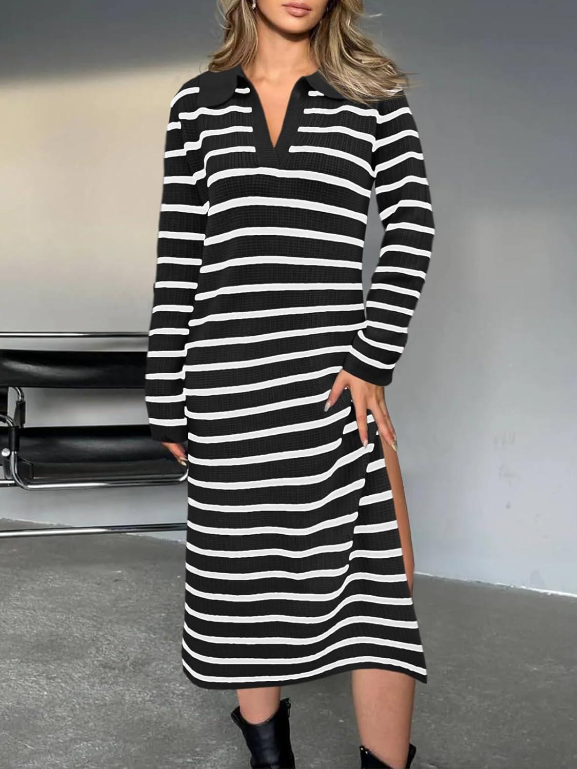 Saodimallsu Womens Striped Sweater Dress Fall Chunky Knit V Neck Collared Long Sleeve Sexy Slit Loose Midi Dresses(Black)