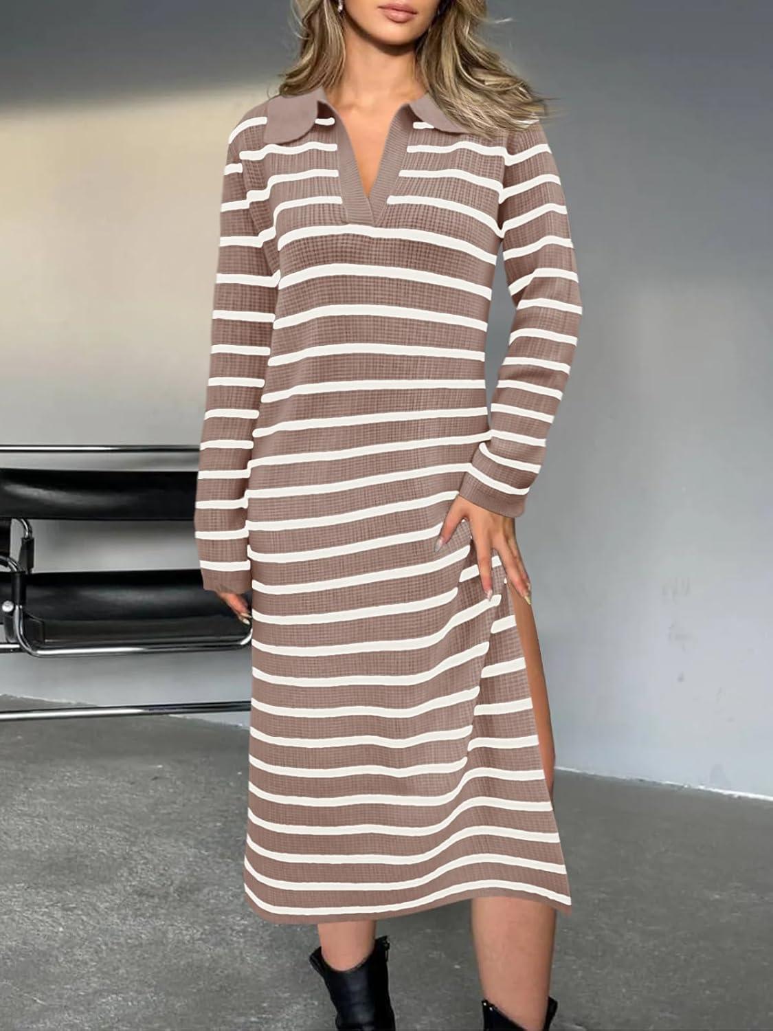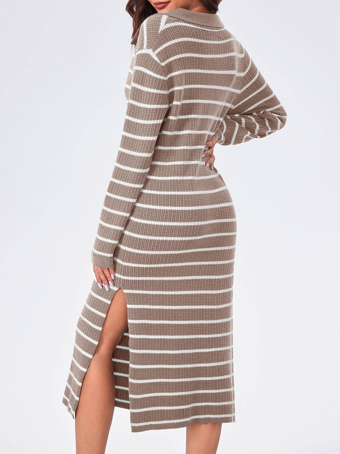 Saodimallsu Womens Striped Sweater Dress Fall Chunky Knit V Neck Collared Long Sleeve Sexy Slit Loose Midi Dresses(Light Khaki)