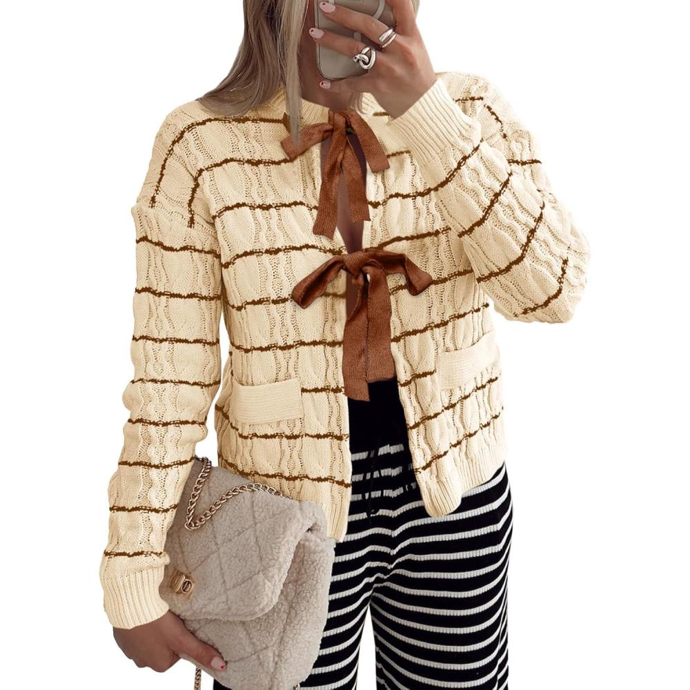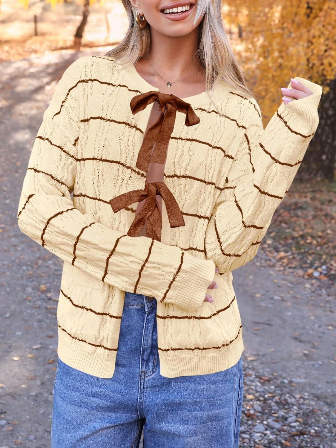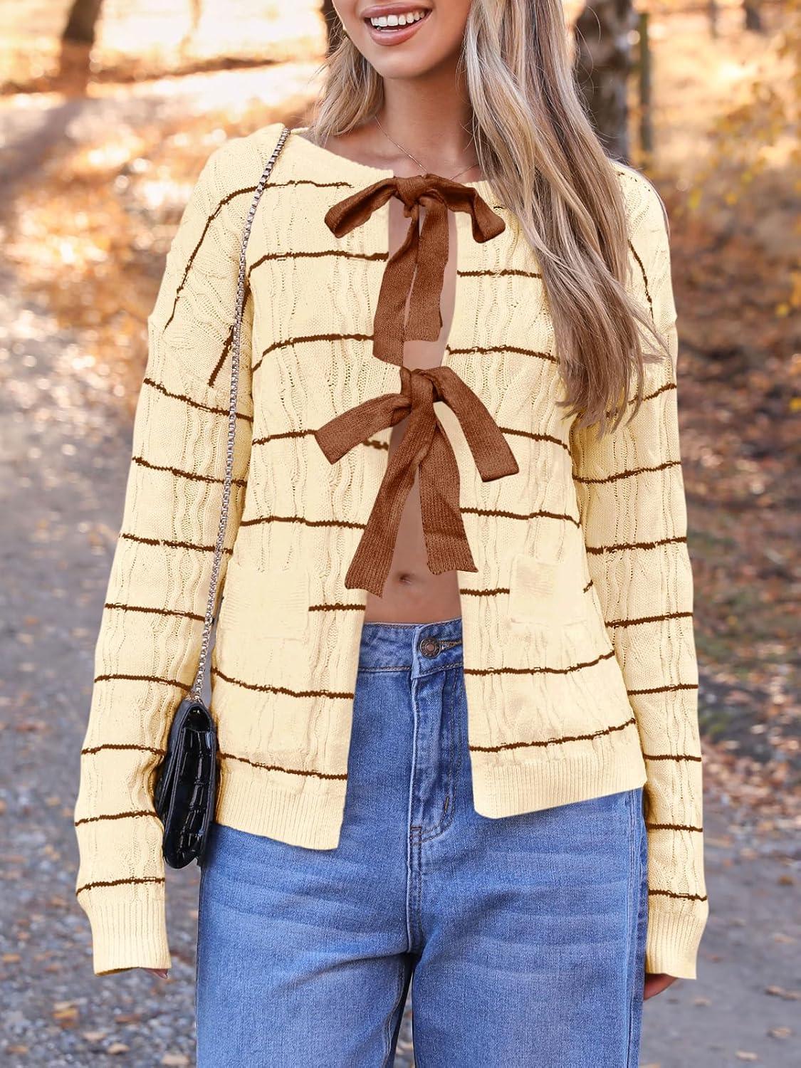 Saodimallsu Womens Striped Tie Front Cardigan Sweaters Crew Neck Long Sleeve Cable Knit Bow Knot Trendy Sweater Tops(Beige Yellow)