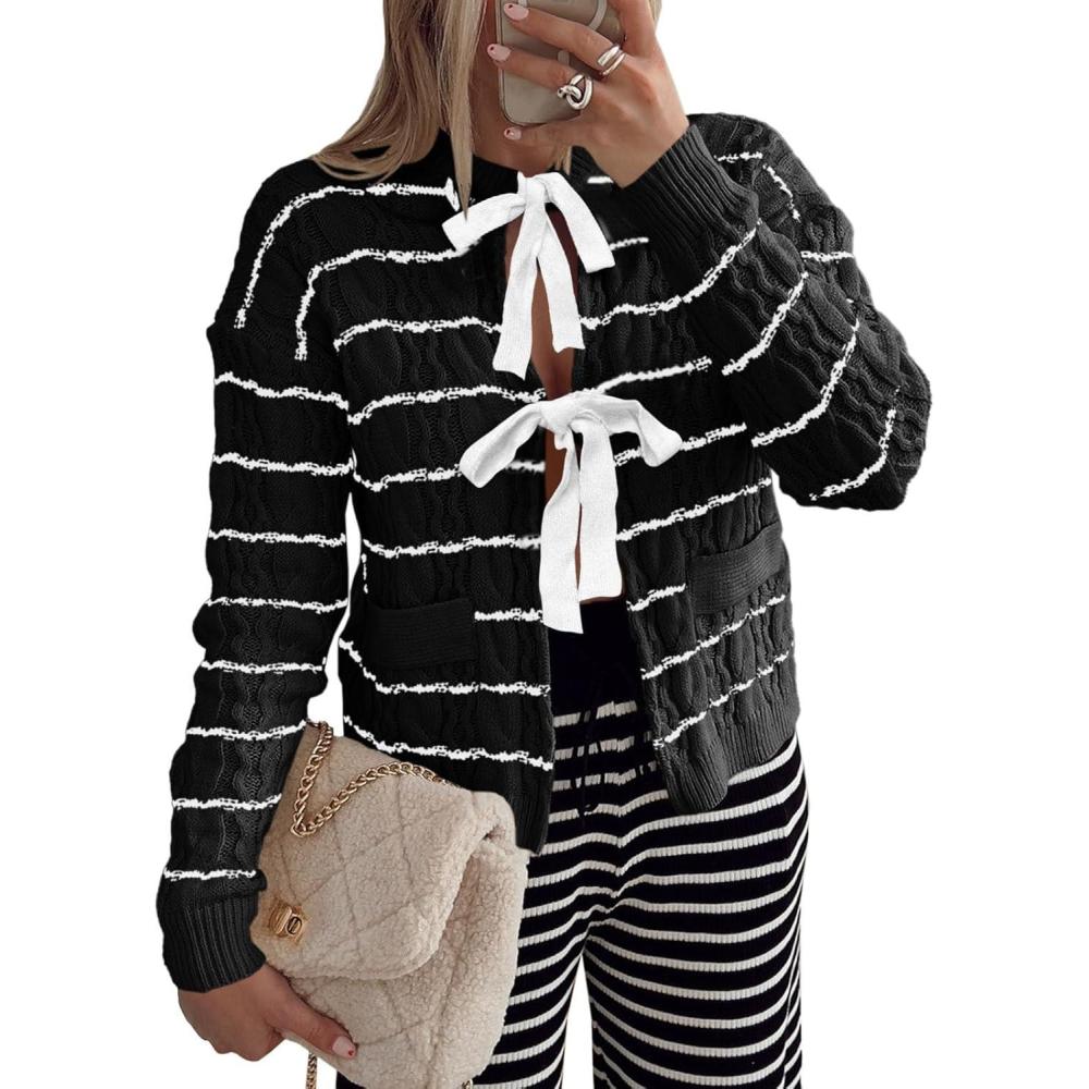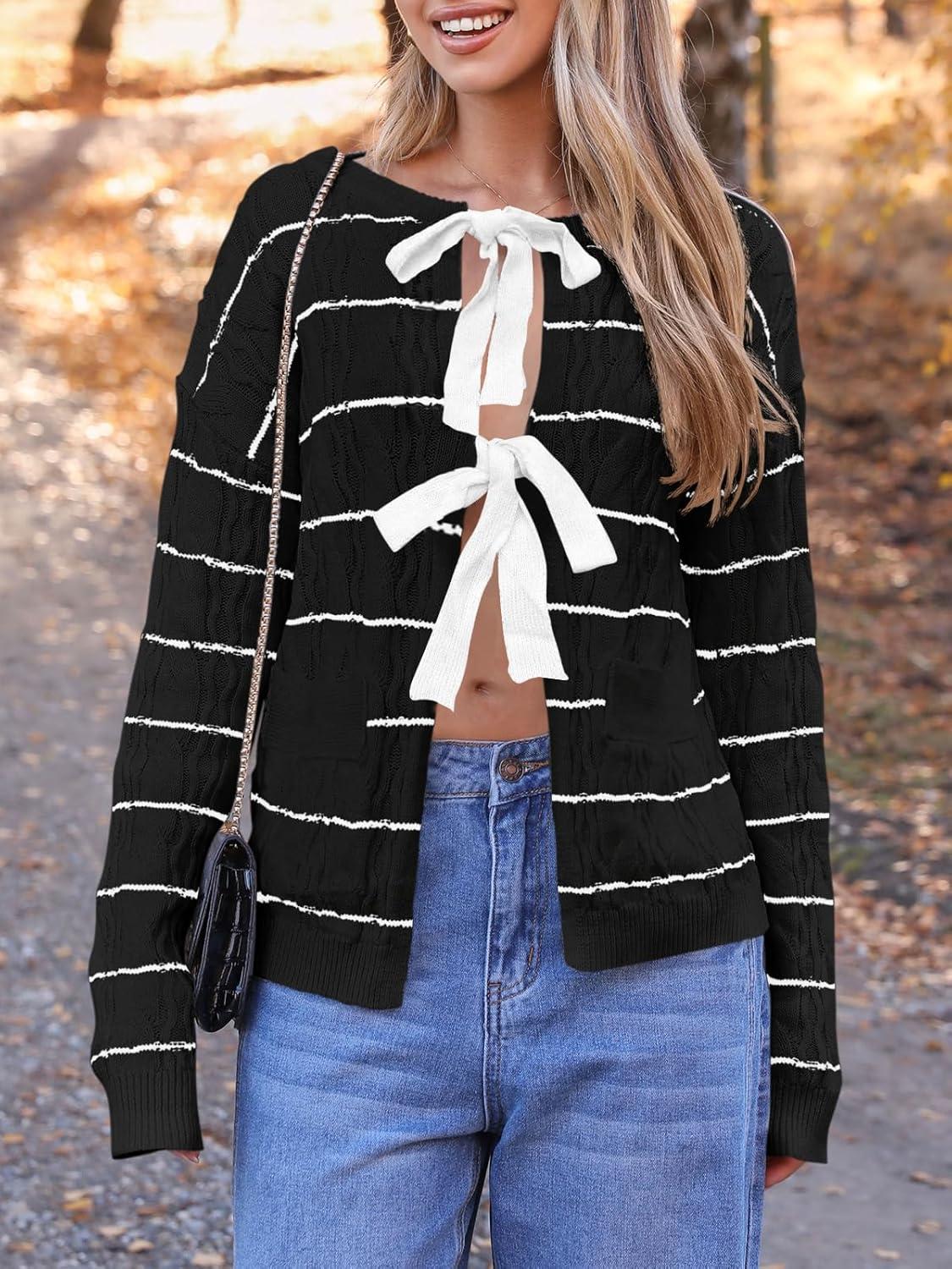 Saodimallsu Womens Striped Tie Front Cardigan Sweaters Crew Neck Long Sleeve Cable Knit Bow Knot Trendy Sweater Tops(Black)