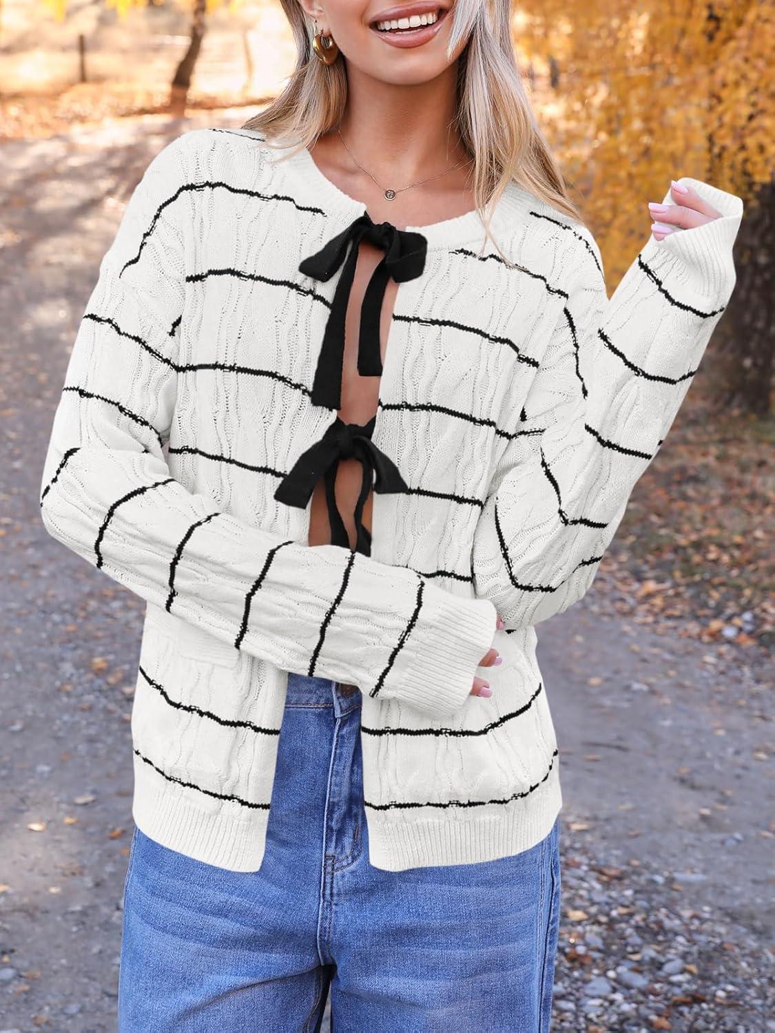 Saodimallsu Womens Striped Tie Front Cardigan Sweaters Crew Neck Long Sleeve Cable Knit Bow Knot Trendy Sweater Tops(White)