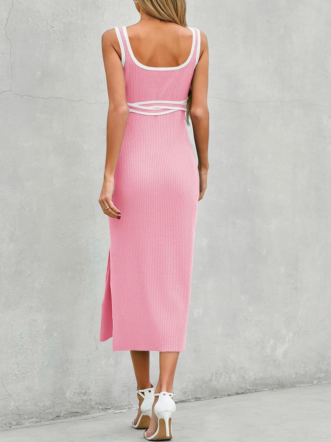 Saodimallsu Womens Summer Bodycon Midi Dress Sleeveless Square Neck Color Block Side Slit Ribbed Knit Sweater Tank Dresses(Pink)