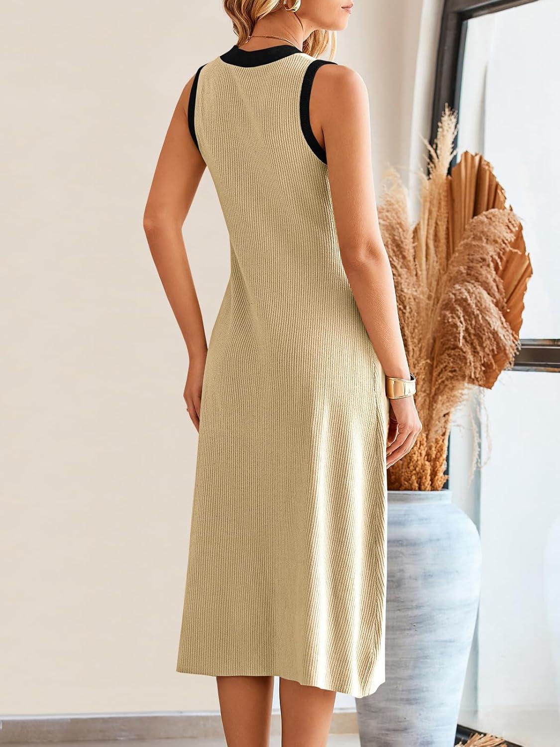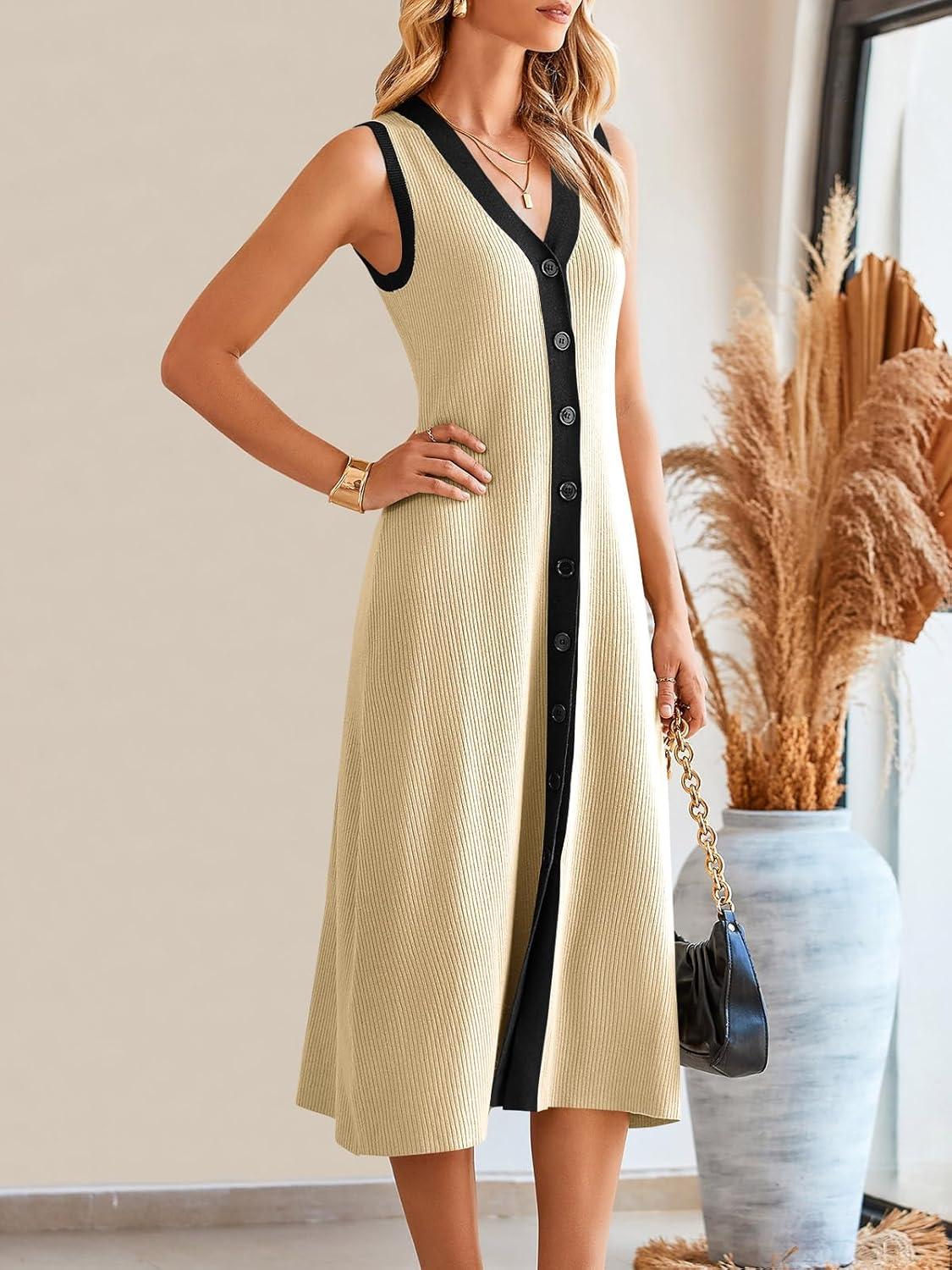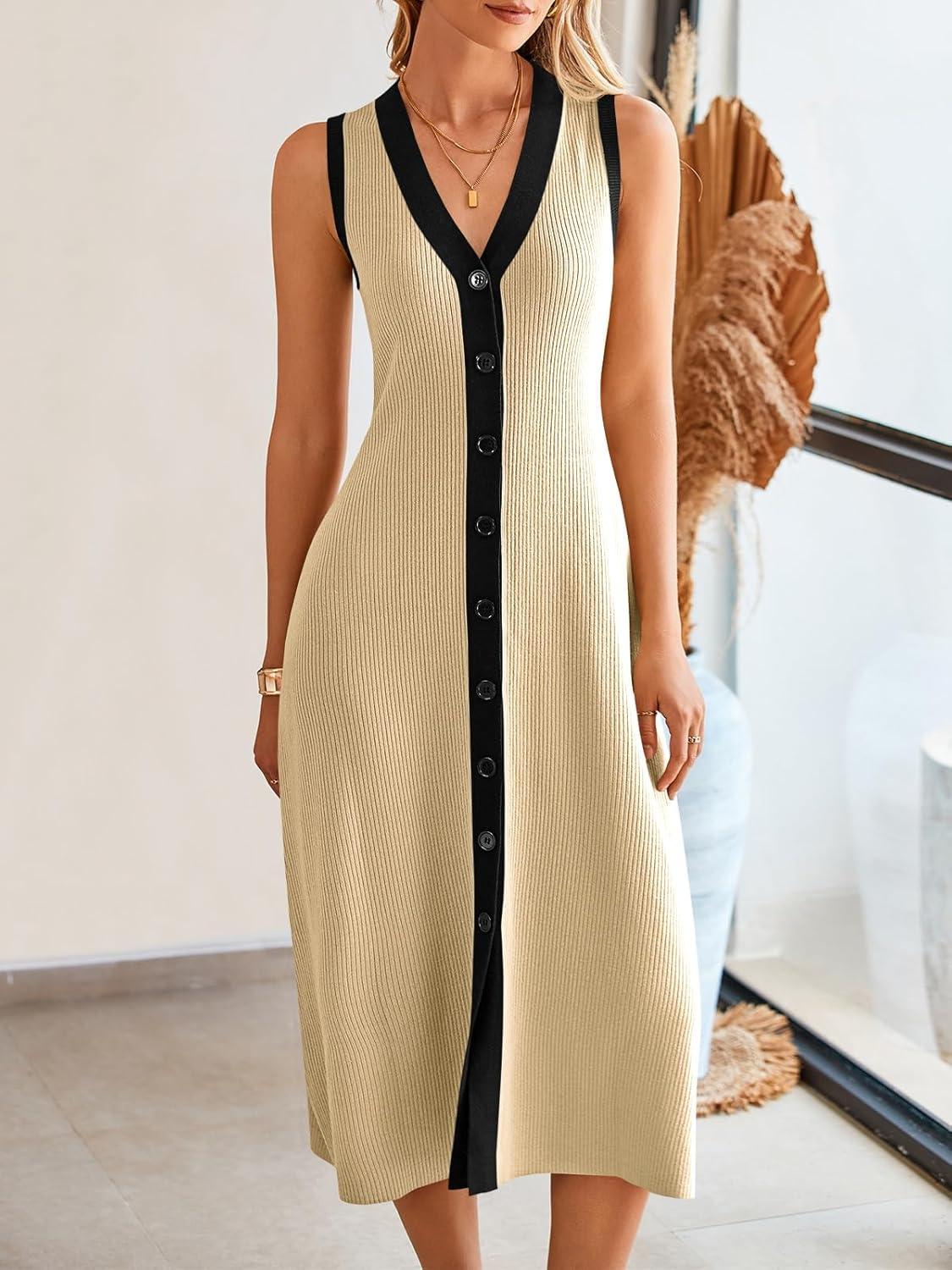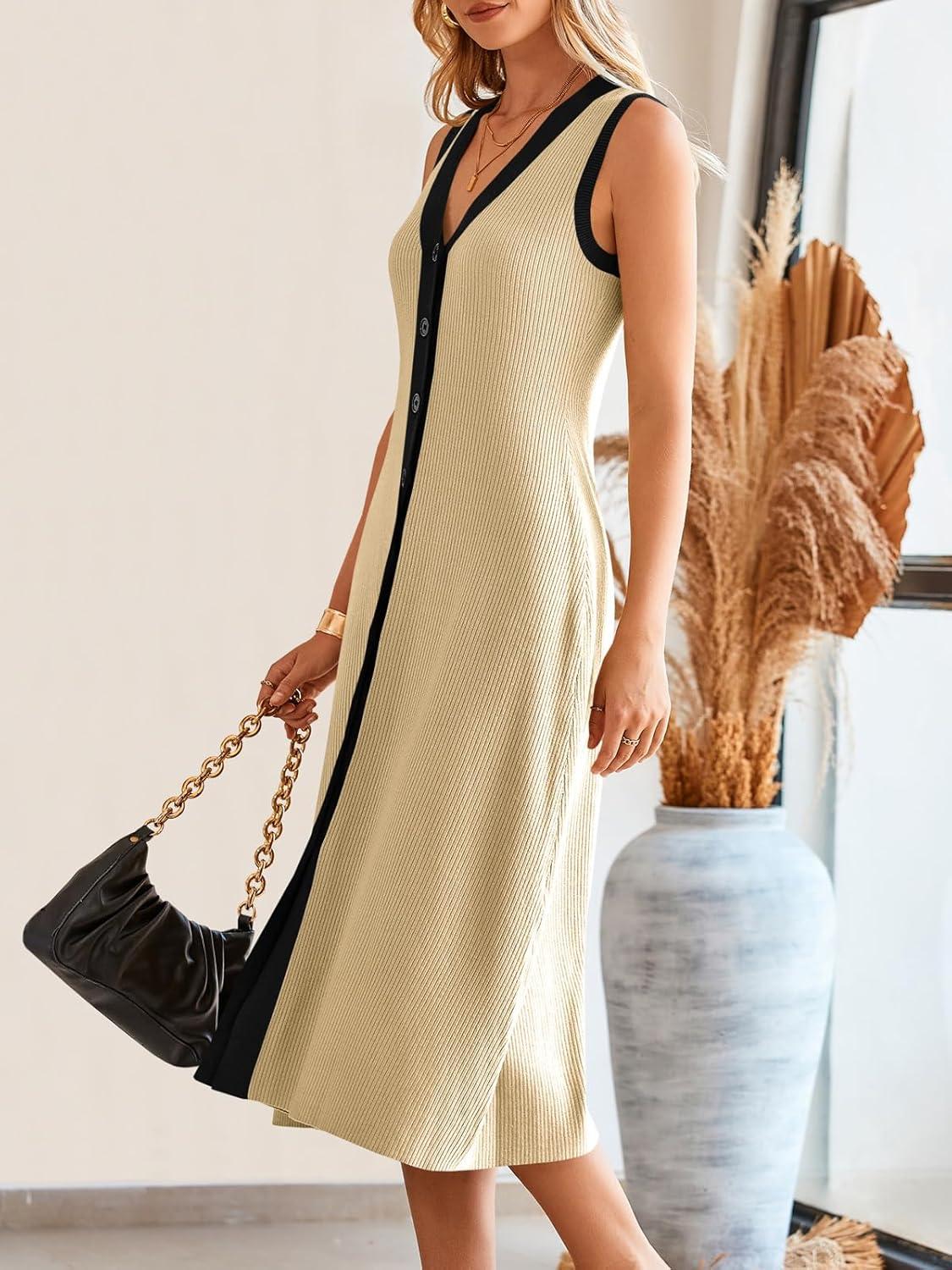 Saodimallsu Womens Summer Button Down Sweater Dresses Sleeveless V Neck Casual Ribbed Knit Color Block Midi Tank Dress(Light Khaki)