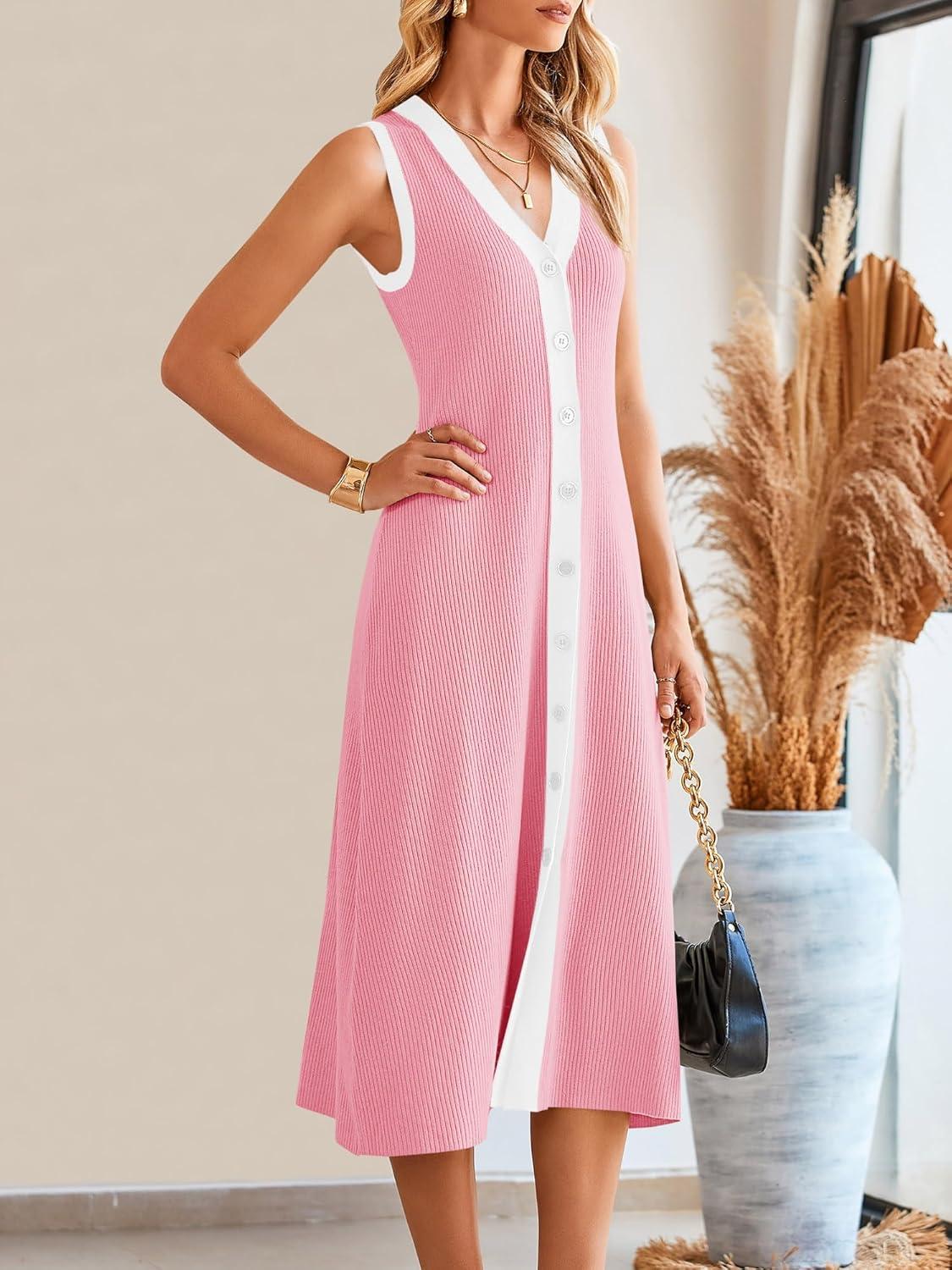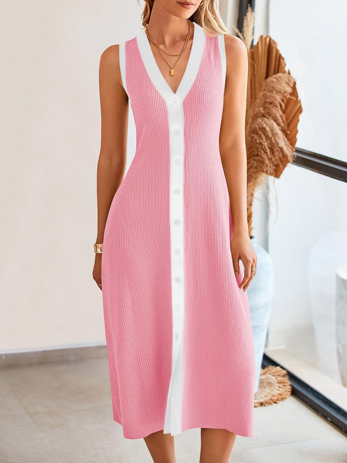 Saodimallsu Womens Summer Button Down Sweater Dresses Sleeveless V Neck Casual Ribbed Knit Color Block Midi Tank Dress(Pink)