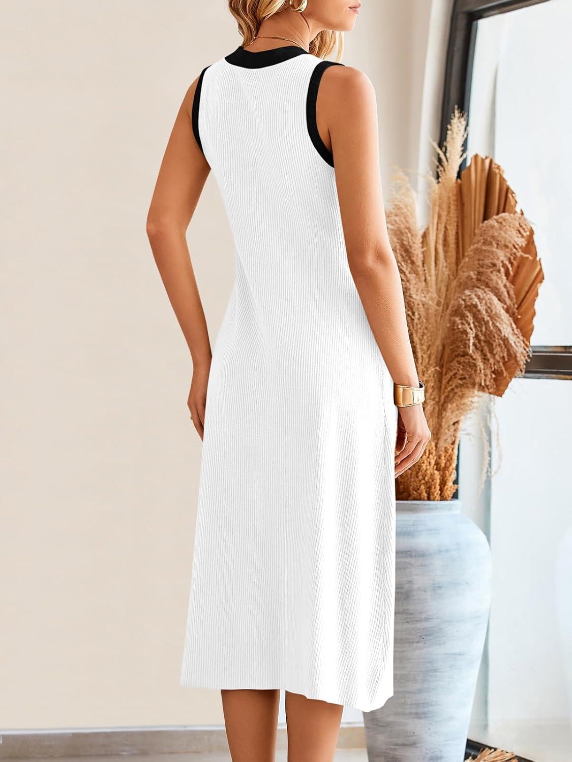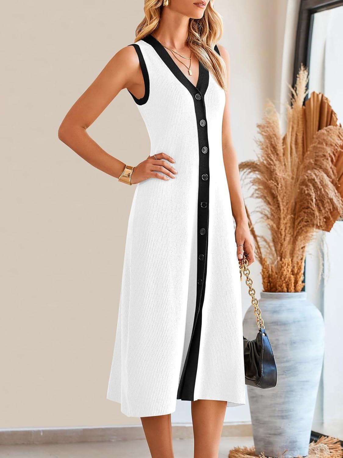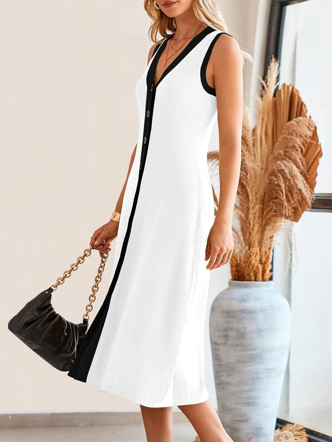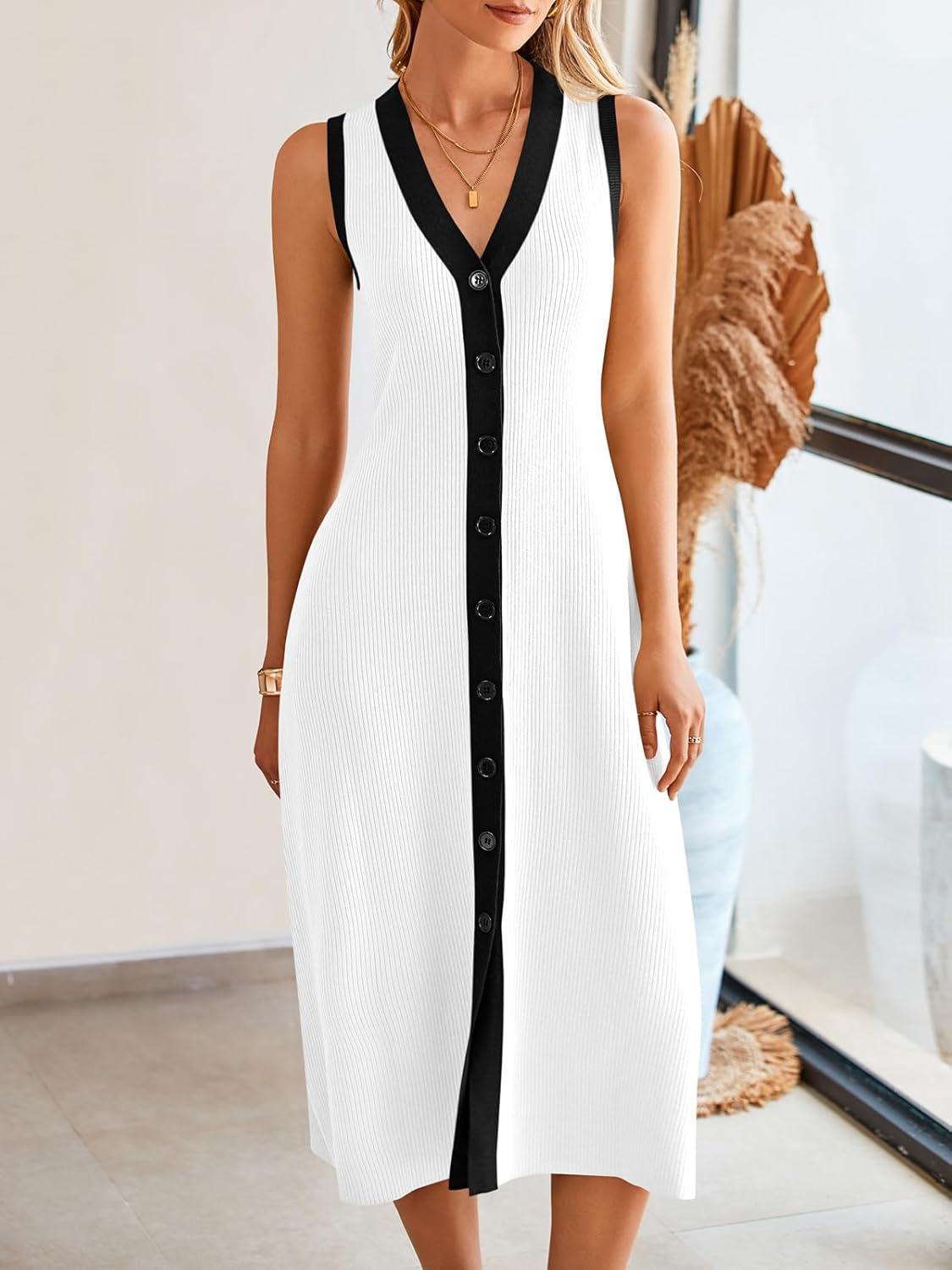 Saodimallsu Womens Summer Button Down Sweater Dresses Sleeveless V Neck Casual Ribbed Knit Color Block Midi Tank Dress(White)