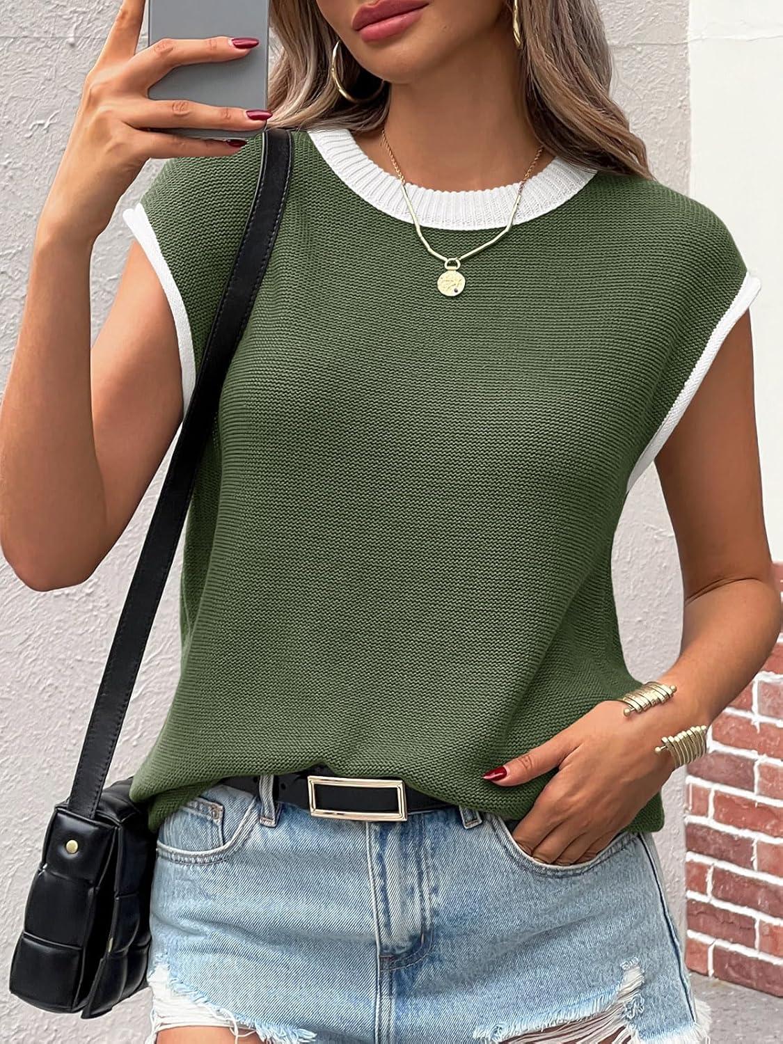 Saodimallsu Womens Summer Cap Sleeve Knit Tops Casual Sleeveless Sweater Vest Crew Neck Color Block 2025 Trendy Tank Top(Army Green)