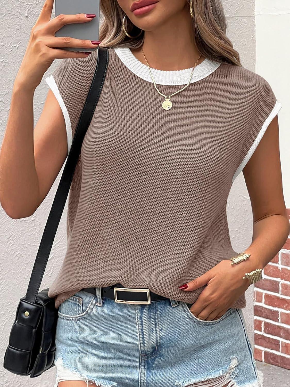 Saodimallsu Womens Summer Cap Sleeve Knit Tops Casual Sleeveless Sweater Vest Crew Neck Color Block 2025 Trendy Tank Top(Dark Khaki)