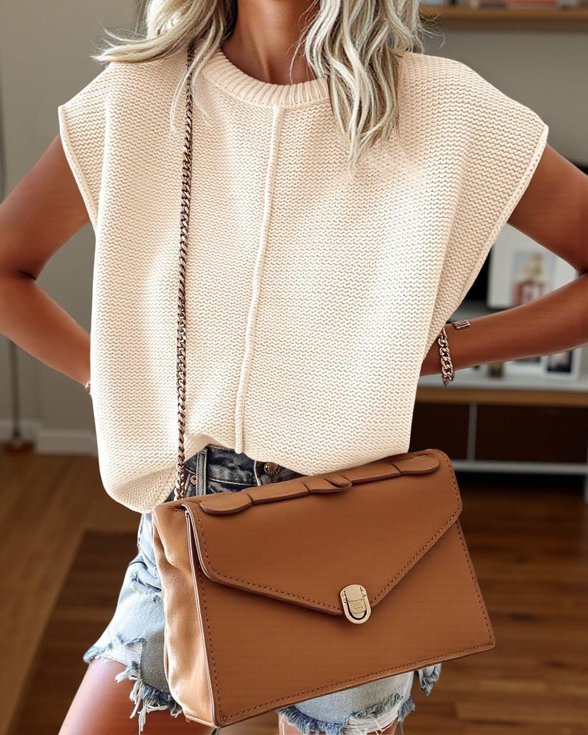 Saodimallsu Womens Summer Cap Sleeve Tops Casual Crew Neck Loose Fit Knit Lightweight Sweater Pullover Top(Apricot)